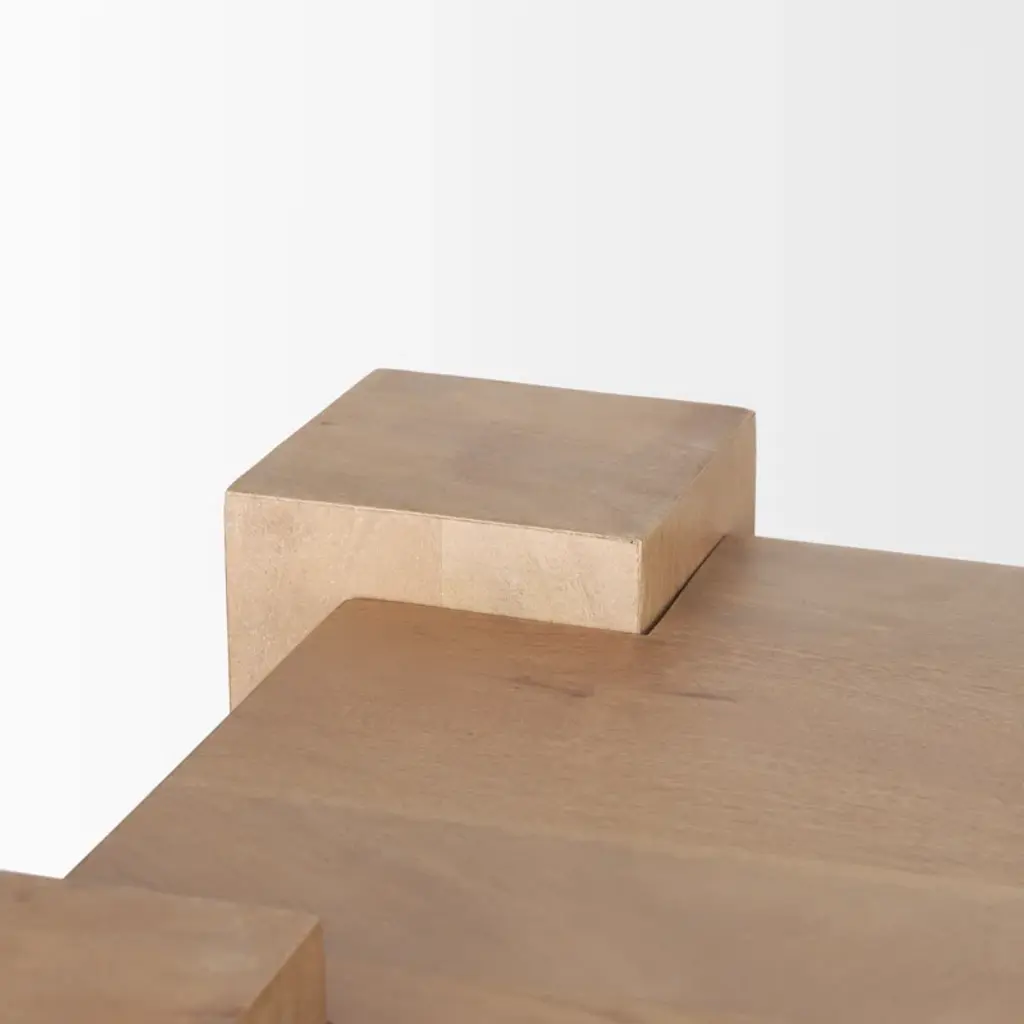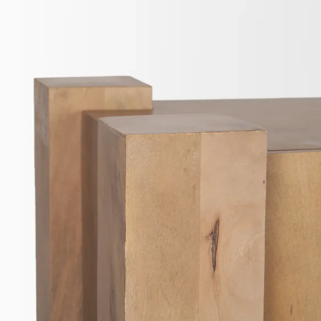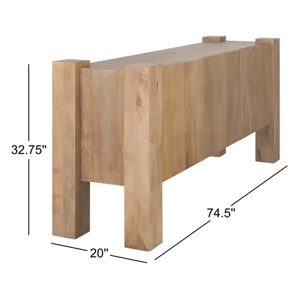 The Wynda sideboard is skillfully constructed from durable mango wood and features a rectangular form, supported by four square post-like legs, subtly elevated for a distinctive presence. Enriched with a light brown stain and complemented by nuanced white pickling, Wynda exudes a harmonious blend of durability and sophistication. The sideboard features three seamless cabinet doors that open to two shelves that span the body, one of which is removable, with thoughtful cable cutouts at each end for seamless cable management. A distinguished piece within the Wynda collection