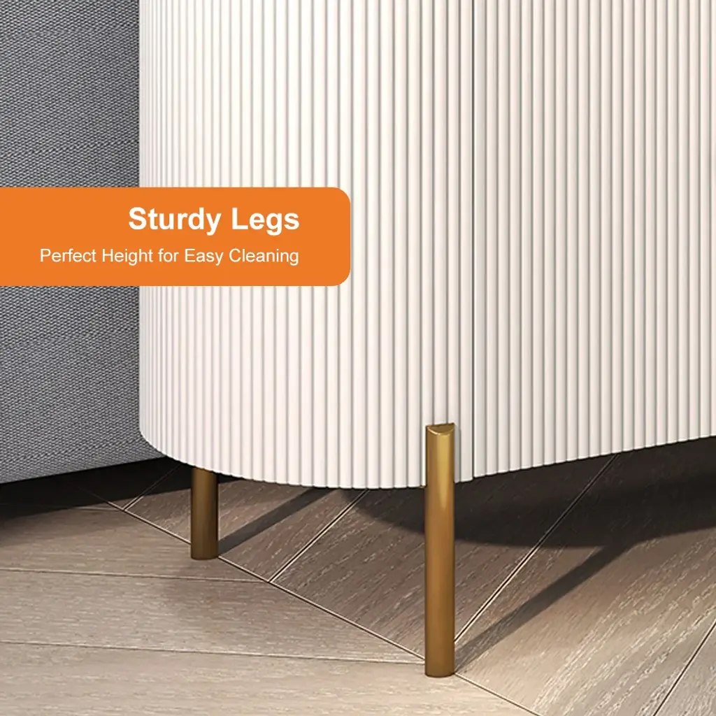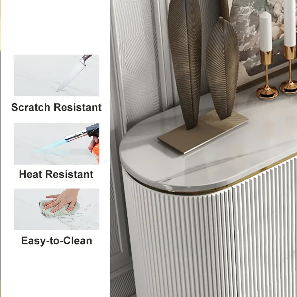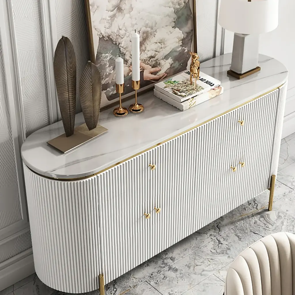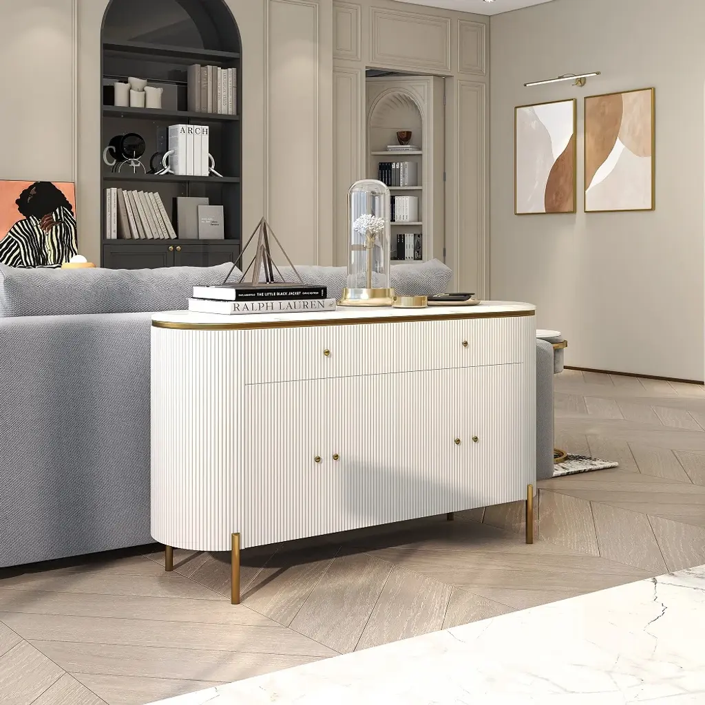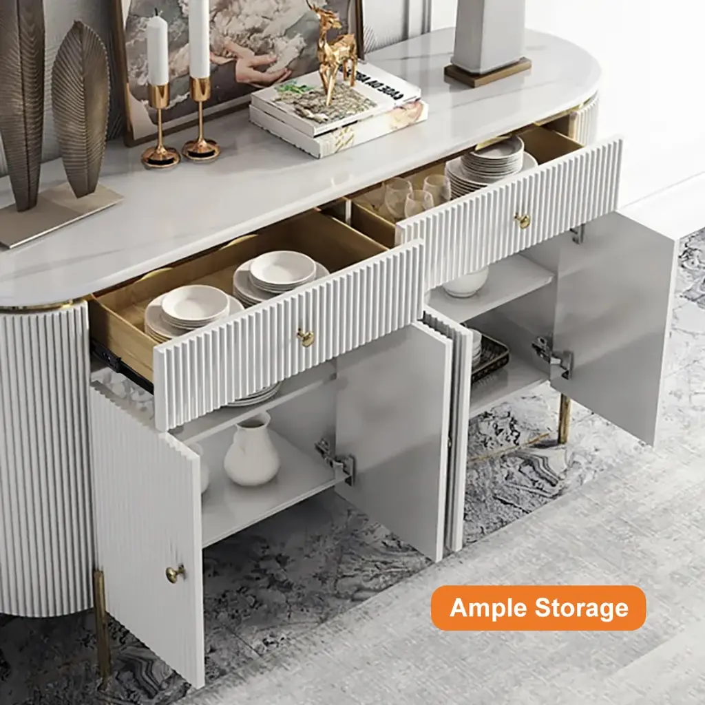 Beautifully designed with an exquisite marble-effect top, wavy surface, and gold-finished legs and handles. It features four doors that reveal four shelves and two drawers, providing ample space to store dining linens, plates, and other kitchenware collections.