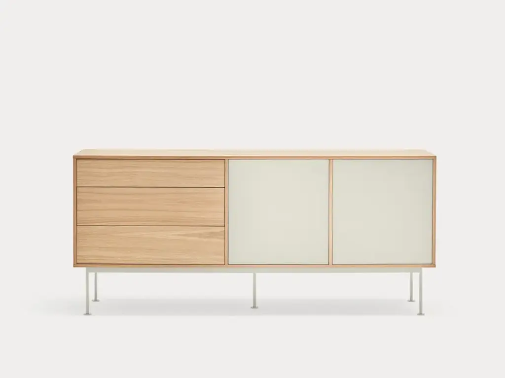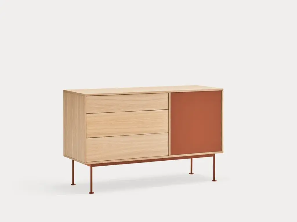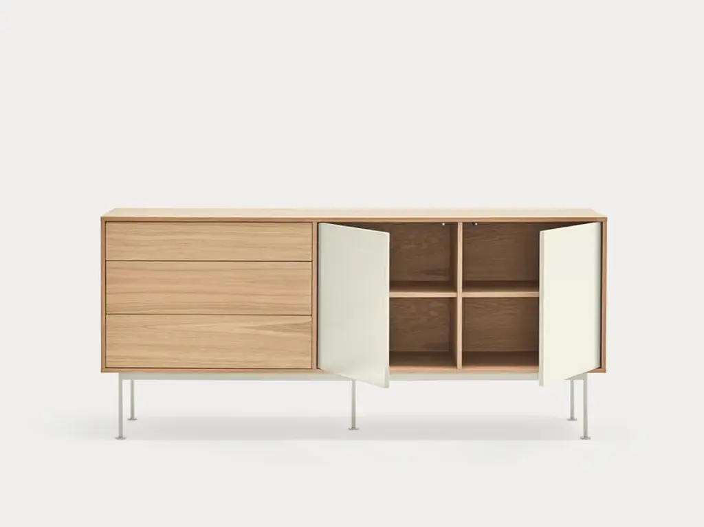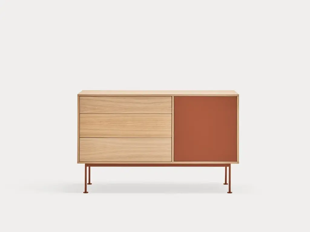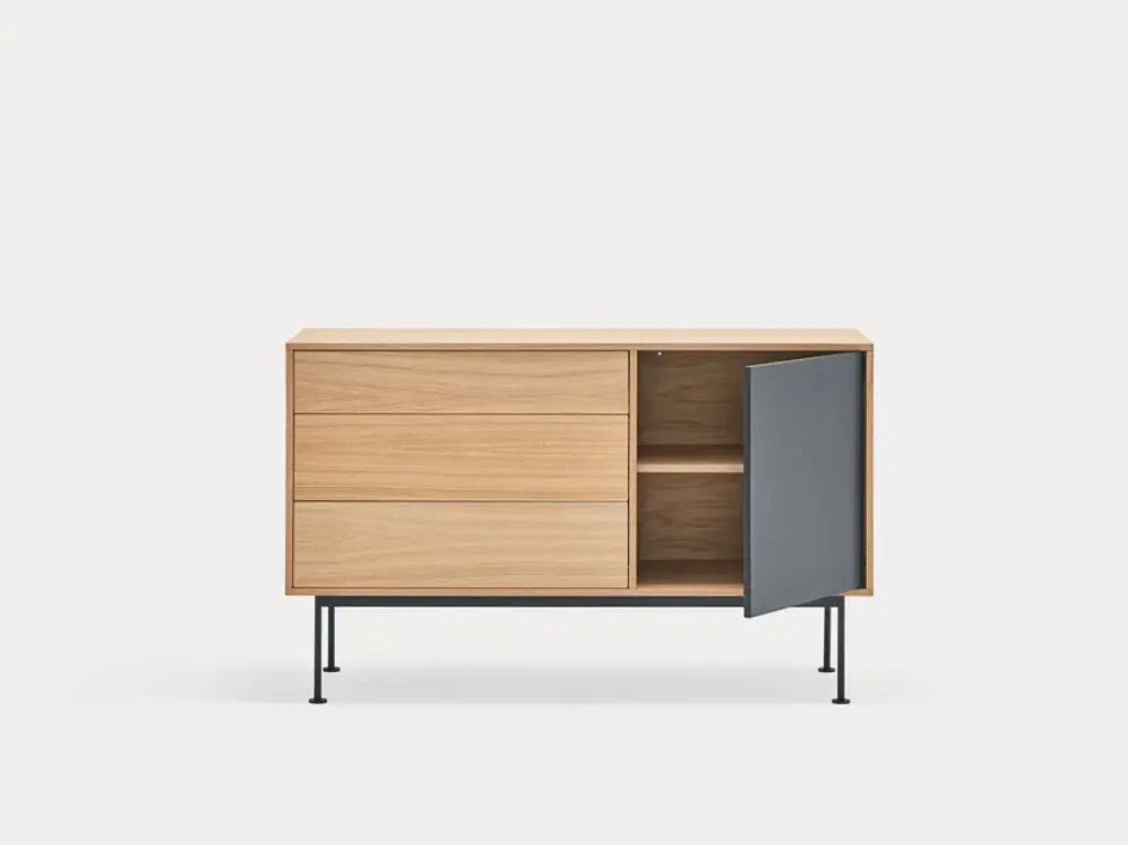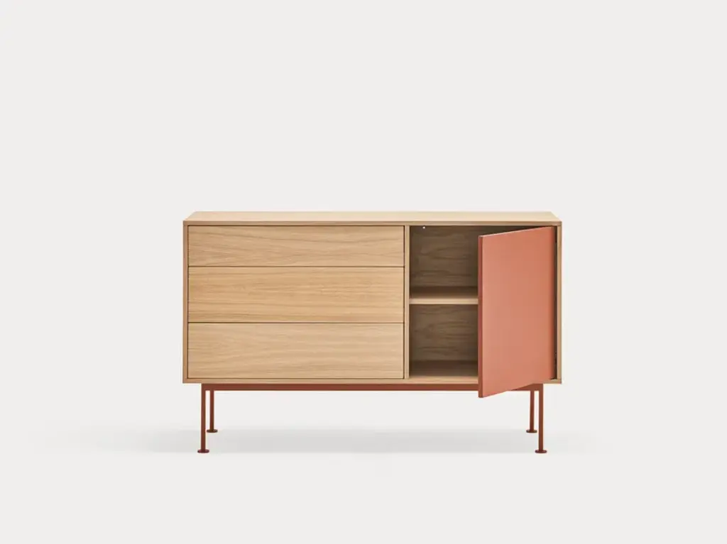 Yoko is an oak veneer sideboard except for some fronts, which are lacquered MDF. The legs are metallic and lacquered with the same colour as the fronts.Yoko is a collection that aims, through its simplicity and versatility, to offer a modern furnishing solution suited to the needs of contemporary homes.Completely veneered in oak, Yoko combines the natural beauty of wood with color accents, making it perfect to fit into different environments.