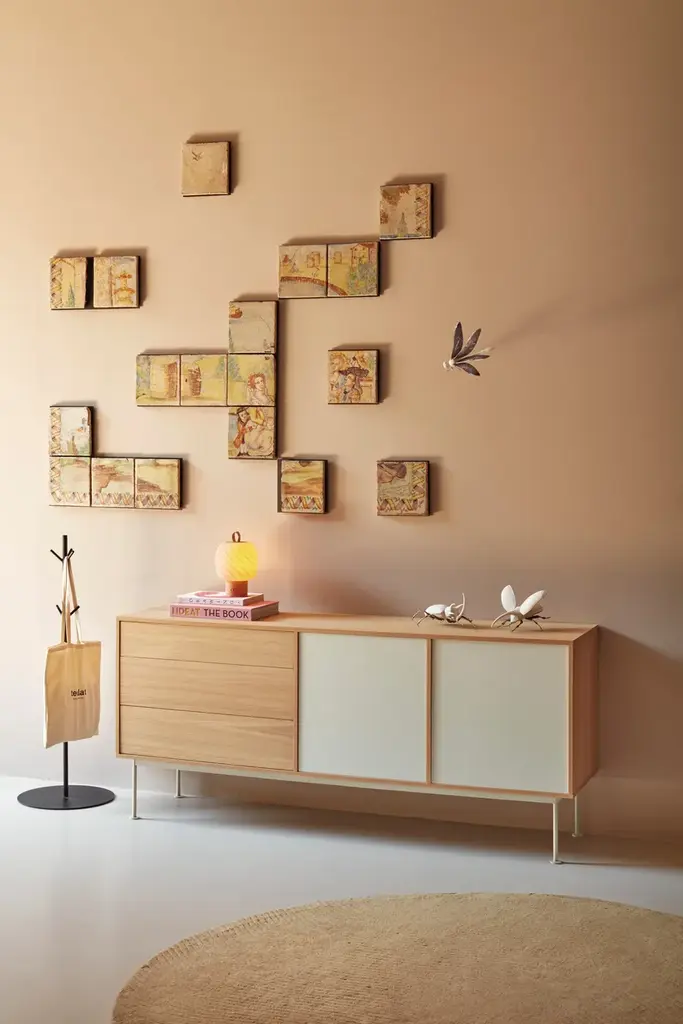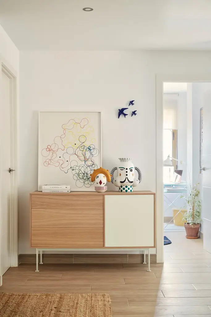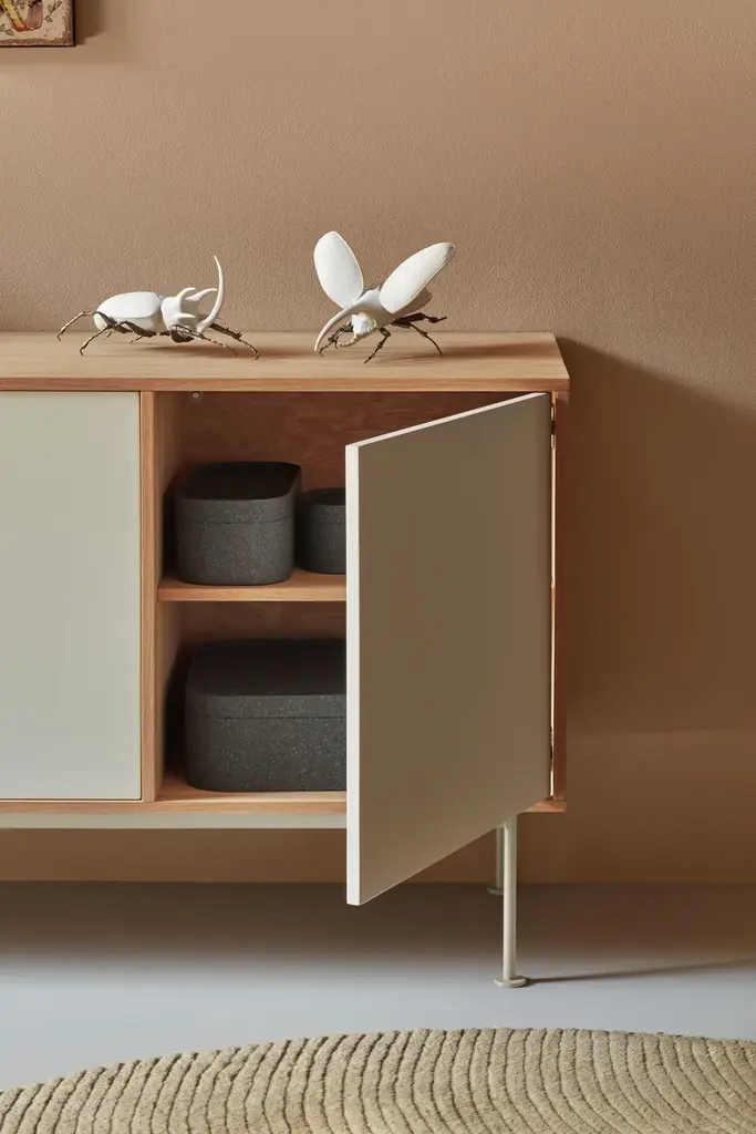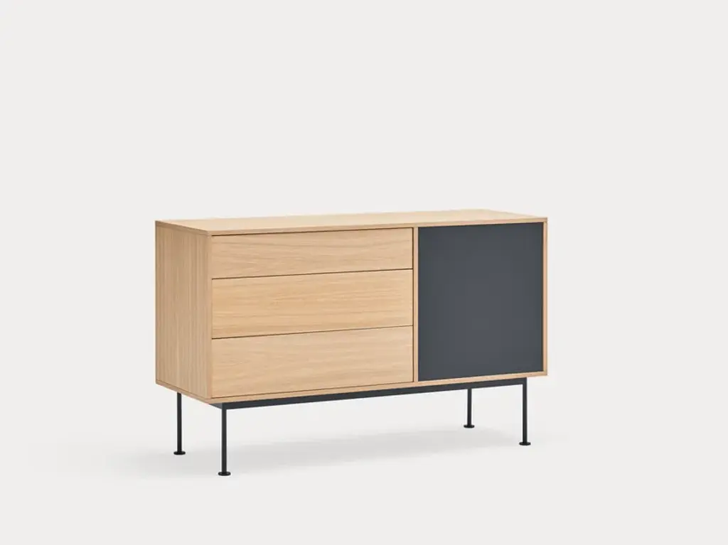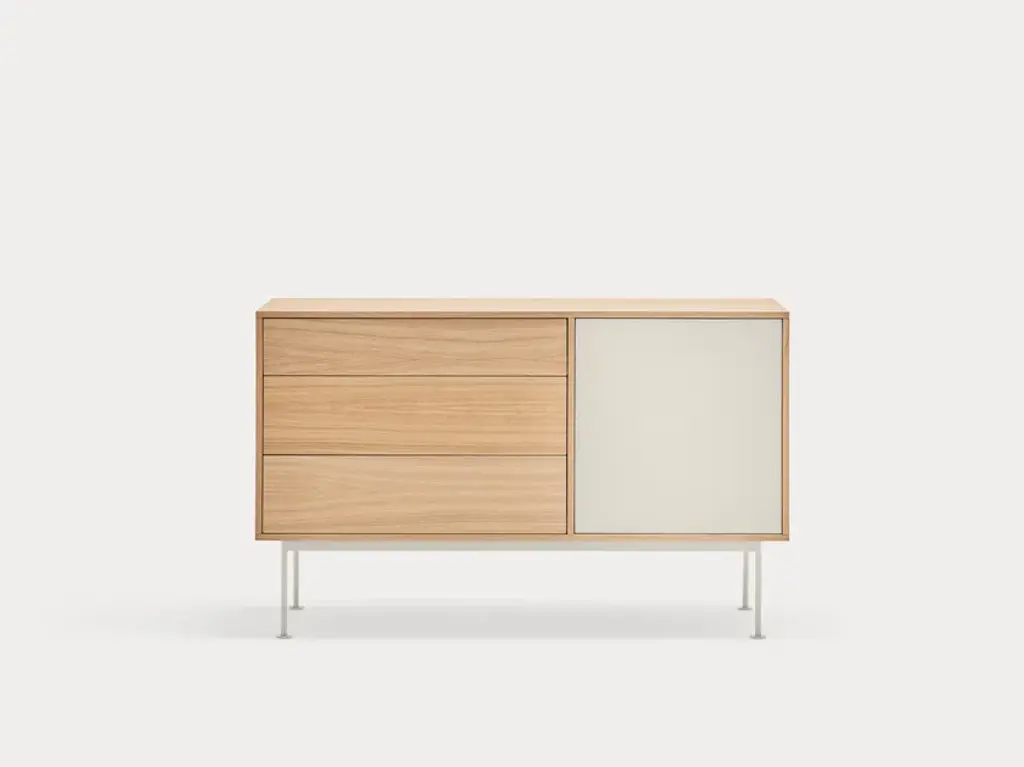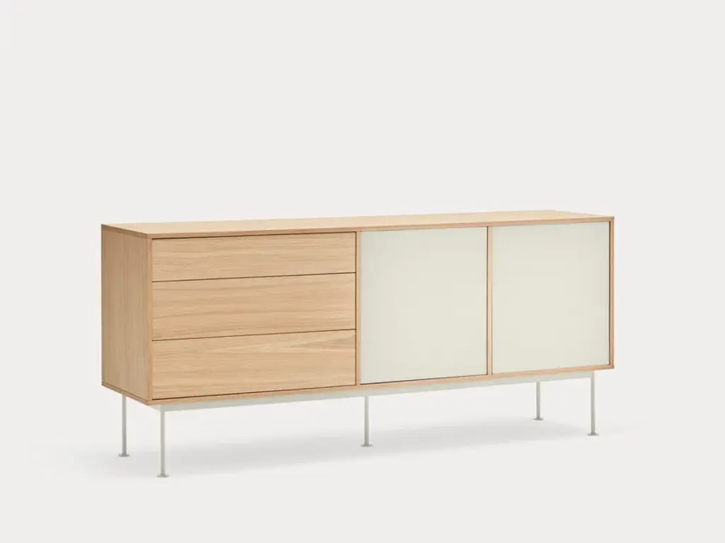 Yoko is an oak veneer sideboard except for some fronts, which are lacquered MDF. The legs are metallic and lacquered with the same colour as the fronts.Yoko is a collection that aims, through its simplicity and versatility, to offer a modern furnishing solution suited to the needs of contemporary homes.Completely veneered in oak, Yoko combines the natural beauty of wood with color accents, making it perfect to fit into different environments.
