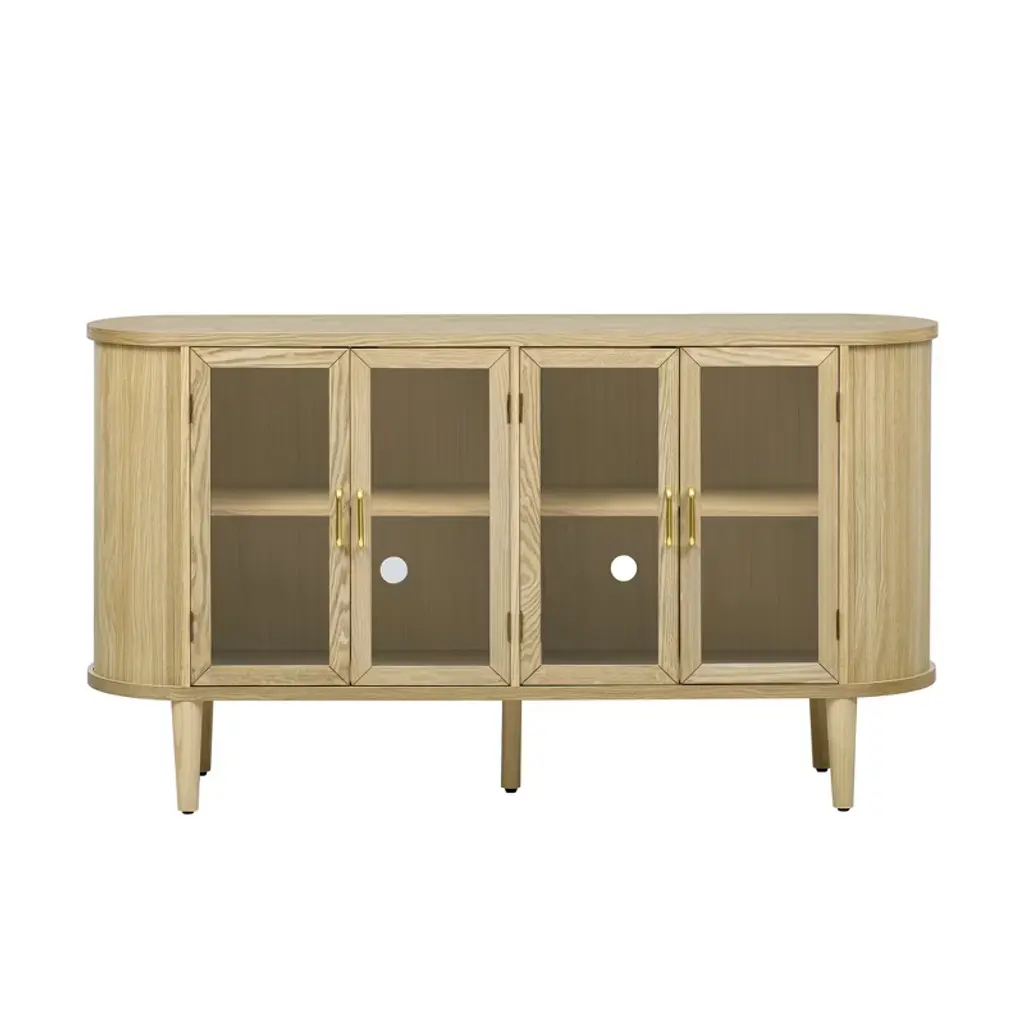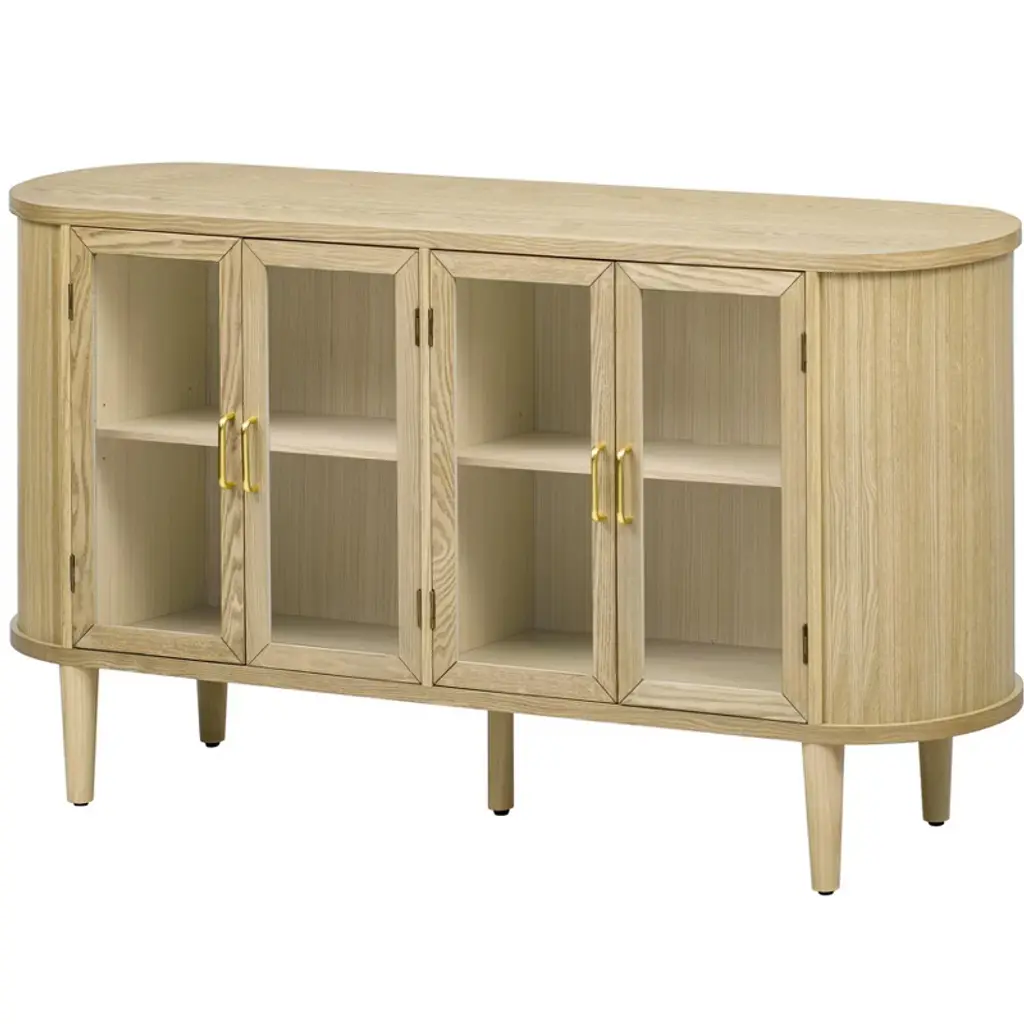 This farmhouse sideboard cabinet combines modern farmhouse style with practical storage solutions. It features a softly curved oval tabletop and fluted side panels, available in matte black or natural wood to complement various decor styles. The cabinet includes four tempered glass doors with magnetic closure for a clear view of your items, and adjustable shelves for customizable storage. Crafted with real wood veneer and solid pine legs, it ensures durability and stability. Perfect for dining rooms, living rooms, or entryways, this sideboard offers both functionality and timeless elegance.