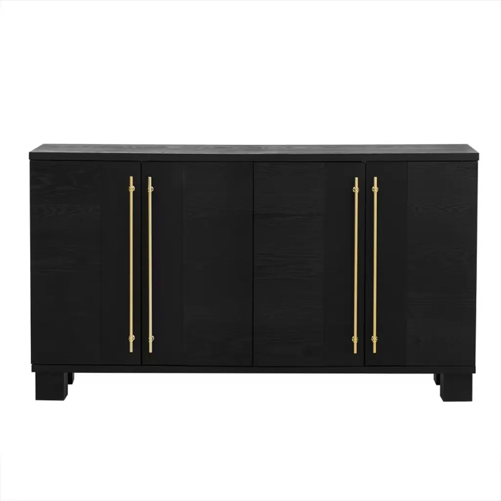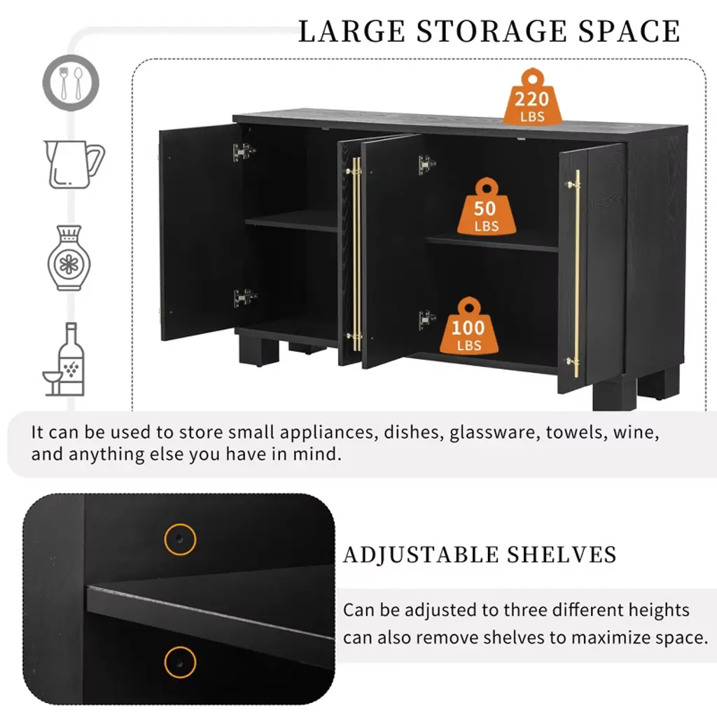This wood buffet cabinet with adjustable shelves and gold handles is designed to bring traditional elegance to your home. With its clean lines and neutral tones, it offers a refreshing and eye-catching addition to your living room or dining area. The cabinet features generous storage options, including adjustable shelves and a wide tabletop, ensuring your items are neatly organized. Made from high-quality materials, it is both stable and durable. Available in three colors, this sideboard cabinet adds a touch of luxury to any decor.