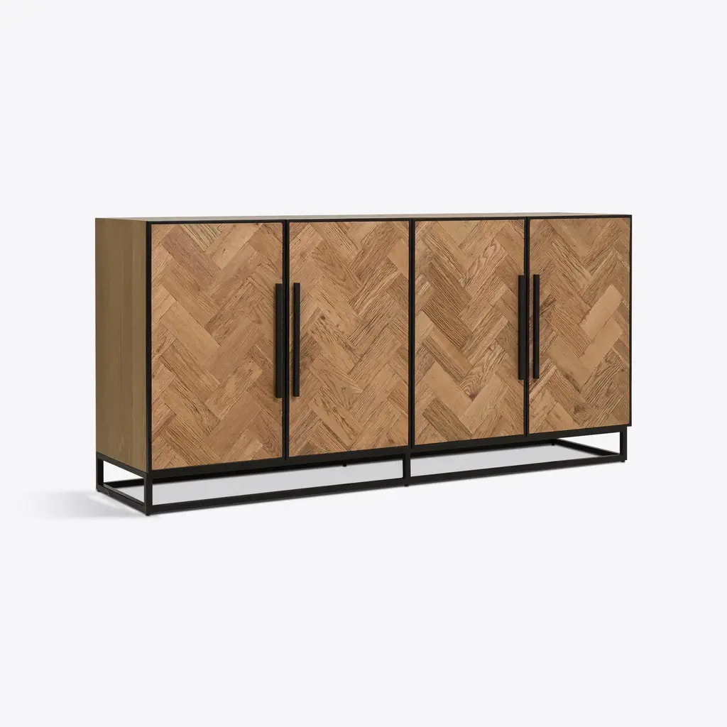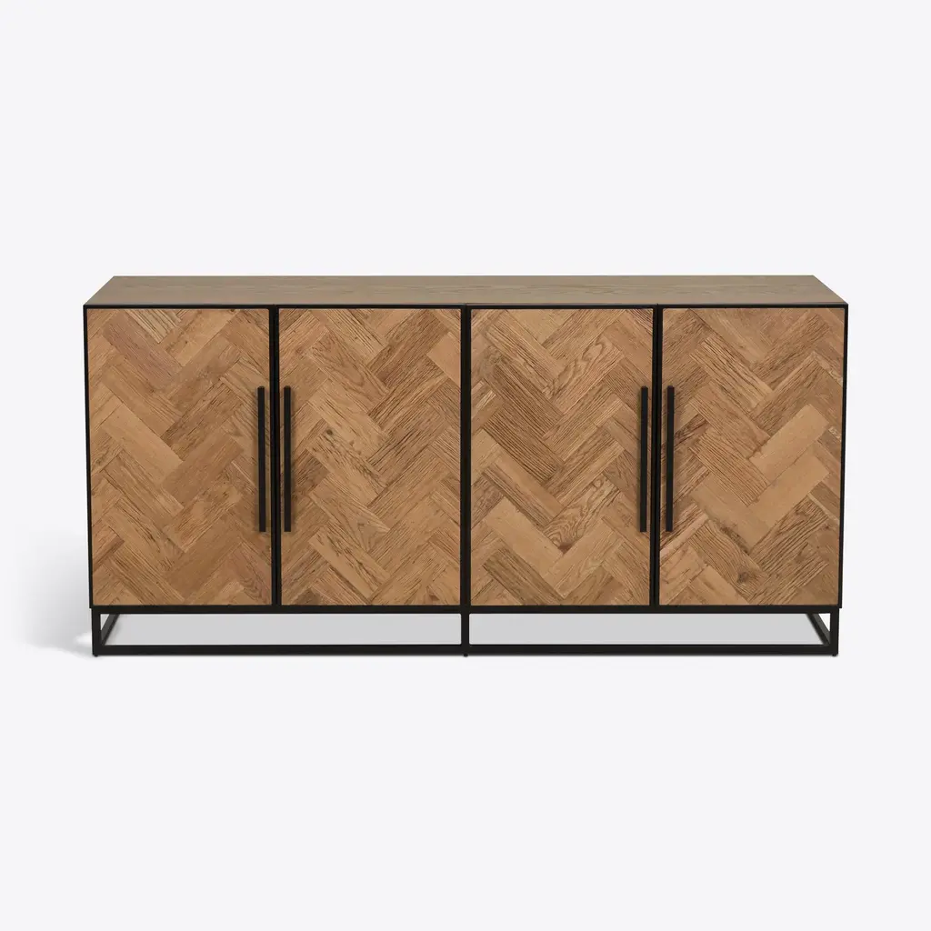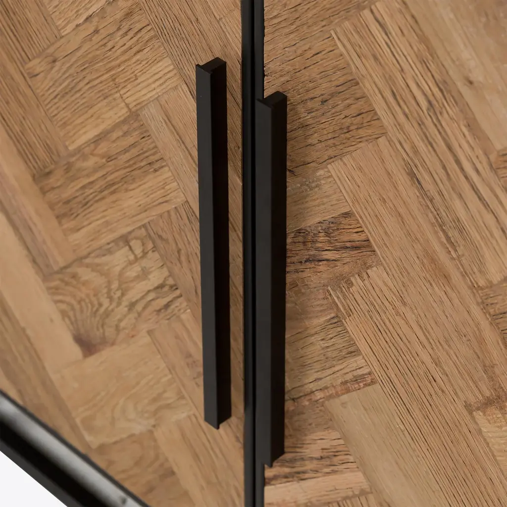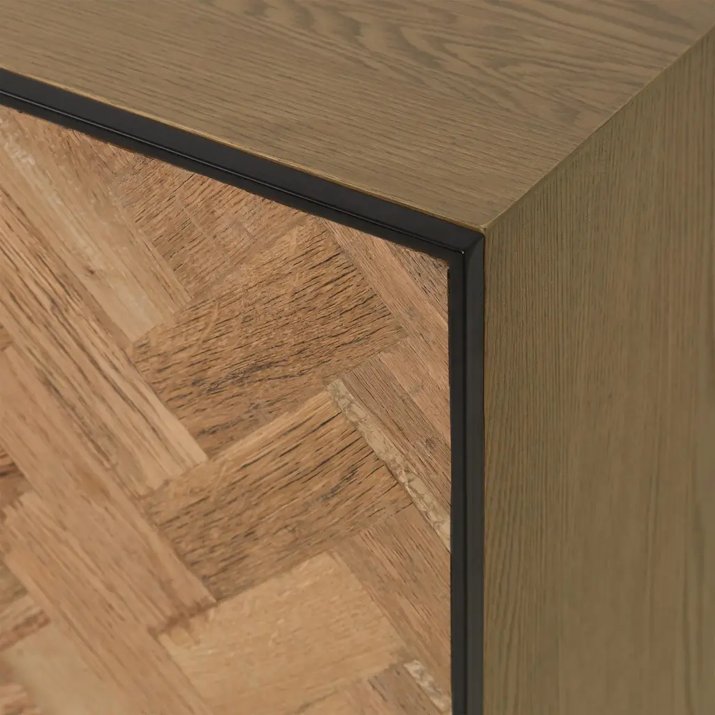 Stylish, modern living room storage made from reclaimed oak in a natural parquetry finish. Numbered