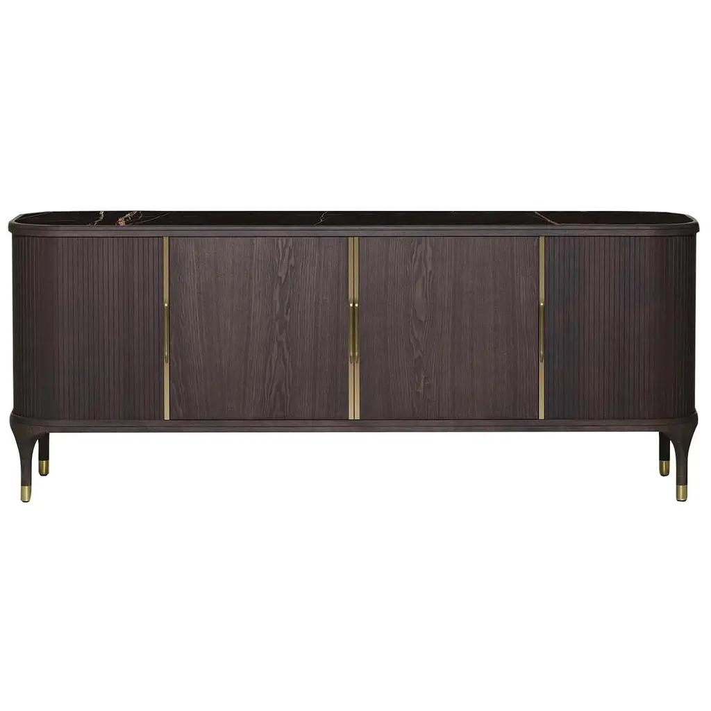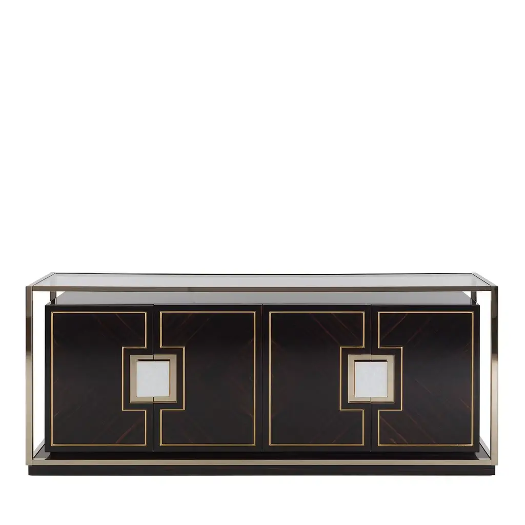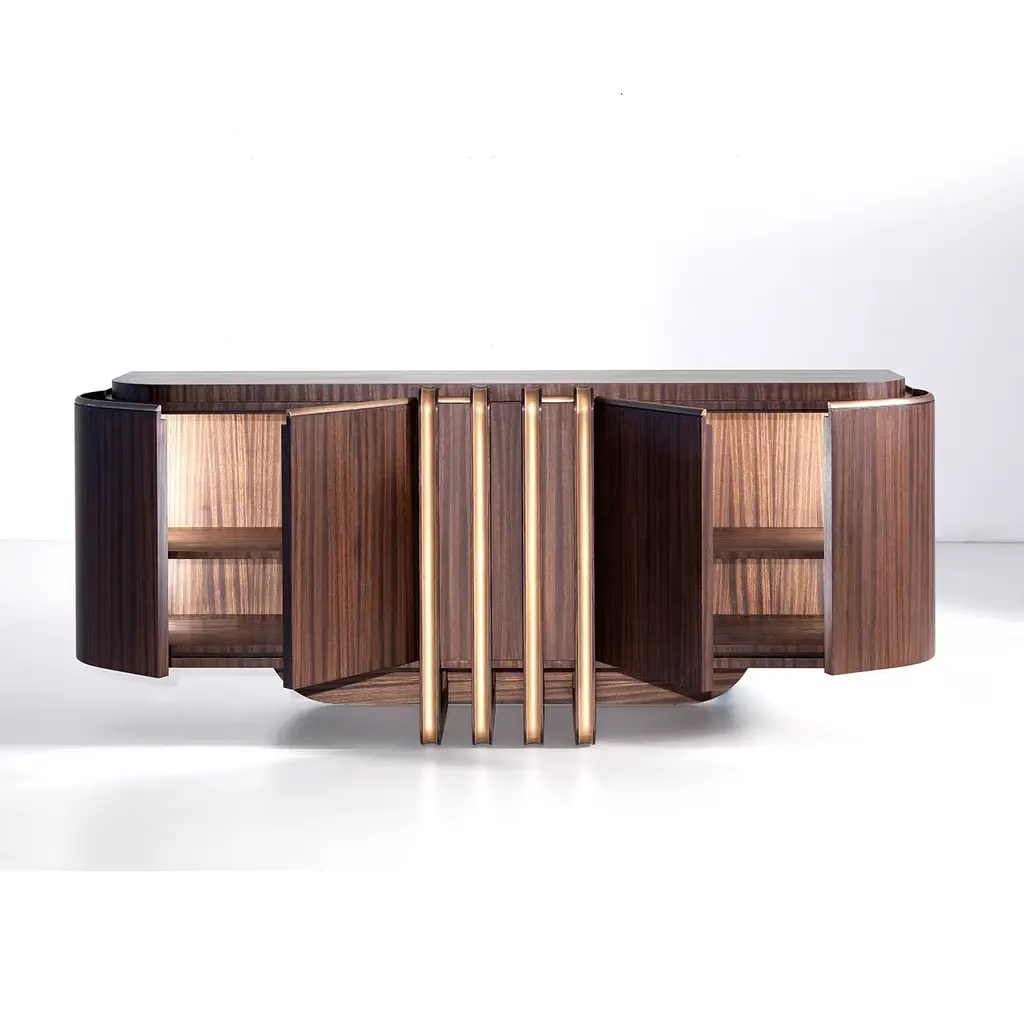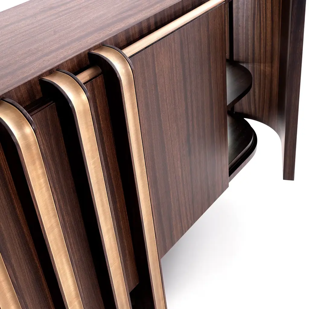 A refined and bold flair marks this eye-catching sideboard crafted of prized zebra wood. Its imposing frame is distinguished for blunted corners and smooth surfaces extremely pleasant to the touch. Streamlined details in solid brass run in parallel vertical lines gracing the front doors and accent the structure's edges to add subtle luminosity to the design, which rests on a slightly tapered base.\n\n