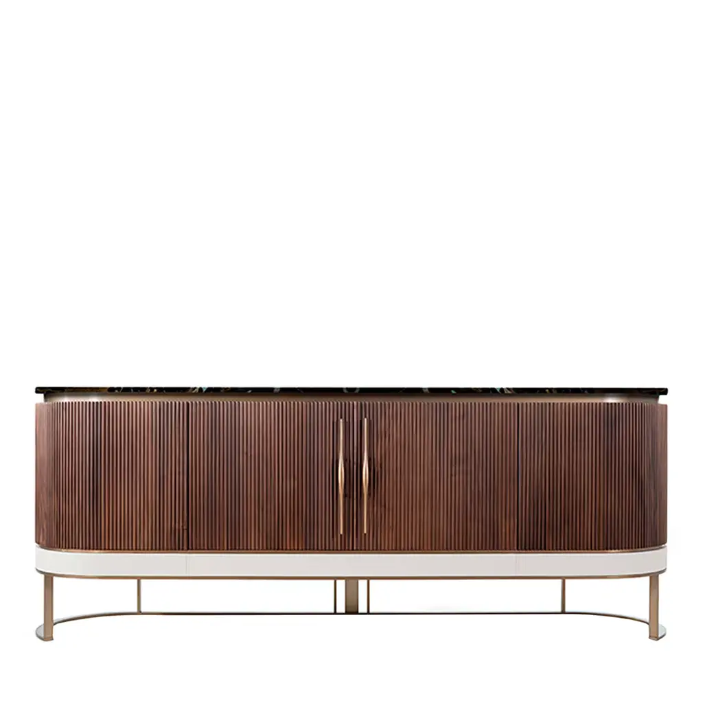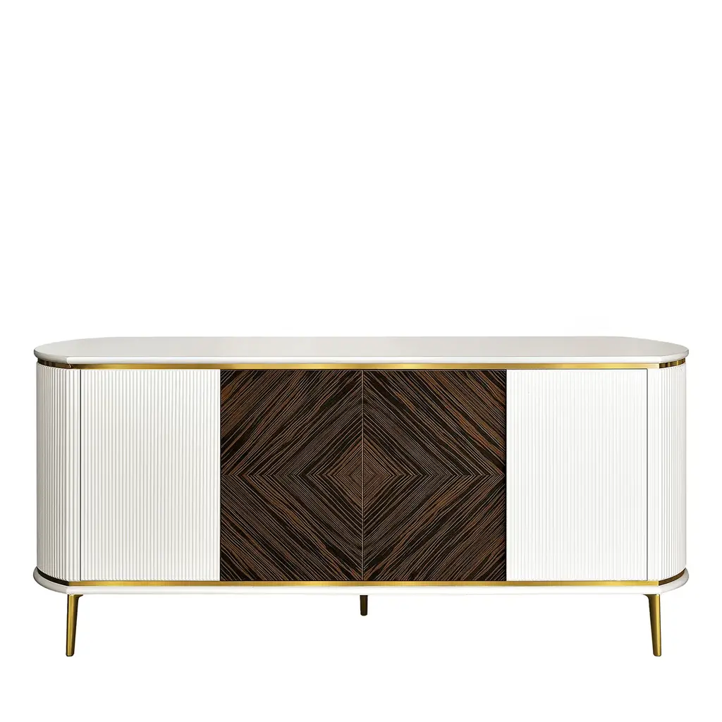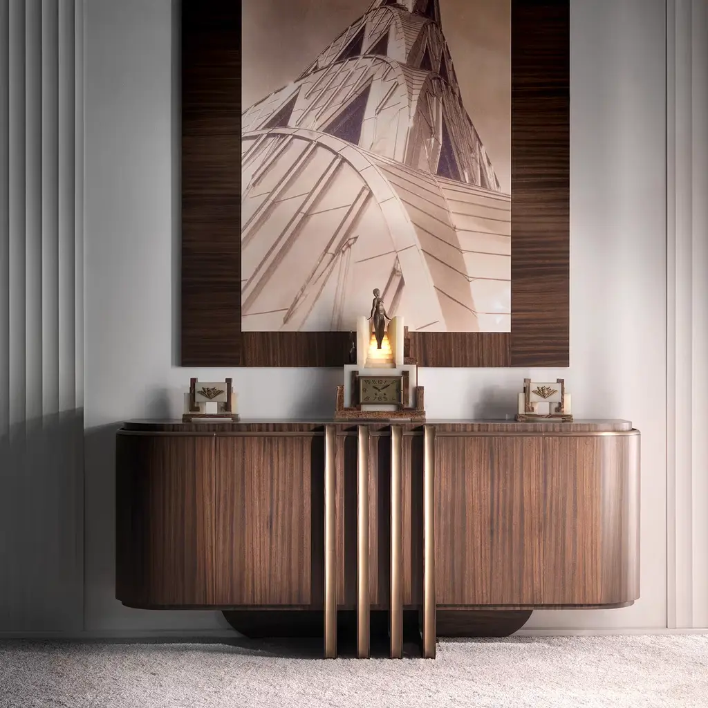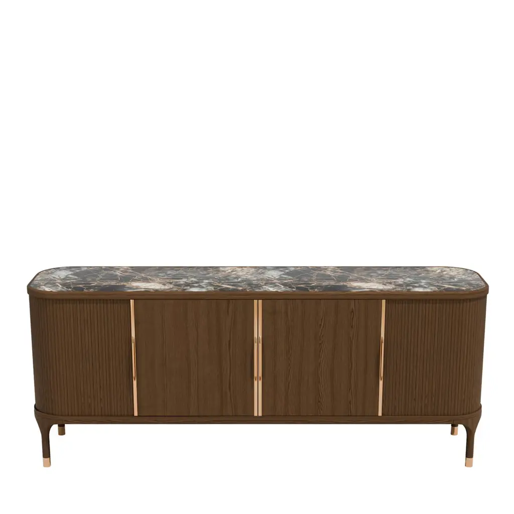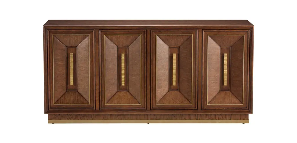 A refined and bold flair marks this eye-catching sideboard crafted of prized zebra wood. Its imposing frame is distinguished for blunted corners and smooth surfaces extremely pleasant to the touch. Streamlined details in solid brass run in parallel vertical lines gracing the front doors and accent the structure's edges to add subtle luminosity to the design, which rests on a slightly tapered base.\n\n