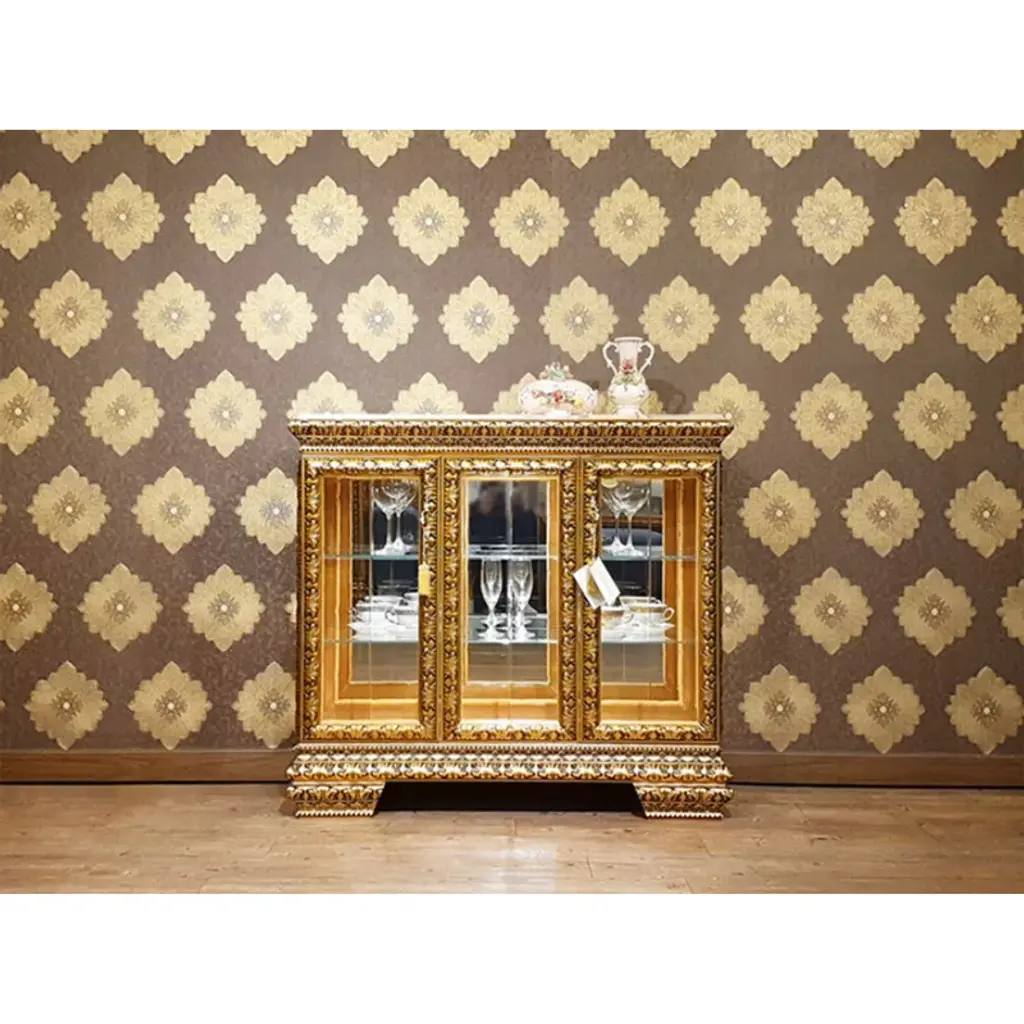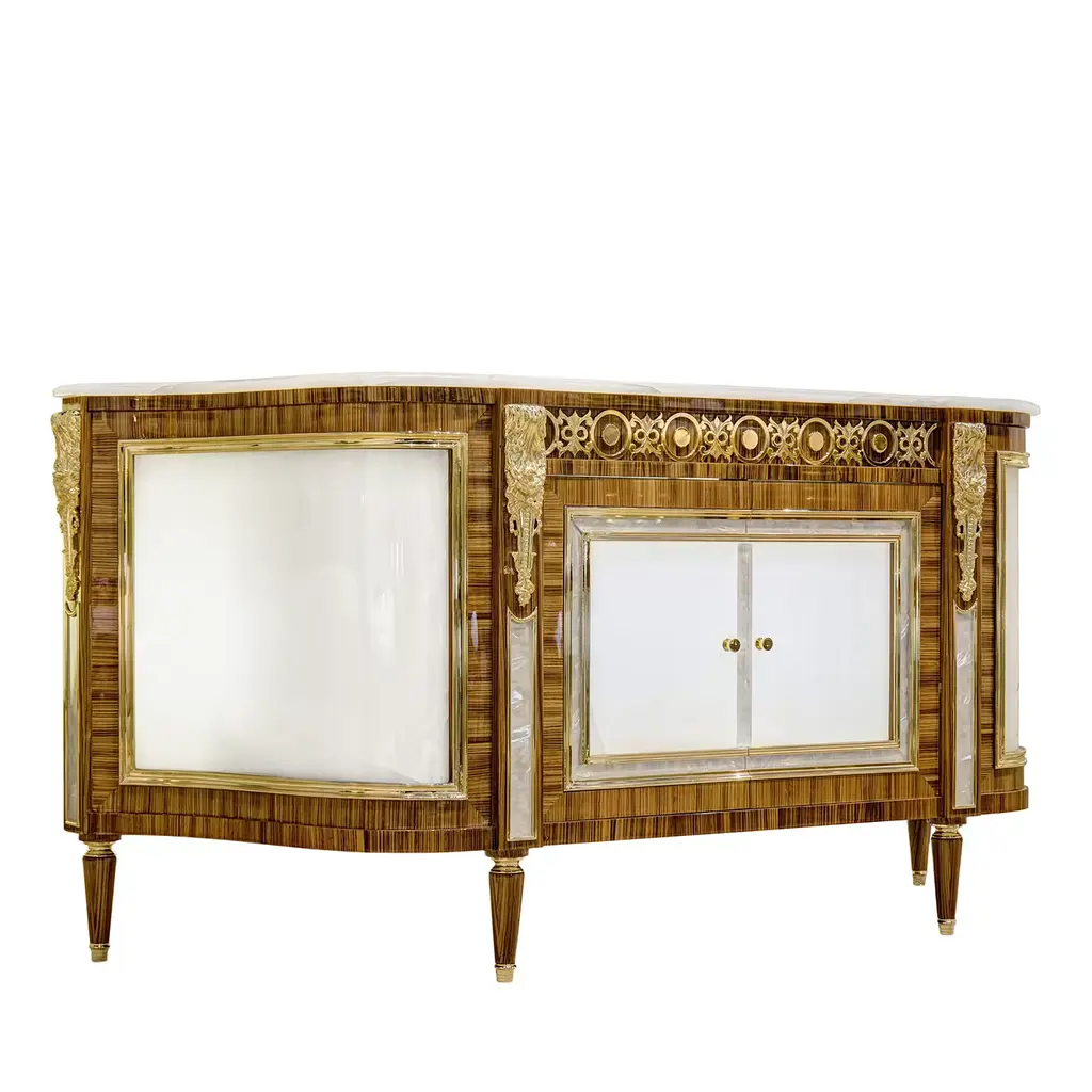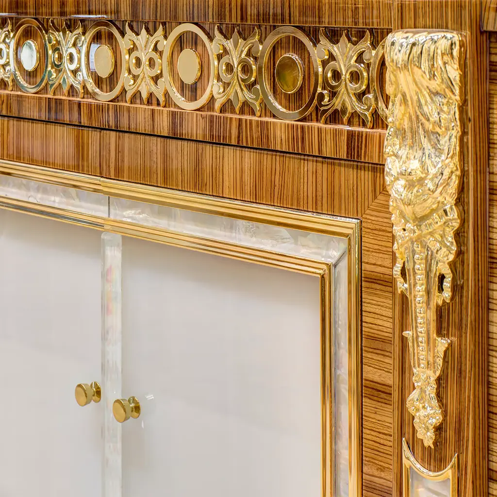 Opulent materials and unrivaled cabinetmaking artistry distinguish this refined two-door sideboard. Marked by wavy sides, it is veneered in prized zebrawood and luxuriously accented with nacre and crystal inserts adding to finely-etched bronzed floral motifs plated in 24K gold. The top in fine white onyx emphasizes the general glow of the glossy frame. An internalLED light completes the design.