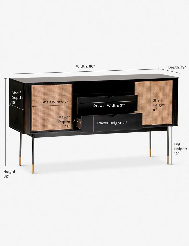 Convenient. Sophisticated. So, so stylish. This functional sideboard is the perfect storage piece for transitional spaces with mid-century leanings, featuring wicker sliding doors, brass accents and two pull-out drawers in a timeless wooden frame.