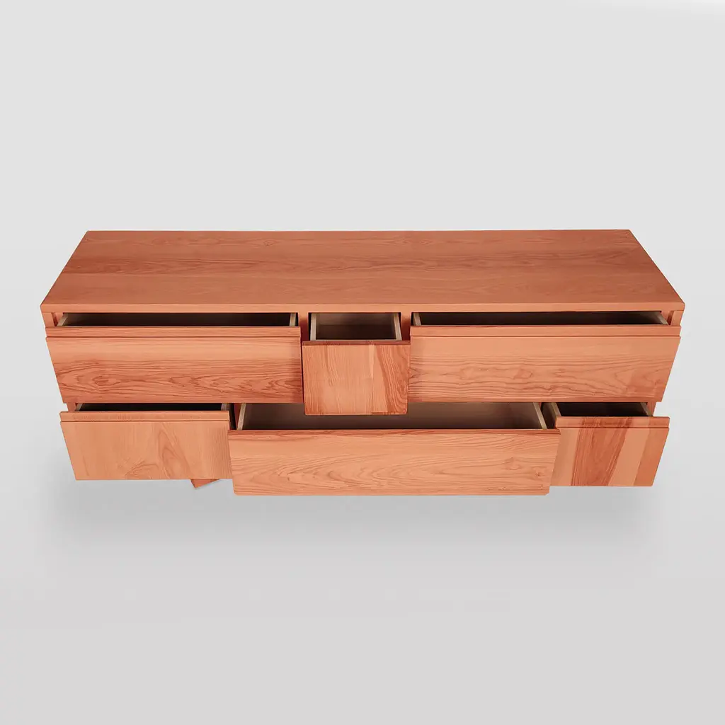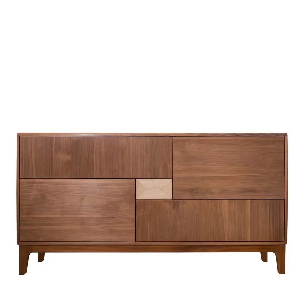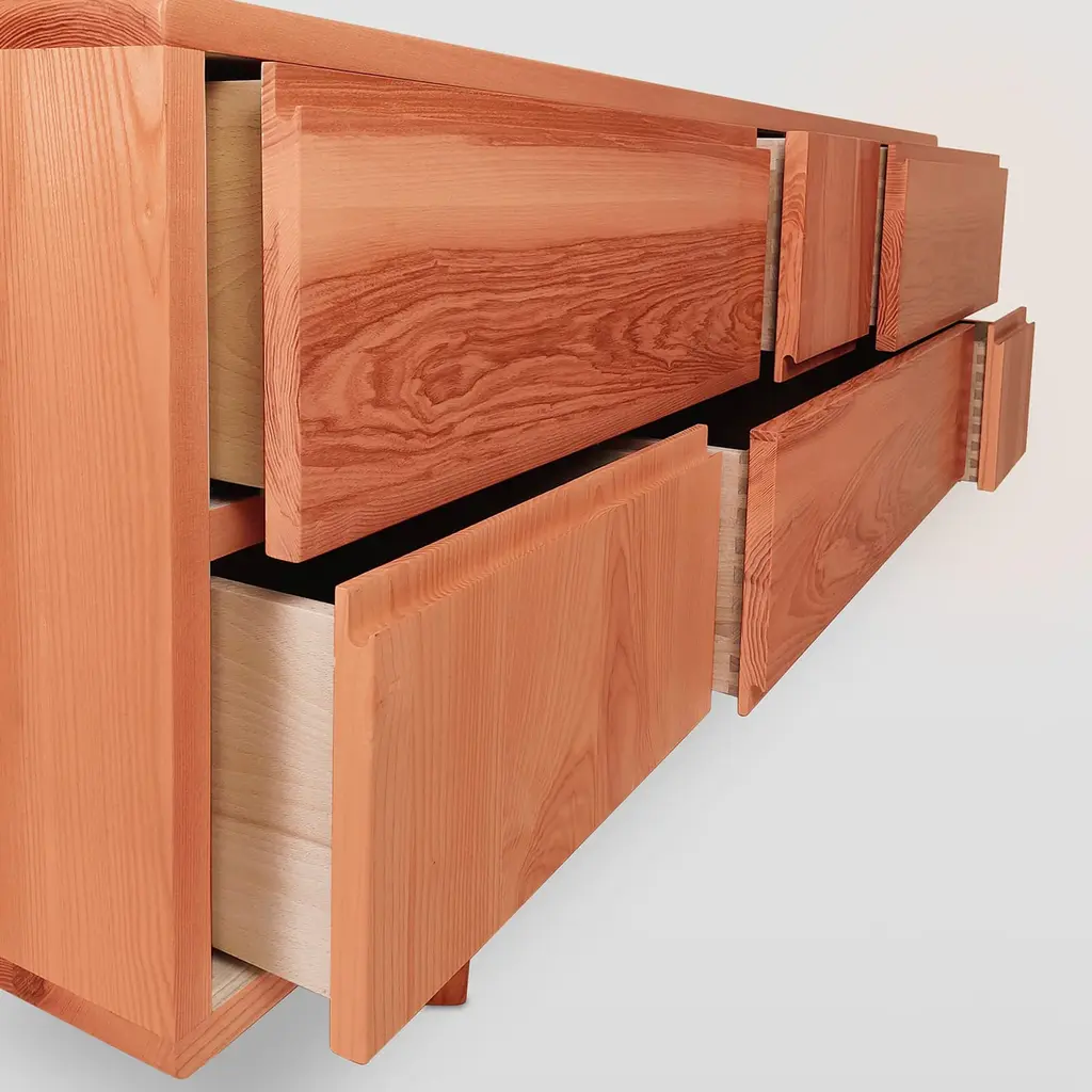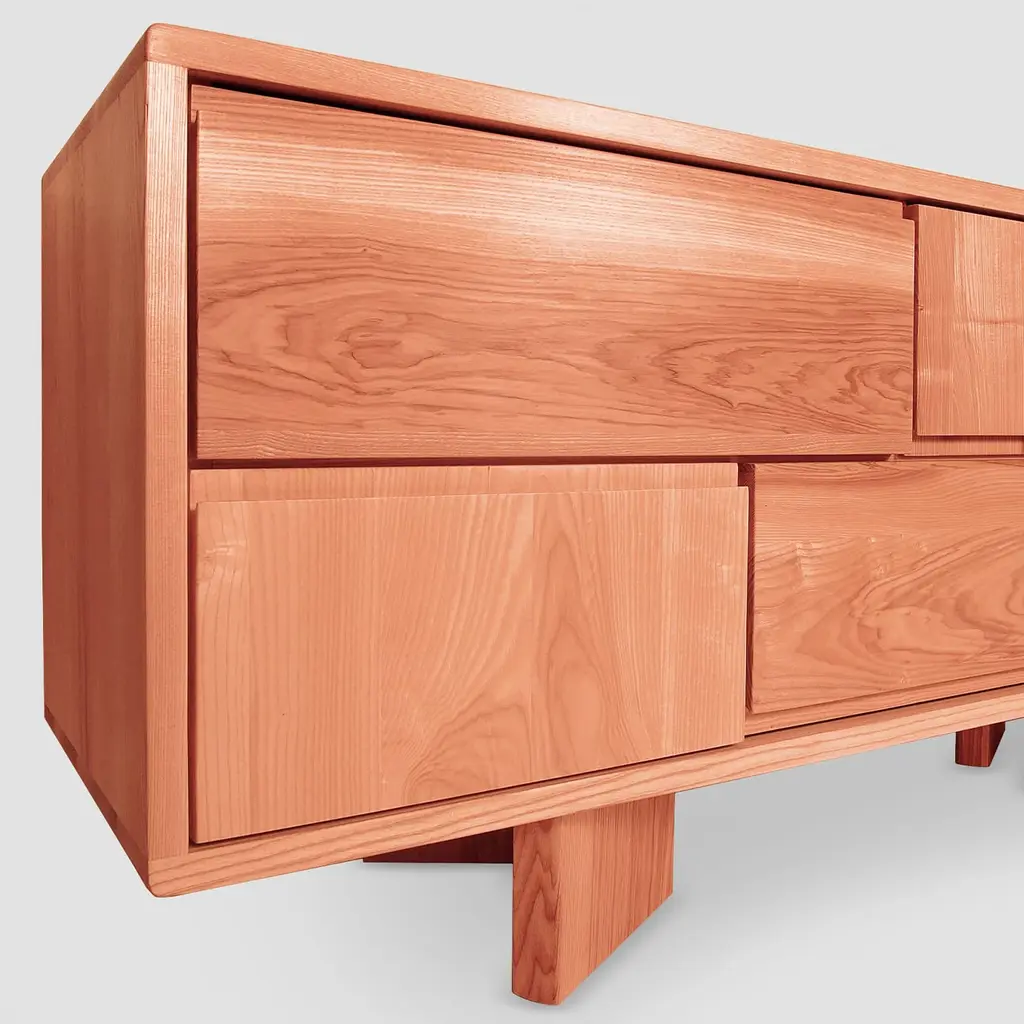 An intense, orange-brown shade describes the lively character of this stupendous sideboard, unique creation by Eugenio Gambella. Boasting a minimalist style of nordic inspiration, it is comprised of six 50 kg-capacity drawers with BLUM metal hinges and a blumotion closing system. Finished with rounded corners and edges, it is lacquered with water-based paint and polished by hand with beeswax. Care instructions included with purchase.