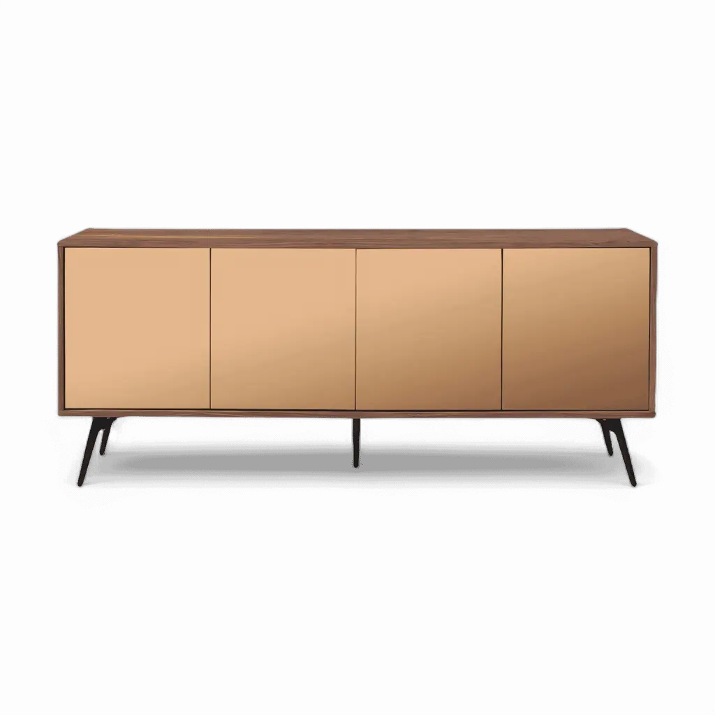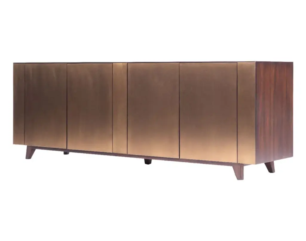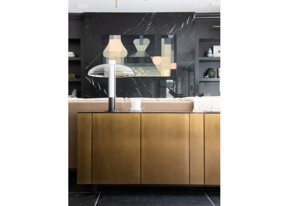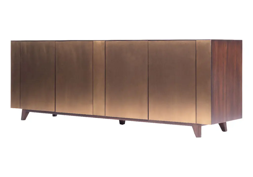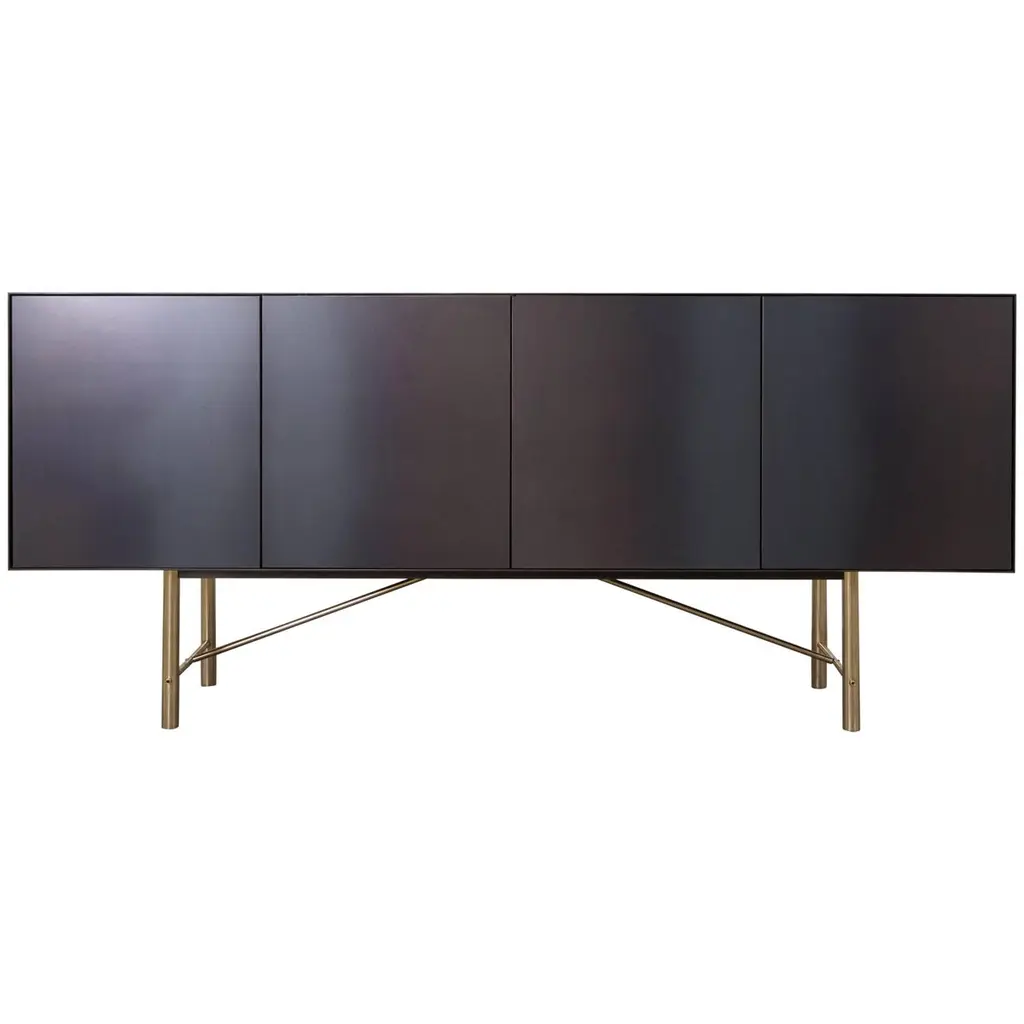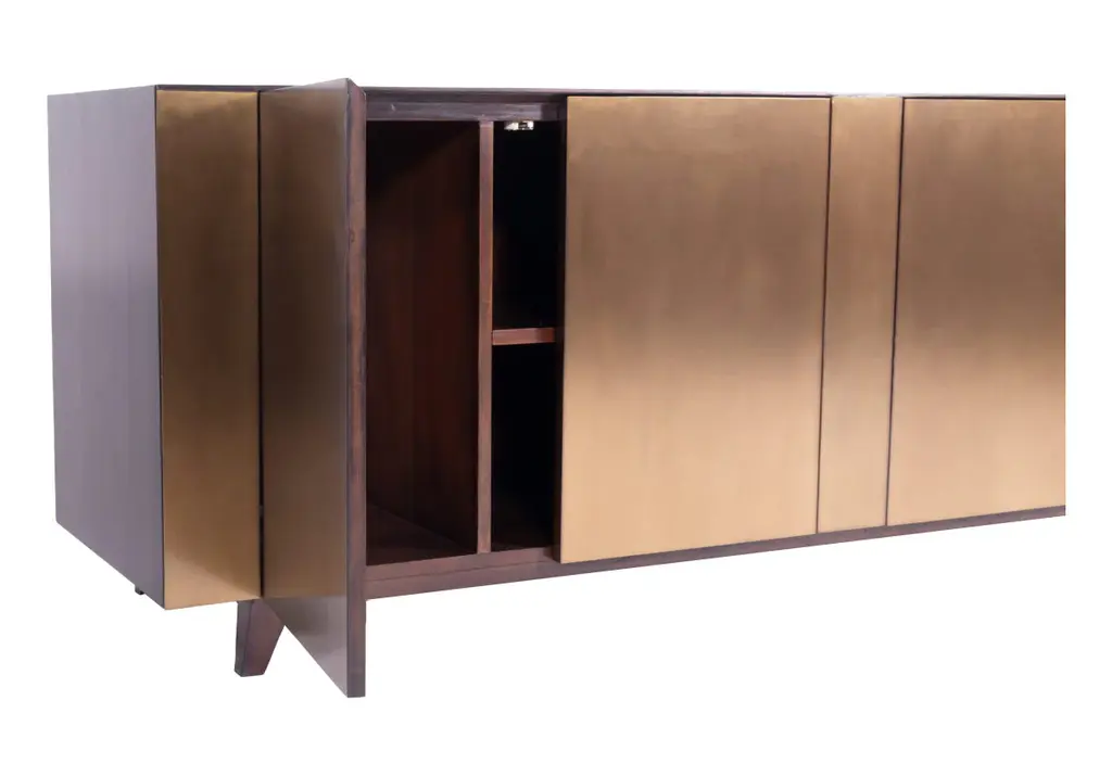 An instant classic, the Ziggy Sideboard effortlessly makes a chic statement with its elongated, dark mahogany form boldly contrasted by brass finished doors. Touch latched doors provide open storage on one side, for easy access to record players and large blankets or tablecloths complemented by shelving on the other side for puzzles, games, silverware, and records. Its low profile styles perfectly into media, living, or dining rooms for a modern yet antique look.