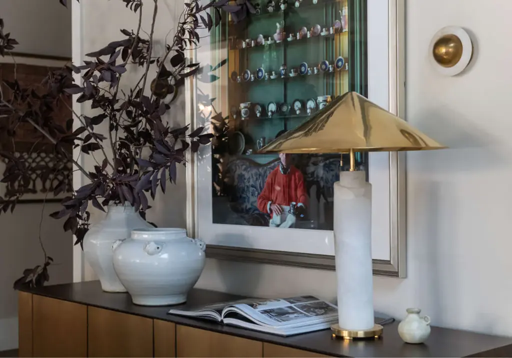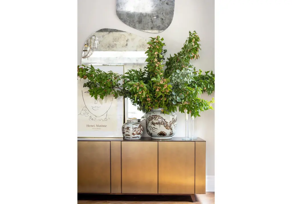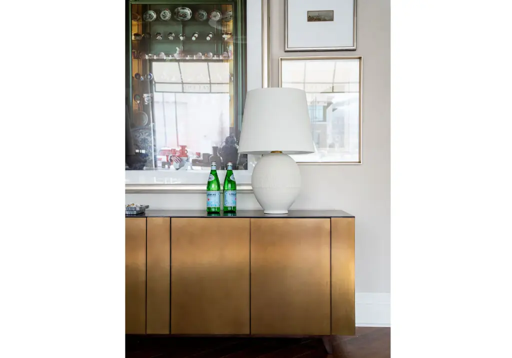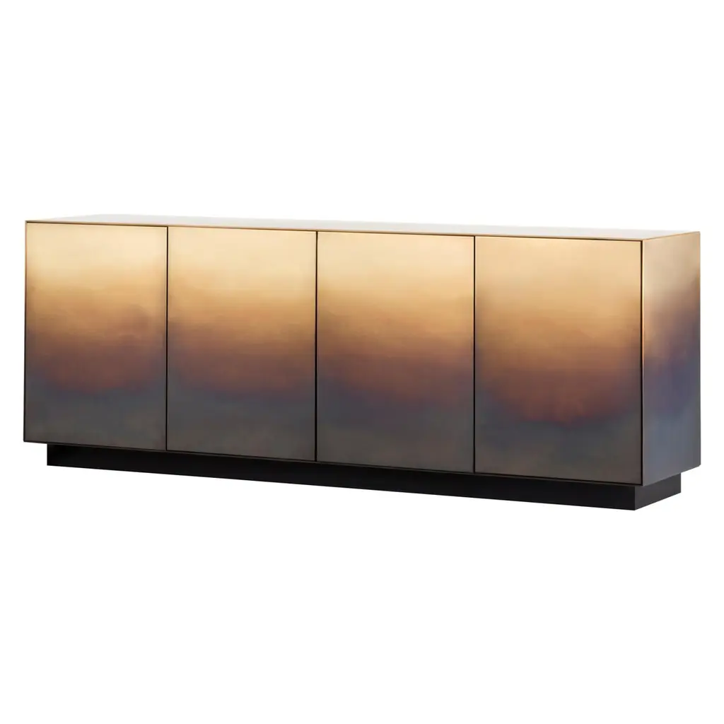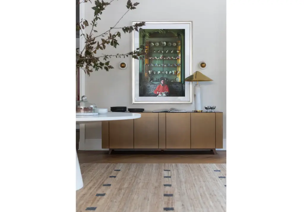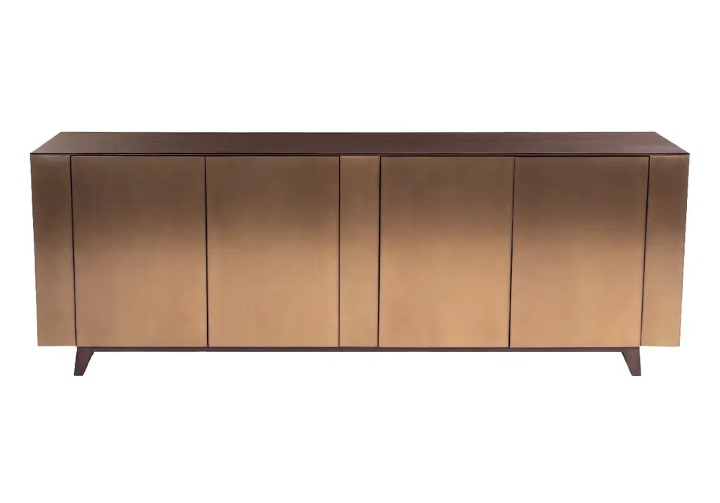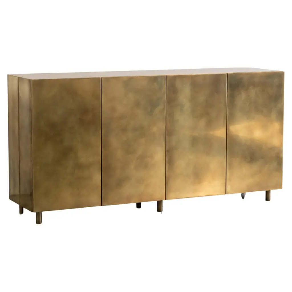 An instant classic, the Ziggy Sideboard effortlessly makes a chic statement with its elongated, dark mahogany form boldly contrasted by brass finished doors. Touch latched doors provide open storage on one side, for easy access to record players and large blankets or tablecloths complemented by shelving on the other side for puzzles, games, silverware, and records. Its low profile styles perfectly into media, living, or dining rooms for a modern yet antique look.