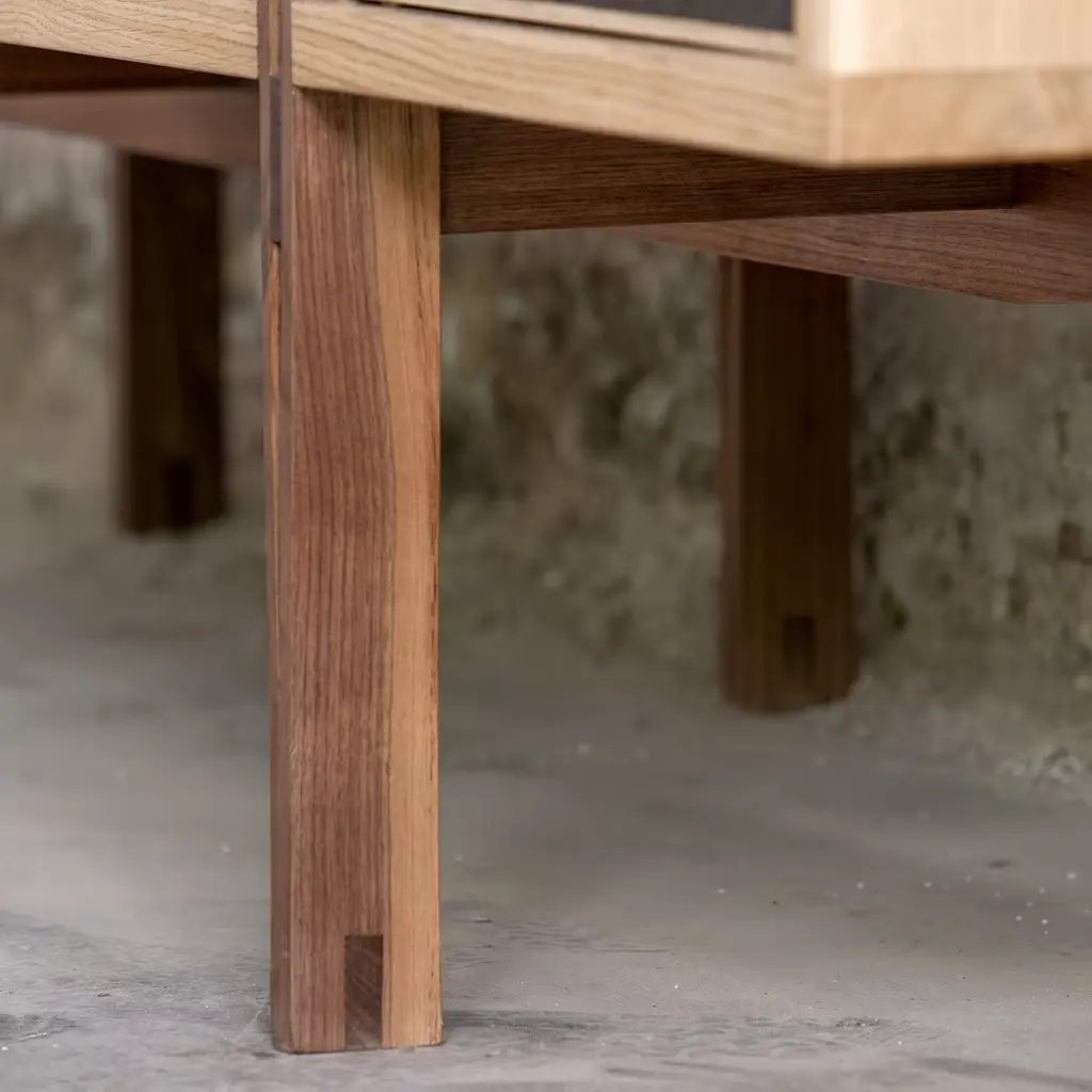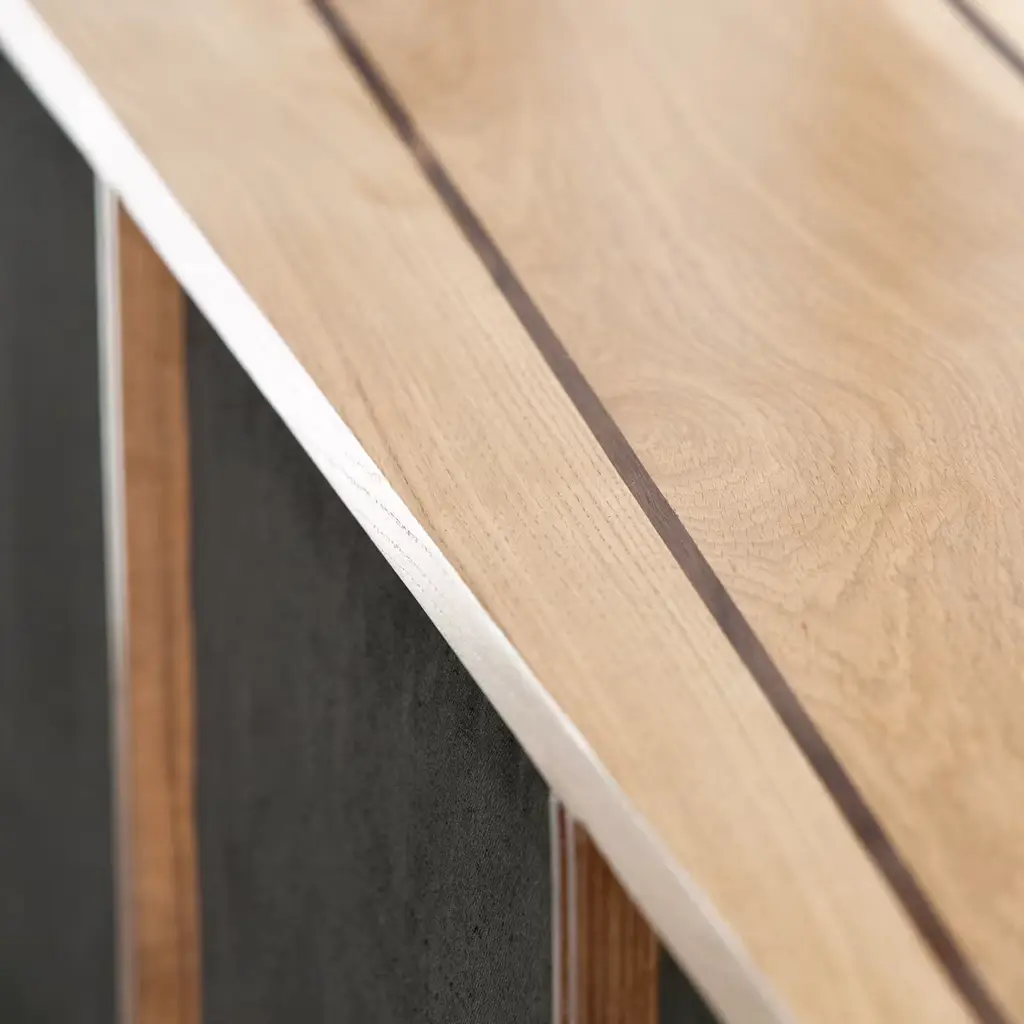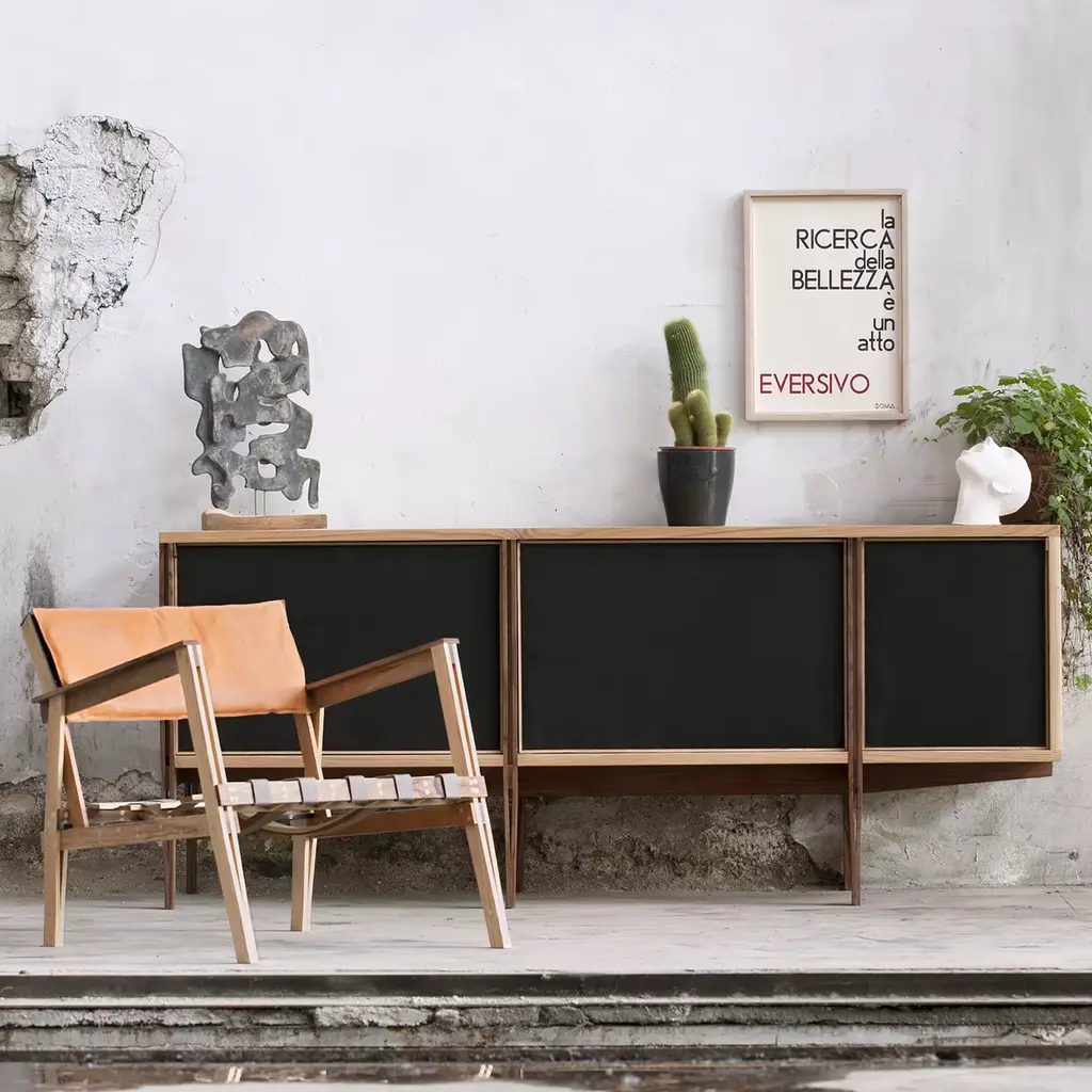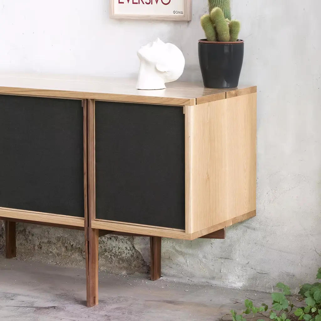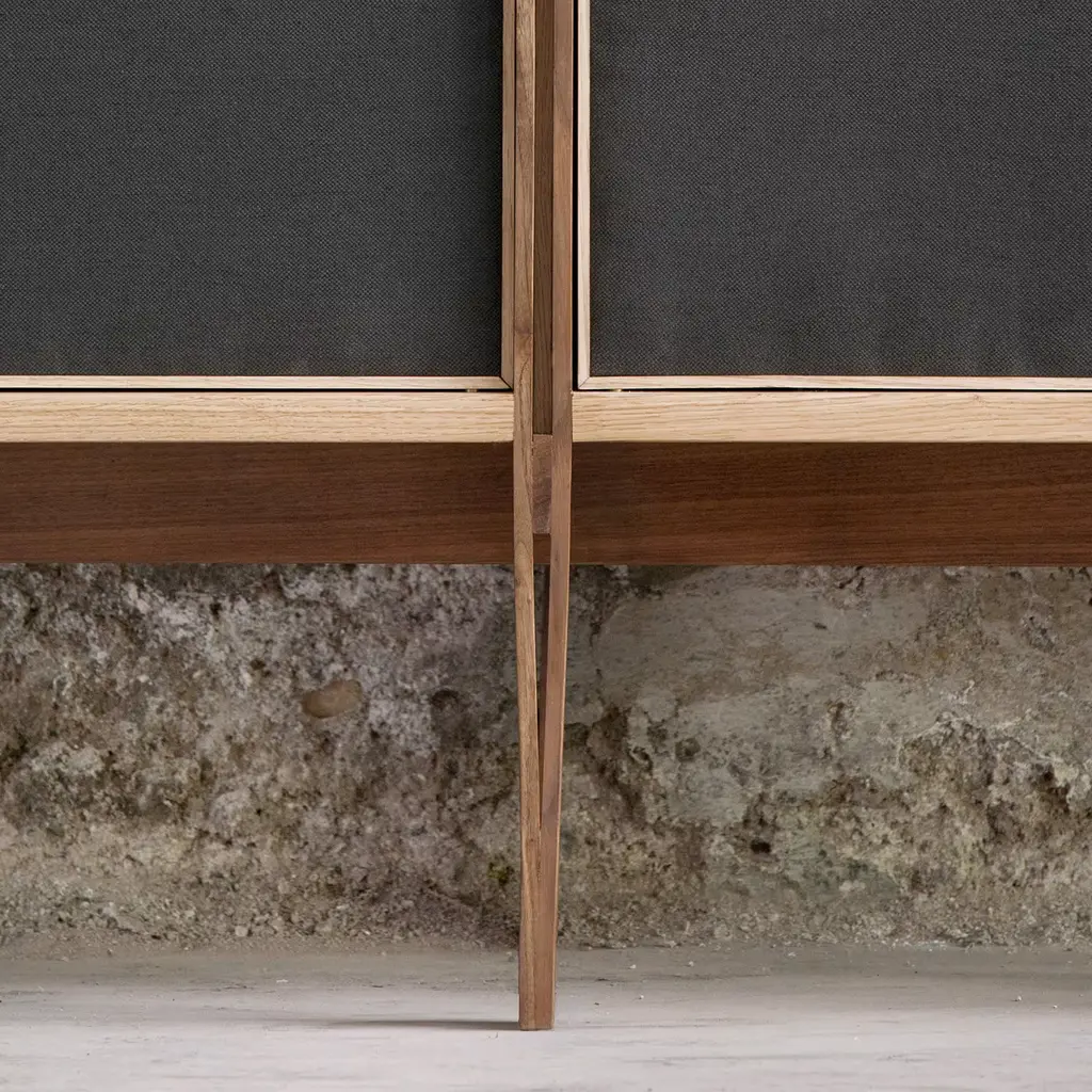 Zoa combines the characteristics of a classic sideboard with the qualities of a modern, refined design object. Designed to be used every day, this solid durmast and Canaletto walnut piece possesses the charm of the most skilful craftsmanship. The doors with hidden handles are padded and covered with a thick gray cotton fabric, making them particularly pleasant to the touch.