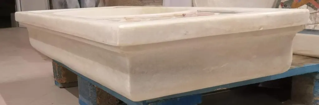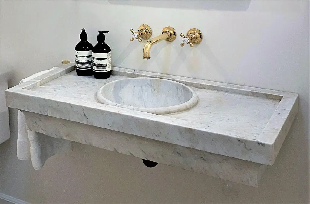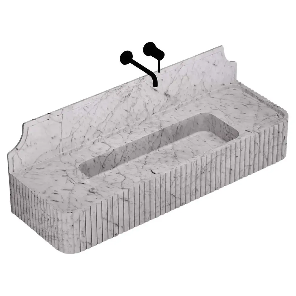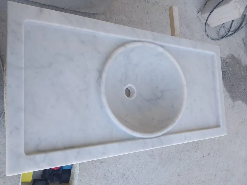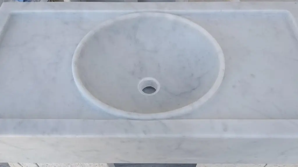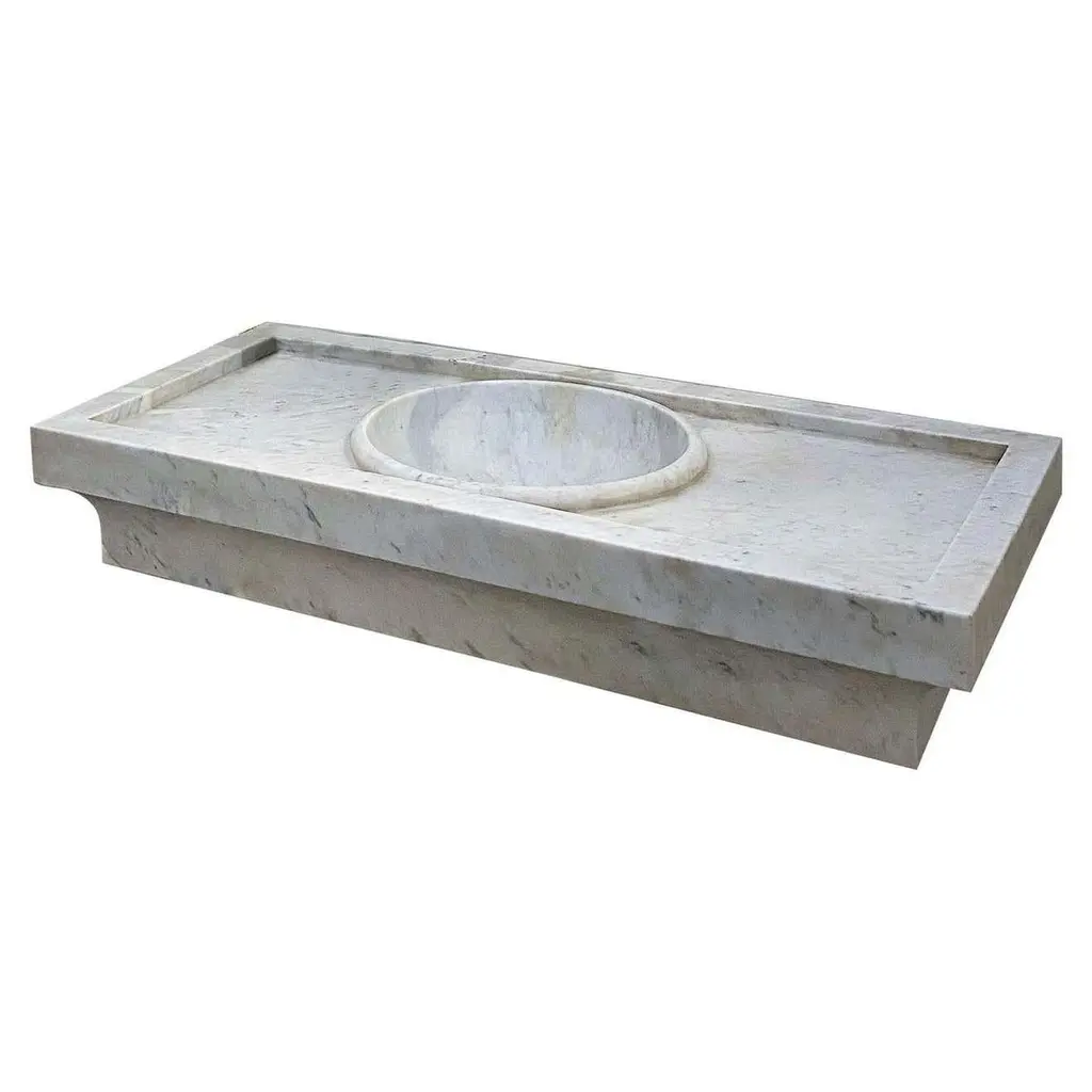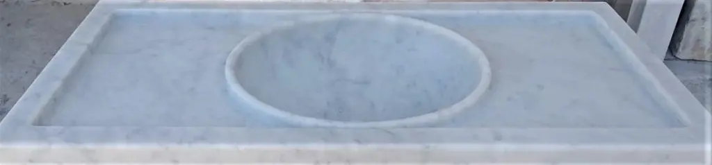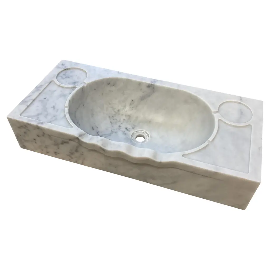 This timeless beautiful Italian classical sink is cut from one single block of white marble, these designs have not changed since Greek and Roman times, it carries superb artistic merit easily fitting in with old and new buildings.Custom sizing availableStandard size:External dimensions Cm. 92 x 41 (max) x 31 (min) x 16 cm highOval bowl dimensions Cm. 37 x 30