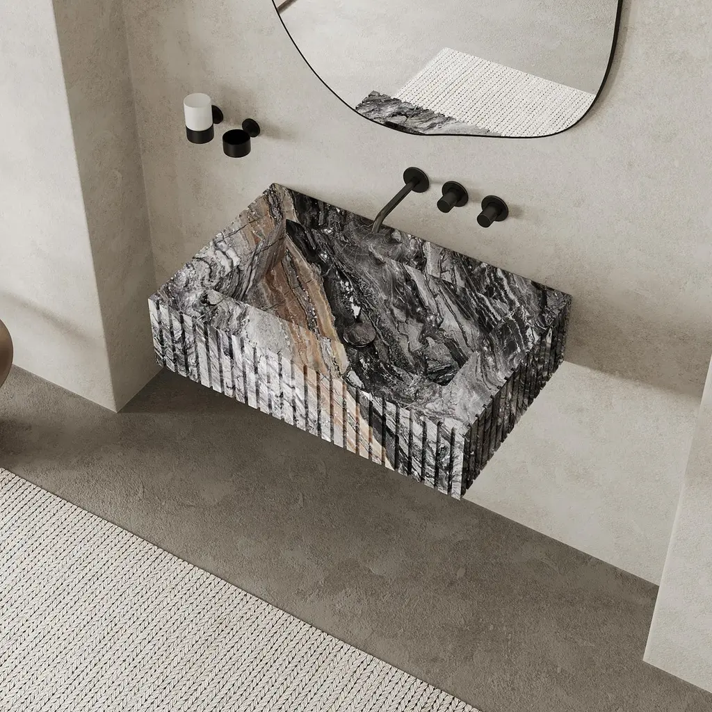 Accentuate your bathroom space with our Ribbed Marble Basin, a perfect fusion of minimalist design and natural elegance. The beautiful ribbed detailing creates a unique visual appeal while highlighting the unique veining and texture of the marble, offering a luxurious touch to your bathroom Available in a variety of marble options, allowing you to select the perfect color and texture to match your unique design vision. The water supply kit, drain assembly, and faucets are not included however our installation manual is included to assist!As marble is a natural material, variations in background color, veining distribution, and patterns are to be expected, making each piece uniquely beautiful.Dimensions: 805020