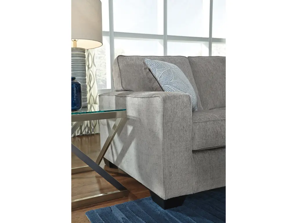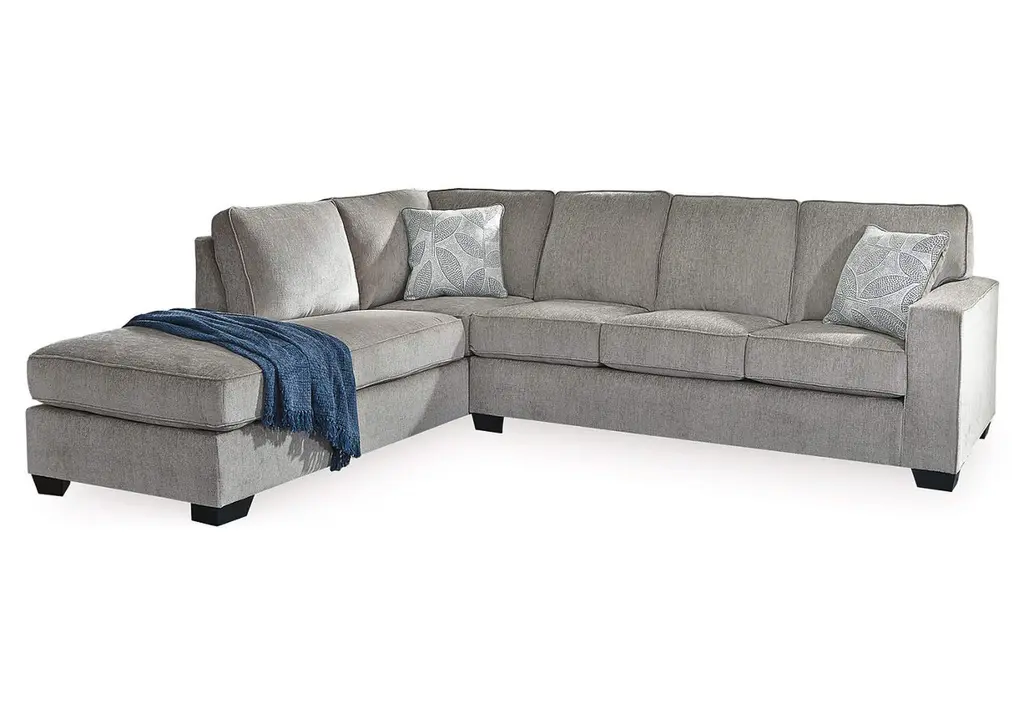 If style is the question, then the Altari 2-piece sleeper sectional with ottoman is the answer. Sporting clean lines and sleek track arms, the decidedly contemporary profile is enhanced with plump cushioning and a chenille-feel upholstery that's so pleasing to the touch. Sure to play well with so many color schemes, this living room set in richly neutral alloy includes understated floral pattern pillows for fashionably fresh appeal. Crafted of quality memory foam, the pull-out full mattress comfortably accommodates overnight guests.