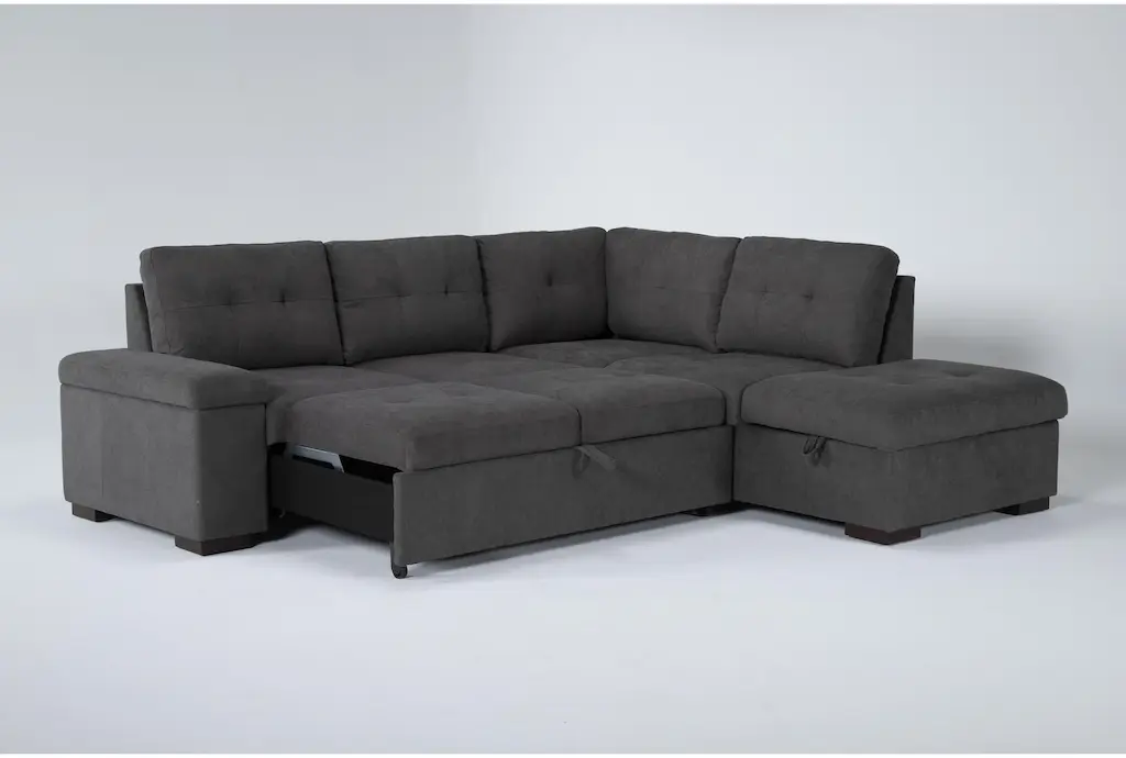 Nobody will be leaving your living room once they experience the many ways to relax and enjoy our Flinn convertible sectional. The design is available in spacious right-facing and left-facing configurations, which are perfectly sized for big families and gatherings. Plus, it includes a pop-out sleeper, so you can transition from daily lounging to evening snoozing seamlessly. Best of all, there’s a convenient storage chaise, where you can easily tuck away sheets, blankets and pillows for guests.