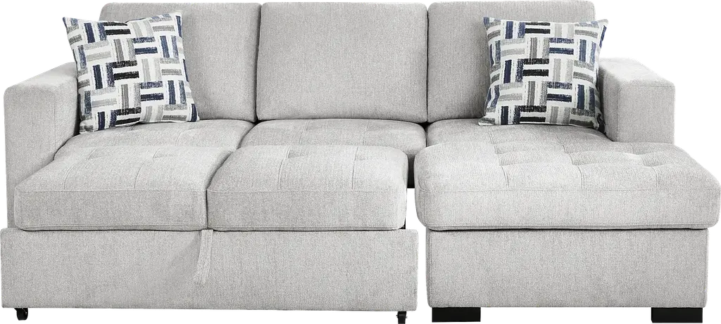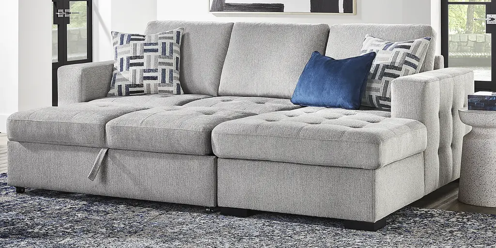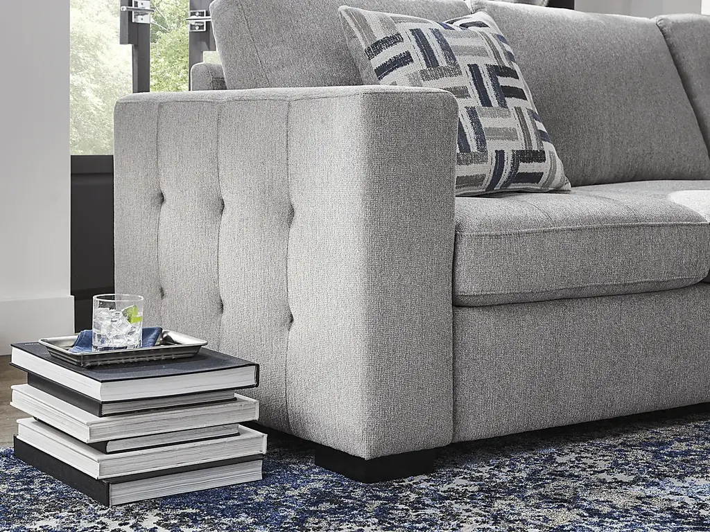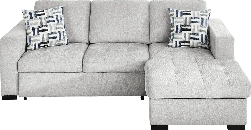 The confident, classy personality of the Geneva sectional takes grounded and crowd-pleasing design to stylish new heights. Cutting a unique modern silhouette in textured gray fabric, this sofa features big, bold track arms with tufting on the sides. The seats feature tufting to match, with attached cushions that stay comfortably in place when it's time for the pop-up sleeper to make its debut for the night. Hidden in the end chaise is a convenient storage space perfect for stowing blankets. Included with the piece, a coordinating set of accent pillows can be rearranged for maximum comfort. Upholstery: 87% Polyester, 13% Polypropylene. Cleaning Instructions: Use water based cleaning agents or foam. Tables not as shown in room image. Small accent pillow not included.