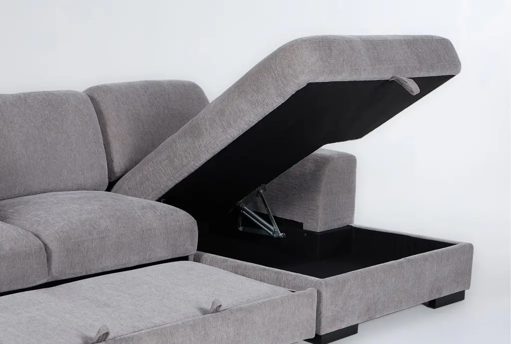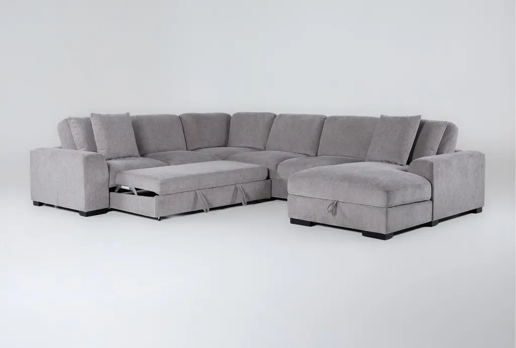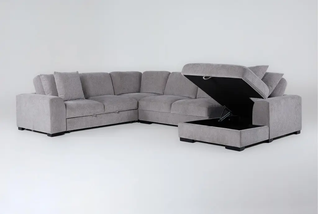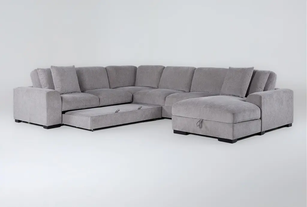 Kaden Grey Fabric 147" 4 Piece U-Shaped Convertible Futon Sleeper Sectional With Right Arm Facing Storage Chaise With Storage