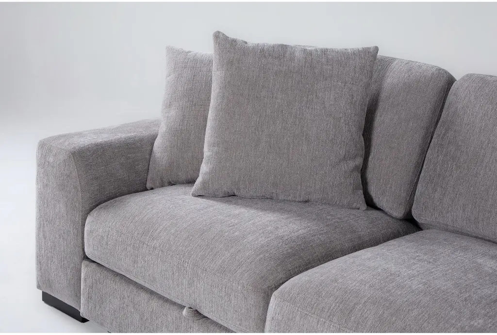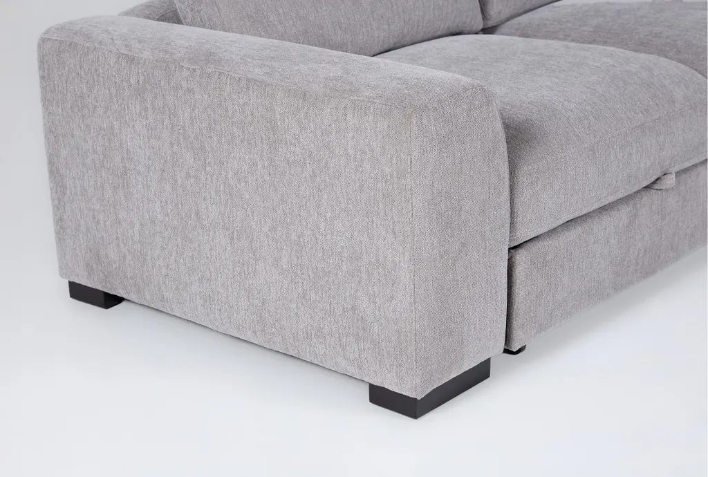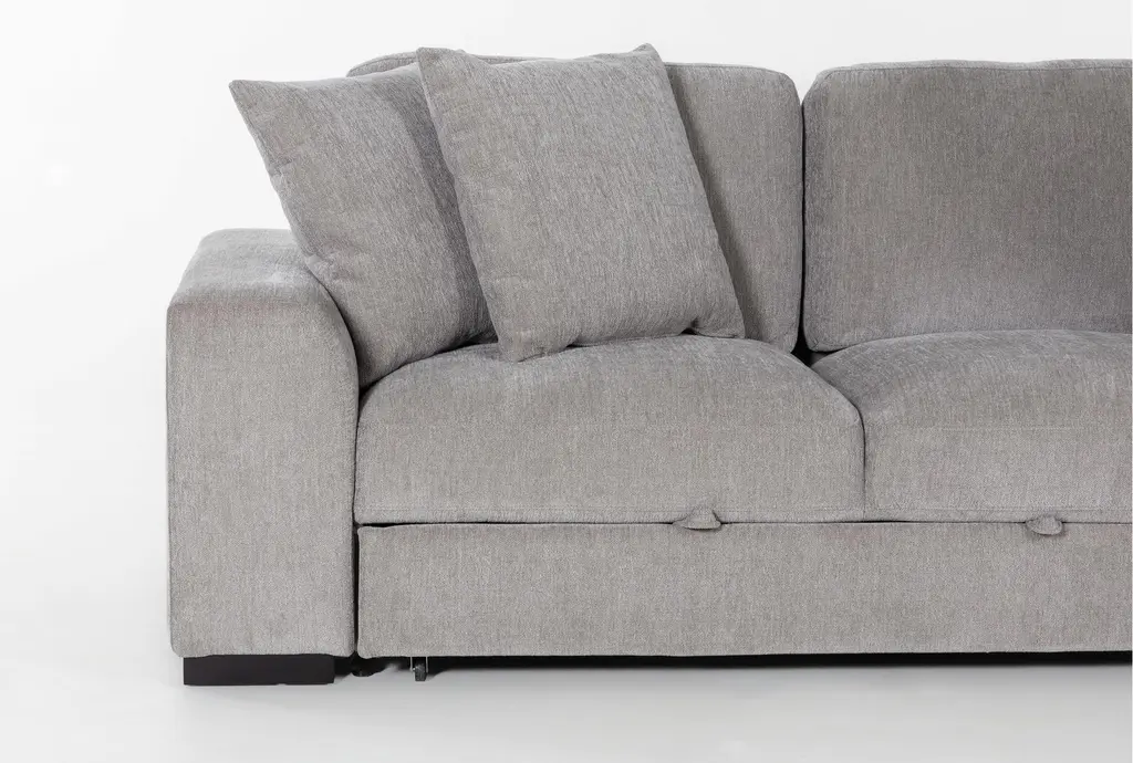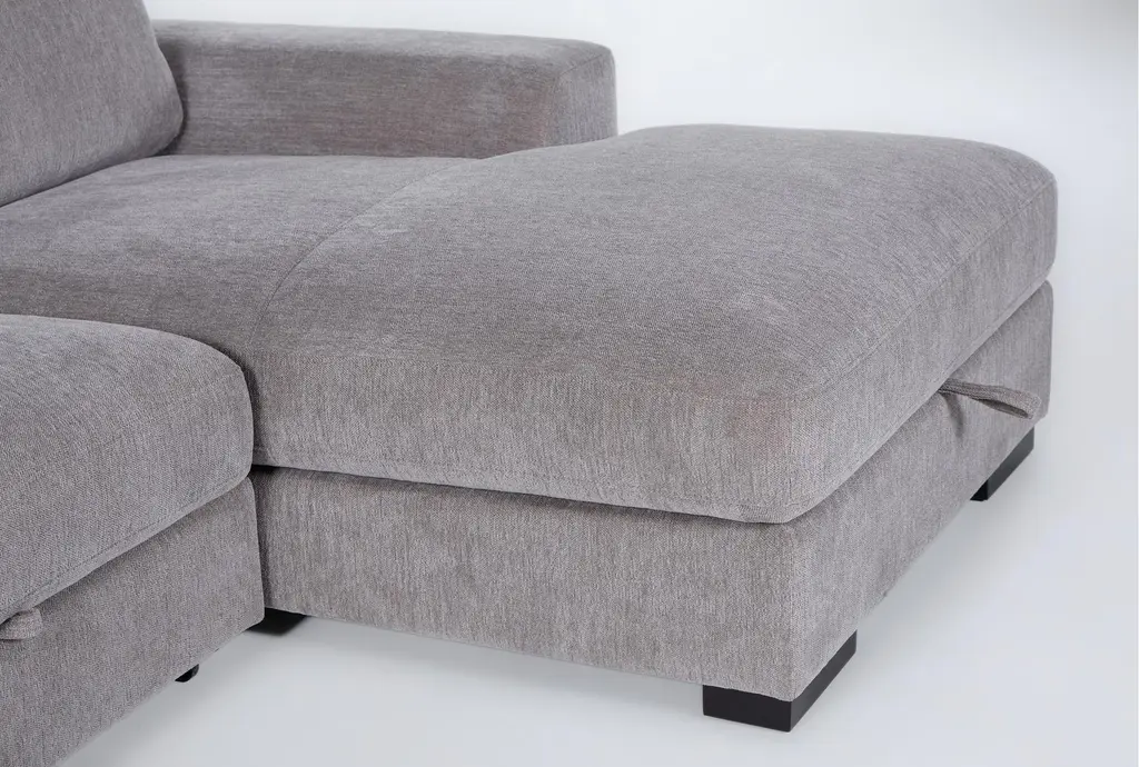 The Kaden Grey Fabric 147" 4 Piece U-Shaped Convertible Futon Sleeper Sectional with Right Arm Facing Storage Chaise is a versatile and stylish addition to any living room. Its roomy U-shaped design and soft grey 100% polyester fabric make it both comfortable and visually appealing. The sectional also features convenient storage solutions, making it perfect for modern living spaces.