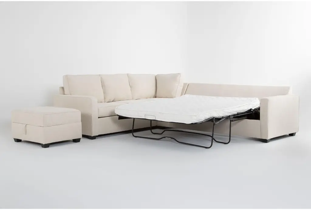 Mathers Cream Beige White Fabric 125" 2 Piece L-Shaped Sectional With Right Arm Facing Queen Memory Foam Sleeper Sofa Bed & Ottoman
