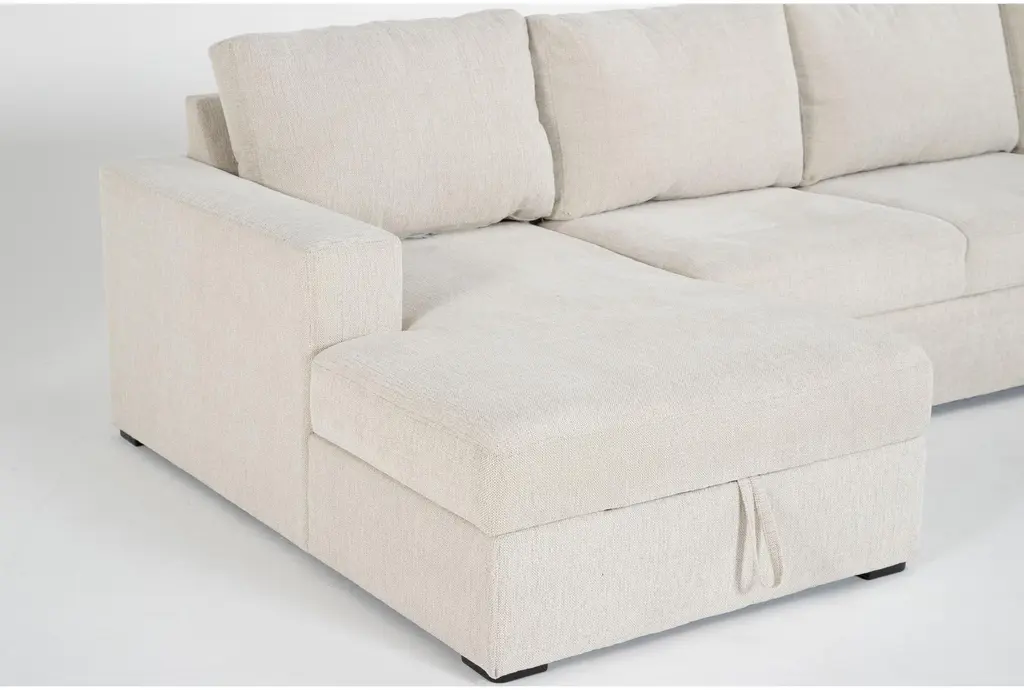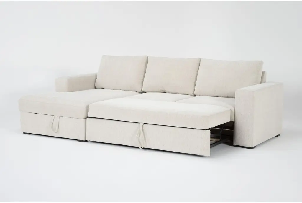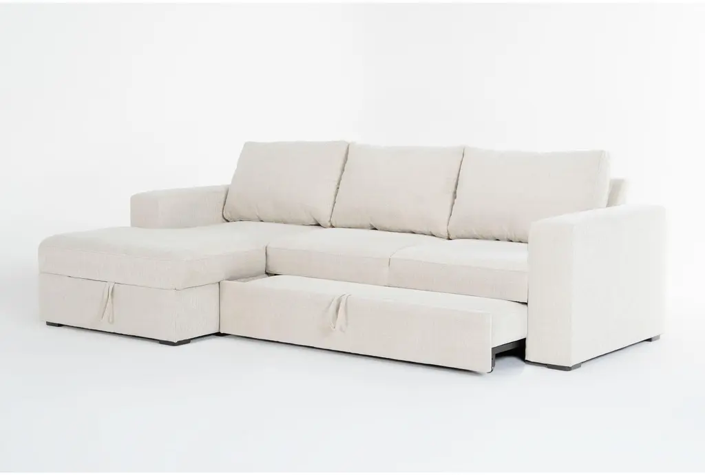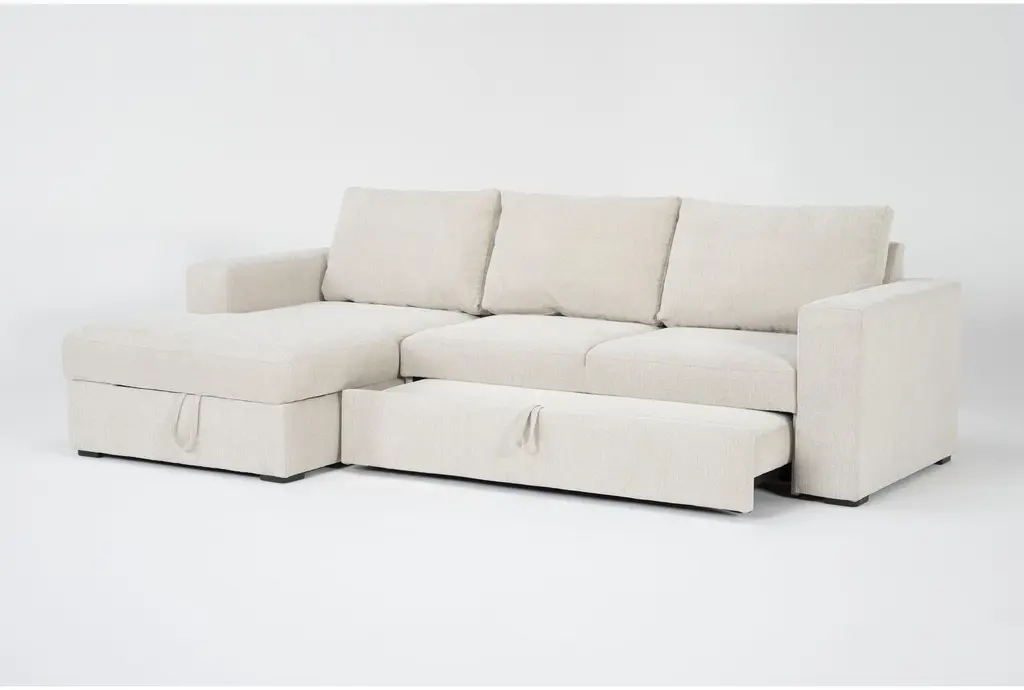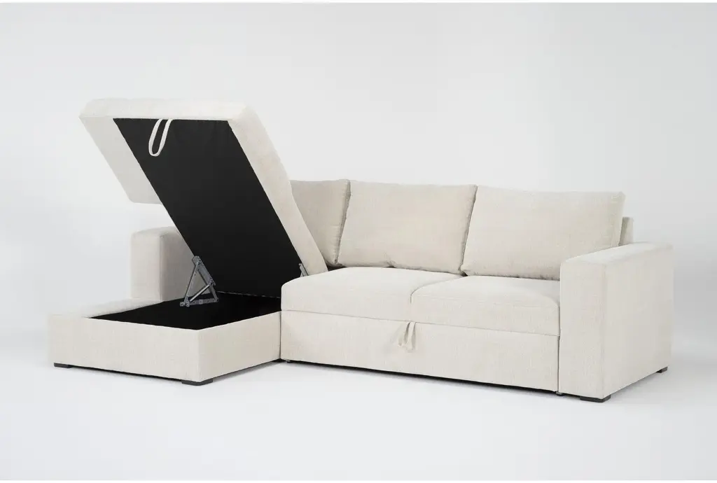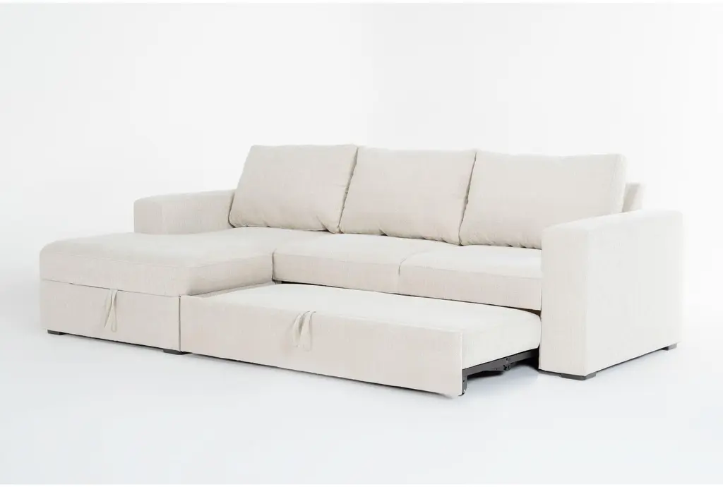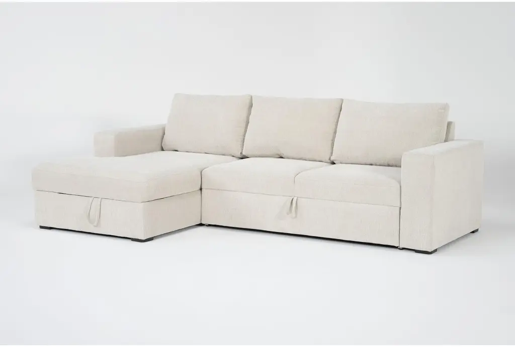 Sebastian Cream White Beige Fabric 111" 2 Piece Convertible Futon Sleeper Sectional With Left Arm Facing Storage Chaise | Track Arms