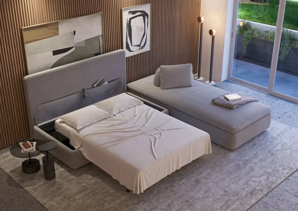 The innovative design concept, where function changes, suits everyday life with high-end aesthetics. Surprise comes in two different sizes both in the folding ottoman sleeper bed and in the fixed ottoman version.Technical featuresFrame: composite woods and multilayer woodPadding: polyurethane foam covered with heated bonded polyester fibreSeat cushion: polyurethane foam covered with heated bonded polyester fibre, hinged to the base. Wooden seat support with high resistance unidirectional elastic bandsFeet: black standardCover: fabric or leather cover. Fabric cover completely removableMechanism: lift the hinged seat and pull the mechanism out of the frontMechanism frame: highly resistant steel. Furnace painted with epoxy powders.Bed base: orthopedic, electro-welded bed springs. Seat base with elastic belts. Polyurethane foam mattress cm. 11x190