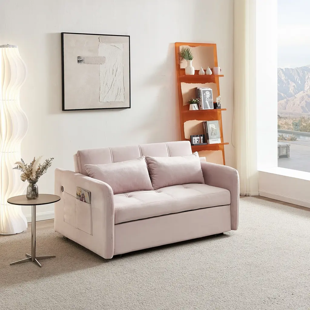 【Product Features】 ★MULTIFUNCTIONAL:It's a multifunctional sofa bed,just put the backrest of the sofa down and pull out the front part,it can be turned into a bed. ★EASY ASSEMBLY:All parts and tools are hidden in the bottom of the sofa bed. Just take it out of box and install the legs and casters, you will have a multifunctional sofa bed in minutes. ★COMFORTABLE SUPPORT:With high quality foam and spring support,plus soft and smooth velvet ,the sofa is comfortable,not too soft or too hard which is perfect to sit as well as to sleep on it. ★WITH USB: USB socket is added on the left arm(facing to sofa) so that it's very convenient to charge your mobile phone while you are sitting on the sofa to have a rest. ★PRODUCT DIMENSIONS:As a sofa dimension: 55.5"L x 37.4"W x 31.1"H. Unfold as a bed dimension:49''L×69''W×16.55''H. Weight:119.9lbs 【Description】 [Product Details] ★Product Type:Sofa bed ★Overall Dimension(As a sofa):W55.5"xD 37.4" x H31.1" ★Dimension As a Bed:W49"x D69" x H16.55" ★Overall Product Weight:119.9lbs ★Seating Capacity:2 ★Upholstery Material:Velvet ★Seat Cushion Fill Material:Foam+Polyester ★Back Cushion Fill Material:Foam+Polyester ★Frame Material:Solid Wood+Plywood+Metal ★Wood species:Eucalyptus ★Leg Material:Plastic ★Leg Color:Black ★Seat Construction:Sinuous Springs ★Foam Density:1.9lbs./cu.ft. ★Toss Pillows:Yes(two pillows) ★Removable Cushion Cover:No ★Reversible Cushions:No ★Storage:No ★Weight Capacity:500lbs ★Product Care:Wipe with fabric cleaner 【Keep it looking its best】 1.Fabric furniture Care;Dust regularly. Clean gently with a clean, slightly damp cloth. Professional cleaning is recommended. 2.Wood Furniture Care:We recommend dusting frequently with a clean, soft, dry, lint-free cloth. Clean the surface by rubbing in the direction of the grain and wipe dry. 3.Avoid direct sunlight. 4.Avoid the use of all chemicals, household cleaners, abrasives, or cleaners that contain lemon, vinegar, or other acids that may damage the finish. 5.Do not place hot appliances, such as curling irons and hot hair dryers directly on the countertop. 6.Spot clean using distilled water and water-based cleaning agents, foam or mild water-free cleaning solvents. 7.Always test a small inconspicuous area first. 8.Hardware may loosen over time; periodically check to make sure all connections are tight 【Notes】 1.Size Notice:Manual measurement has been used, there may be some reasonable errort, thanks for your understanding. 2.Color Notice:Due to factors such as display equipment and shooting environment, the color of the item may be slightly different from the picture, which is a normal phenomenon, please refer to the actual item 3.Assembly Notice:Please read assemble manual in advance. Please do not over-tighten nuts, as this may cause distortion or breakage. 4.It is recommended to put a layer of foam or soft cushion on the floor when installing to avoid scratching the floor. 5.If the item has any defects, damage or missing parts, please contact us with pictures or videos so that we can understand your needs and help you quickly, and always remember to retain its original packaging to ensure any return requests. We will try our best to solve any problems you may have. 6.If you receive the wrong product, please attach the product picture, the infographic of the outer package and the picture containing SKUs, so that we can verify and quickly deal with it for you
