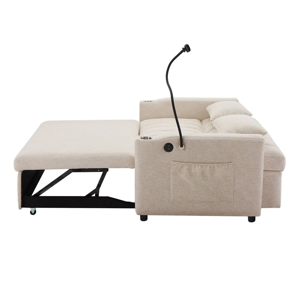 3 Level Adjustable Backrest - The convertible sofa bed features a backrest with 3 adjustable angles(108°/135°/180°) to suit your comfort needs, whether sitting, laying, or sleeping.Pull Out Sofa Bed-- This convertible sofa meets your various needs. So easy to make loveseat converts to bed. It can be easily converted into chaise lounge or a sleeper bed for small apartment, living room, studio, home office, etc.Three USB Ports - The USB ports stay connected while you relax on this sofa bed. Charge your devices conveniently within arm's reach, eliminating the need to get up and disrupting your relaxation. Keep your devices powered up as you enjoy your leisure time.Considerate Side Pockets - There are two storage pockets on the side of this sofa bed, which can accommodate your magazines, books, etc.Two Cup Holders - Having two built-in cup holders helps prevent spills, so you don't have any stains to worry about. Plus, you can keep your drink within reach as you enjoy your cozy movie nights or leisurely reading sessions.360°Swivel Phone Holder - This loveseat has a 360°swivel phone holder, which can free your hand, so you don't need to worry about getting tired of holding it for long periods of time, giving you the ultimate relax experience.Superior Material - Wrapped with soft Bella fabric, so you can indulge in exceptional comfort. Plus, the cushion is filled with high-density foam, providing ultimate comfort and support for you.