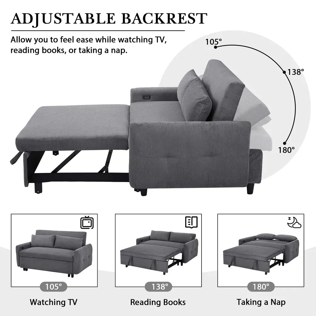 Product Details:Overall Dimension57.48" (L) * 36.61" (W) *32.28" (H)Detail DimensionPlease refer to the imagePackage Dimension47.44" (L) * 39.76" (W) *14.76" (H)Package Weight119.53(lb)Product Weight111(lb)Weight Capacity (Per Seat)500 lbsUpholstery MaterialCorduroy FabricFrame MaterialPlywoodSeat ConstructionPocket Spring+FoamLeg MaterialPlasticRemovable BackrestNoRemovable Backrest CoverNoRemovable CushionYesRemovable Cushion CoverNoSet IncludesSofa BedProduct CareDust regularly. Clean gently with a clean, slightly damp cloth. Professional cleaning is recommended. Avoid direct sunlight. Never apply or clean with harsh chemicals.Assembly RequiredAbout 30 MinutesNotesManual measurement has been used, there may be some reasonable error. All the pictures are taken by actual samples, slight chromatic aberration may occur due to lighting or display.Convertible Pull-out Sofa Bed - This sofa is equipped with a pull-out bed, which can be pulled out with 2 auxiliary hand straps and smooth wheels to easily and quickly convert the loveseat into a sleeping bed. It can be a comfortable sofa by day and a convenient fold-out bed by night, and it is an ideal lounger for hosting overnight guests and a perfect living room sofa for small space.3 Levels Adjustable Backrest - The adjustable backrest of the sleeper sofa can be converted to 3 different angles (105°/138 °/180°) which allows you to find the best comfortable posture. The reclining sofa bed meets your various needs. Nice for sitting, lying, and sleeping.Convenient USB Ports - USB Ports in the armrest provide easy access for your electronic devices. When your phone runs out of battery, you don't have to worry about playing games on the sofa.High-quality Material - In order to provide a comfortable and comprehensive using experience, this sofa bed is covered in Corduroy Fabric which makes the sofa more comfortable to touch. Moreover, the backrest and cushion on the seat are filled with spring package and high-density foam, which will offer you extra support and comfort.Excellent Weight Capacity - The high quality frame and legs make the loveseat sofa very stable and strong, allowing it to hold up to 500lbs of weight per seat, not easy to deform, allowing you to easily enjoy your time on the loveseat sofa.