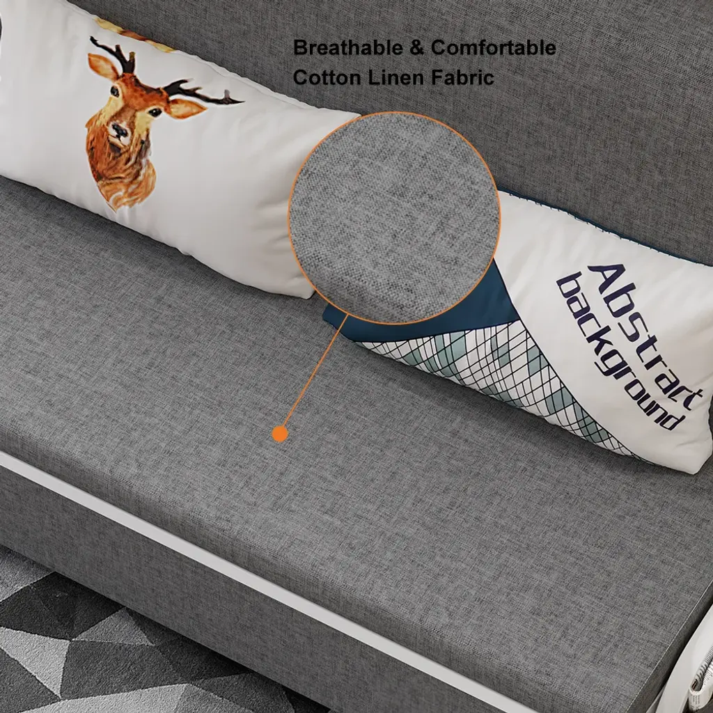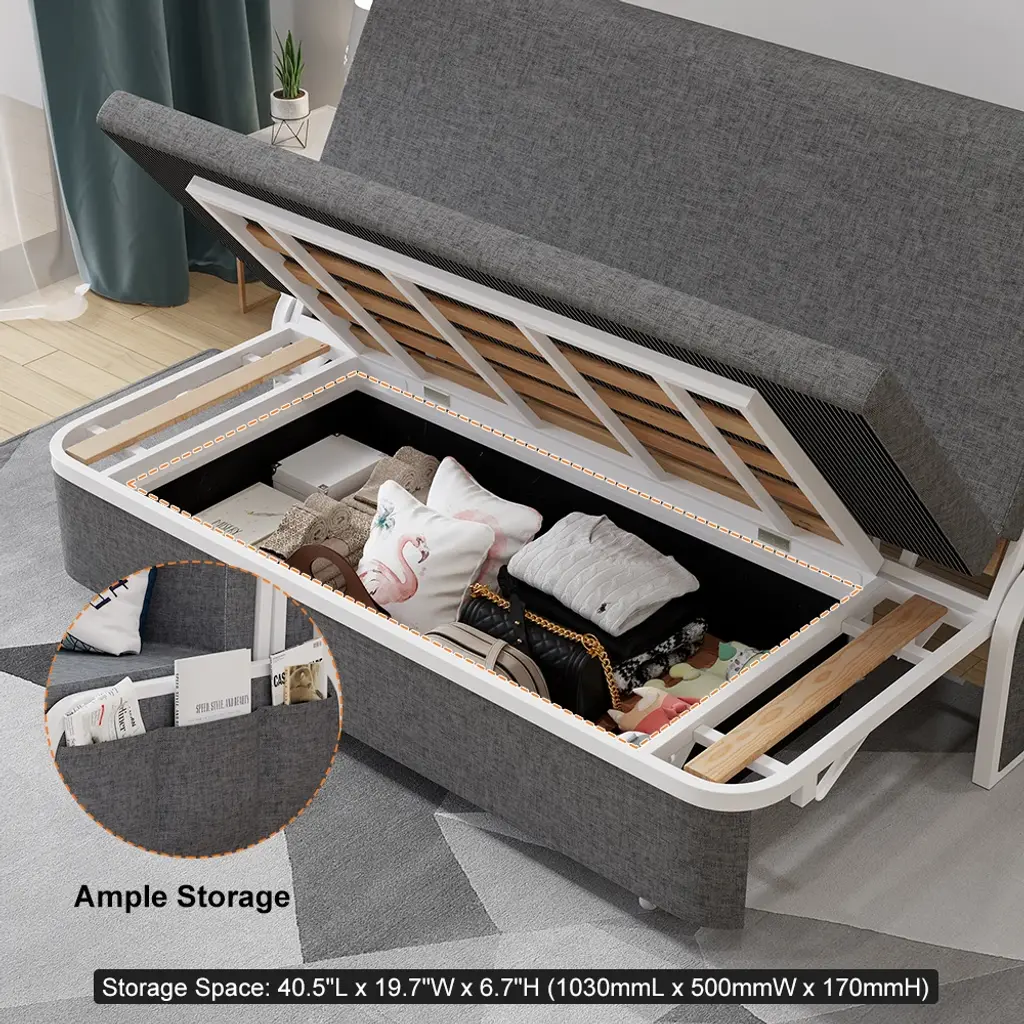 This sofa bed sleeper features plush cotton linen and converts into a comfy sleeping sofa with storage below. It includes high-quality foam upholstered in durable fabric. Multiple small but strong independent legs provide free and simple support, allowing you to adjust each to different degrees to suit various needs.