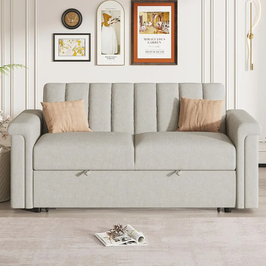 Transform your living space with this 61" modern convertible loveseat sleeper sofa, designed for both style and functionality. Featuring a pull-out bed and adjustable backrest, it easily transitions from a cozy sofa to a twin-sized bed. The sturdy wooden frame, high-density foam filler, and durable polyester fabric ensure lasting comfort and support. With thoughtfully designed dimensions, including a comfortable seat height and depth, this sofa is perfect for small spaces or guest rooms. Whether you're sitting, lounging, or sleeping, this sofa bed adapts to your needs with ease and elegance.Features:Specifications: