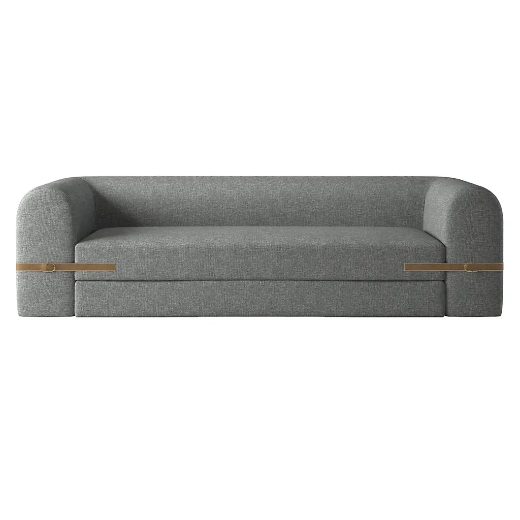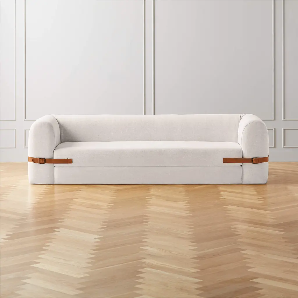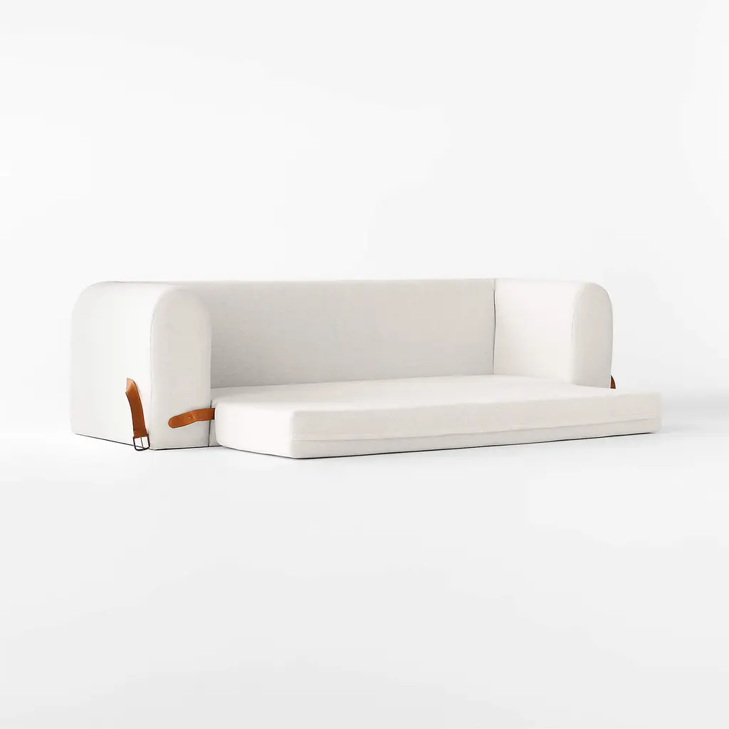 Leave it to Mermelada Estudio to bring a cool safari vibe to a fold-out sleeper sofa. One continuous swoop from arm to arm, sofa is wrapped in luxe white Crypton performance fabric that reads like chenille with a hint of linen. Leather straps wrap around from the side and buckle at the front. Unbuckle and the cushion folds out for a foam mattress that sleeps two. Learn more about Mermelada Estudio on our blog. CB2 exclusive.