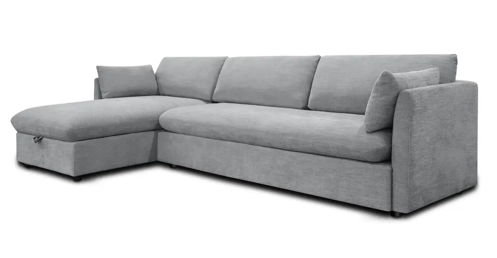 Crank up your comfort with this ultra-sleek sectional storage sleeper! Its spill-defying fabric, hotel-grade pull-out bed, and hidden chaise storage are designed to impress both you and your guests. With kiln-dried wood, Pirelli-supported cushions, and throw pillows, every sleepover becomes a five-star event in cozy, chic style.