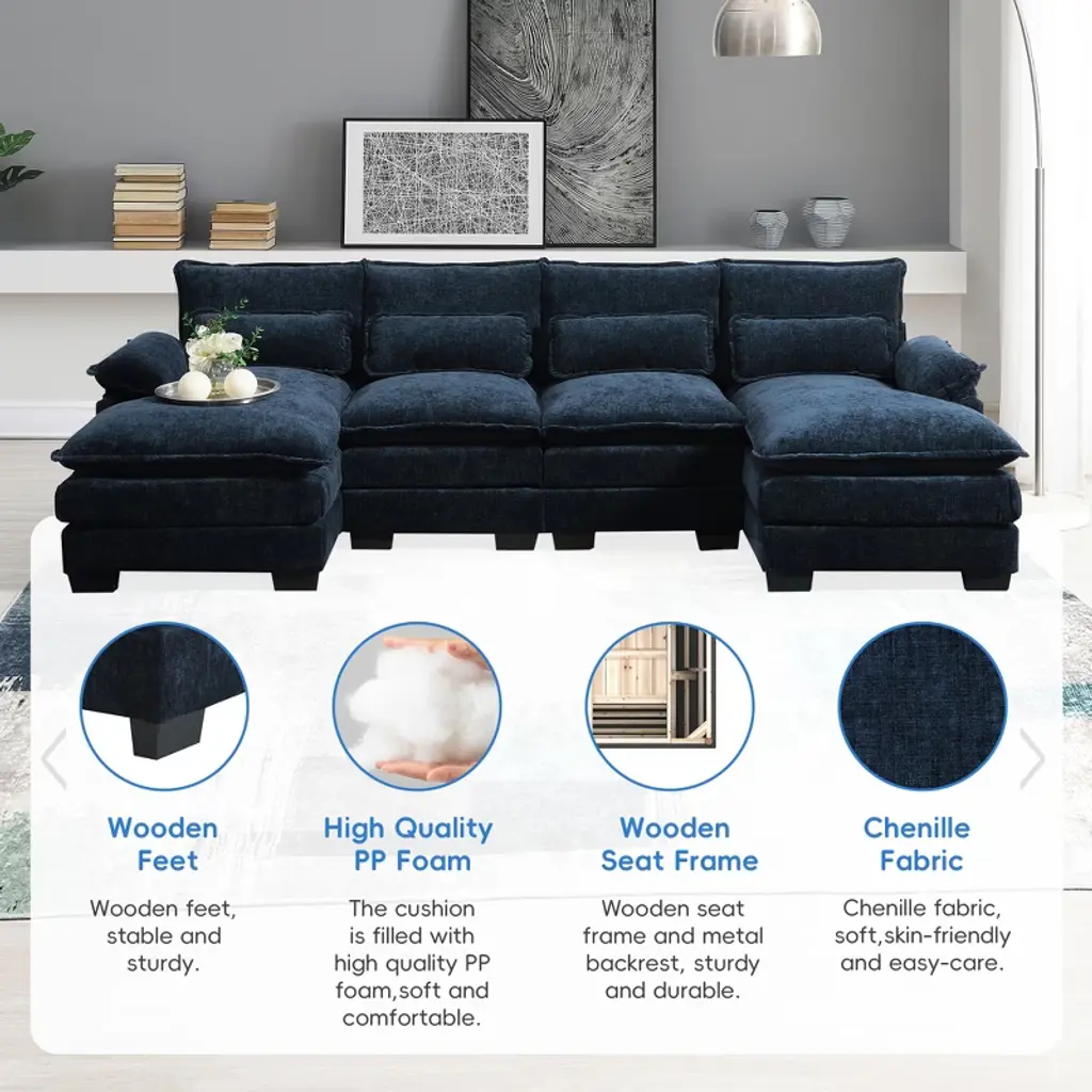 Atjafurn Modern Dark Blue U-shaped Sectional Sofa With Waist Pillows,6-seat Upholstered Symmetrical, Sleeper Sofa Couch With Chaise Lounge