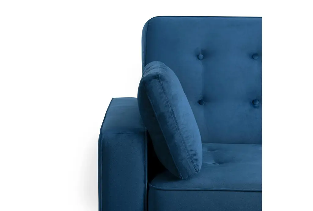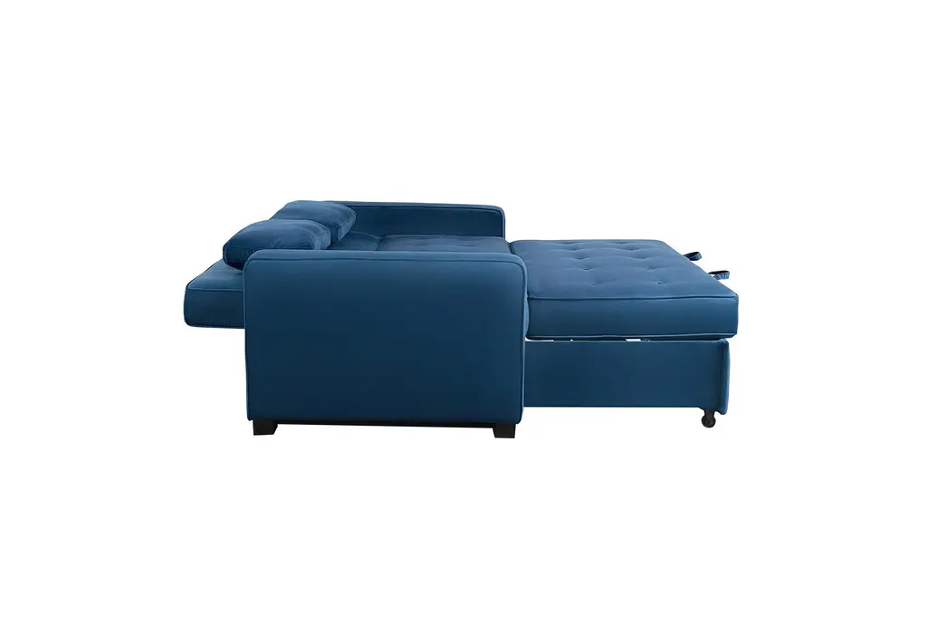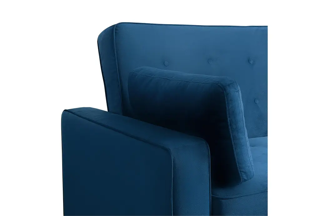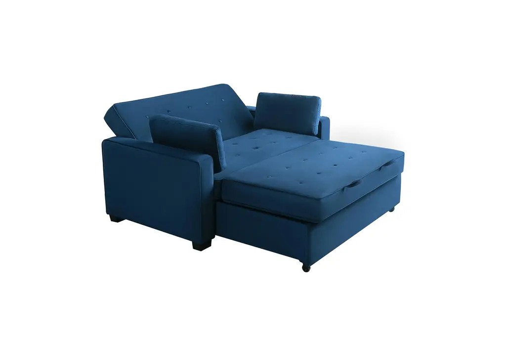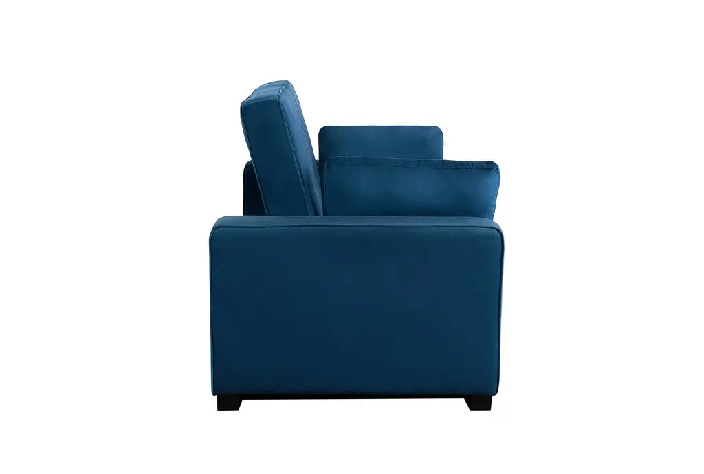 Experience the perfect blend of style and functionality with the Augustine Navy Blue Fabric 73" Queen Convertible Futon Sleeper Sofa Bed. This casual yet sophisticated piece is designed to seamlessly transition between a sofa, lounger, and bed, making it an ideal addition to any living space. Upholstered in 100% polyester fabric, it offers durability and comfort, while the fully upholstered side panels and included matching pillows add a touch of elegance.
