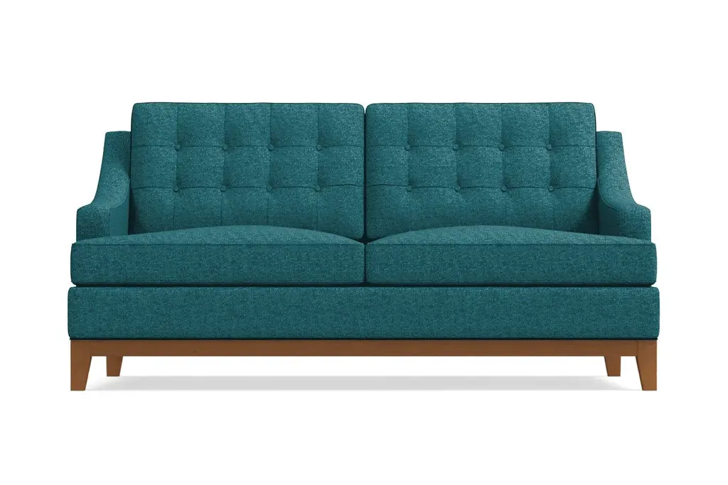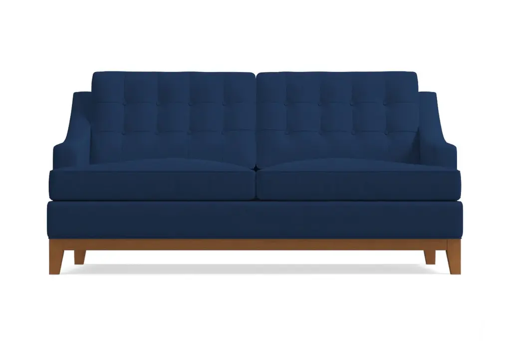 For plenty of posh style in a smaller space, go with the Bannister Apartment-Size Sleeper Sofa Bed from Apt2B Modern Furniture. Featuring an elegant look inspired by traditional designs, this small sleeper couch has a timeless appeal. Its hidden mattress can instantly transform any space into a guest room for overnight visitors, which is a game-changer for apartments and small homes. The Bannister Sleeper Sofa Bed has style to spare, but it also fits neatly into tighter spaces. It comes in at 69-inch length to help you find the ideal fit, whether you need seating in your studio apartment, your kids' playroom, your home office or your den. The Bannister Apartment-Size Sleeper Sofa Bed has a sophisticated design that infuses any living room, den or home office with an elevated aesthetic. It features curved arms and button-tufted back cushions, giving the couch just a hint of vintage glamour. Despite looking rather elegant, this couch is still incredibly inviting thanks to ultra-plush cushions and a lovely wood base that adds warmth and charm. Inside, a luxurious full-size mattress awaits your overnight visitors. There’s no need to deal with unreliable air mattresses that lack support and make your guests feel like an afterthought. Upgrading to this sofa with a bed is the best way to maximize your space while still creating a cozy and inviting spot for guests to stay. You'll also get to customize the color of the Bannister Apartment-Size Sleeper Sofa Bed to make it your own. Pick from our selection of gorgeous fabrics with a range of bold and neutral color options. You’ll also get to choose the finish for the wood base and legs. This innerspring pullout sofa is also available with two mattress types. Once you've selected the specs, your sofa is crafted right here in the USA. We even throw in a limited lifetime warranty to give you the full VIP treatment. Choose the Bannister to bring elegance to your home, along with the durability and comfort of an American-made sofa.
