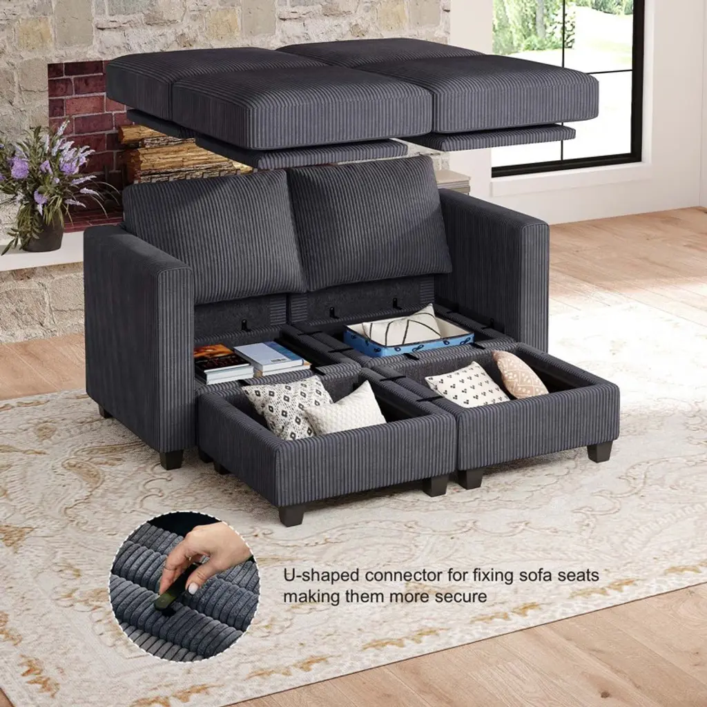 Crafted with premium pet-friendly corduroy fabric, this modular sofa combines neutral-toned elegance (beige/grey/green options) with customizable configurations for versatile living room layouts. Each piece features hidden storage compartments under seats/ottomans, high-density foam cushions, and a sturdy wood frame with coil spring support for lasting comfort. Easily reconfigure from sectional to sleeper sofa in minutes, with tool-free assembly and compact shipping (29.5x5.1x35.9 per module). Ideal for pet owners and space-conscious homes seeking adaptable, easy-clean furniture.