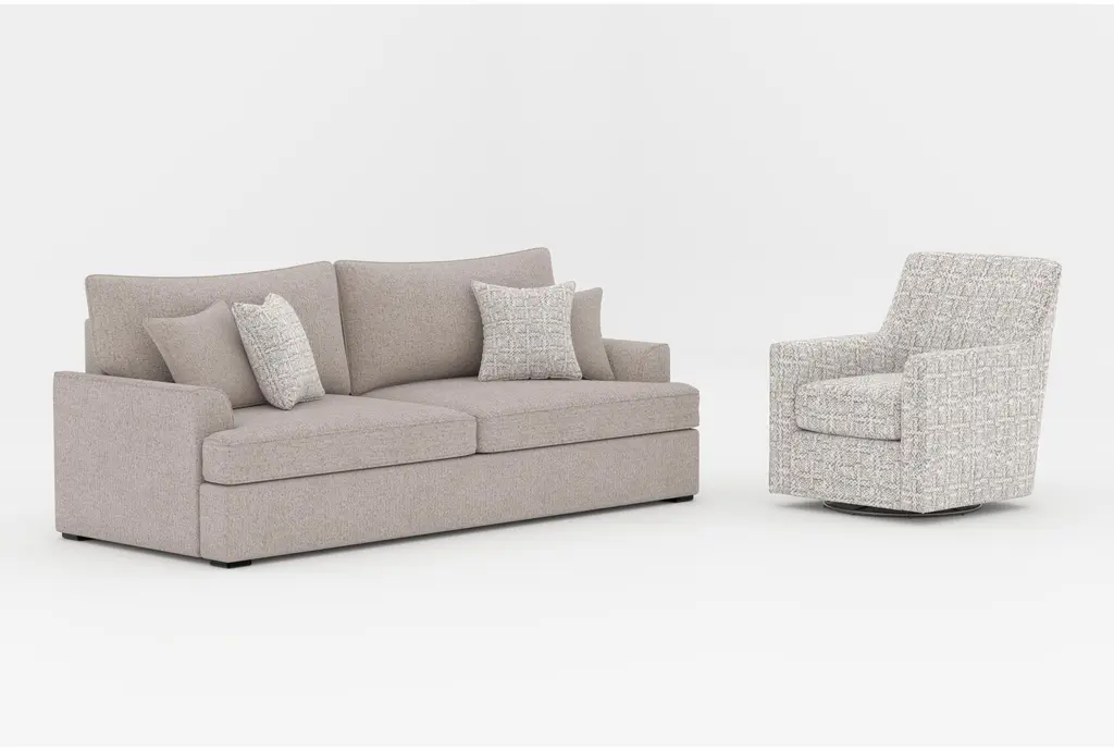 Introducing the Belinha II Opal White Fabric 95" Queen Memory Foam Sleeper Sofa Bed and the Belinha II Oyster Beige Grey Fabric Swivel Glider Accent Arm Chair. This casual set is perfect for your living room, offering both comfort and style. The cream-colored fabric is made from 100% polyester, ensuring durability and a soft touch.