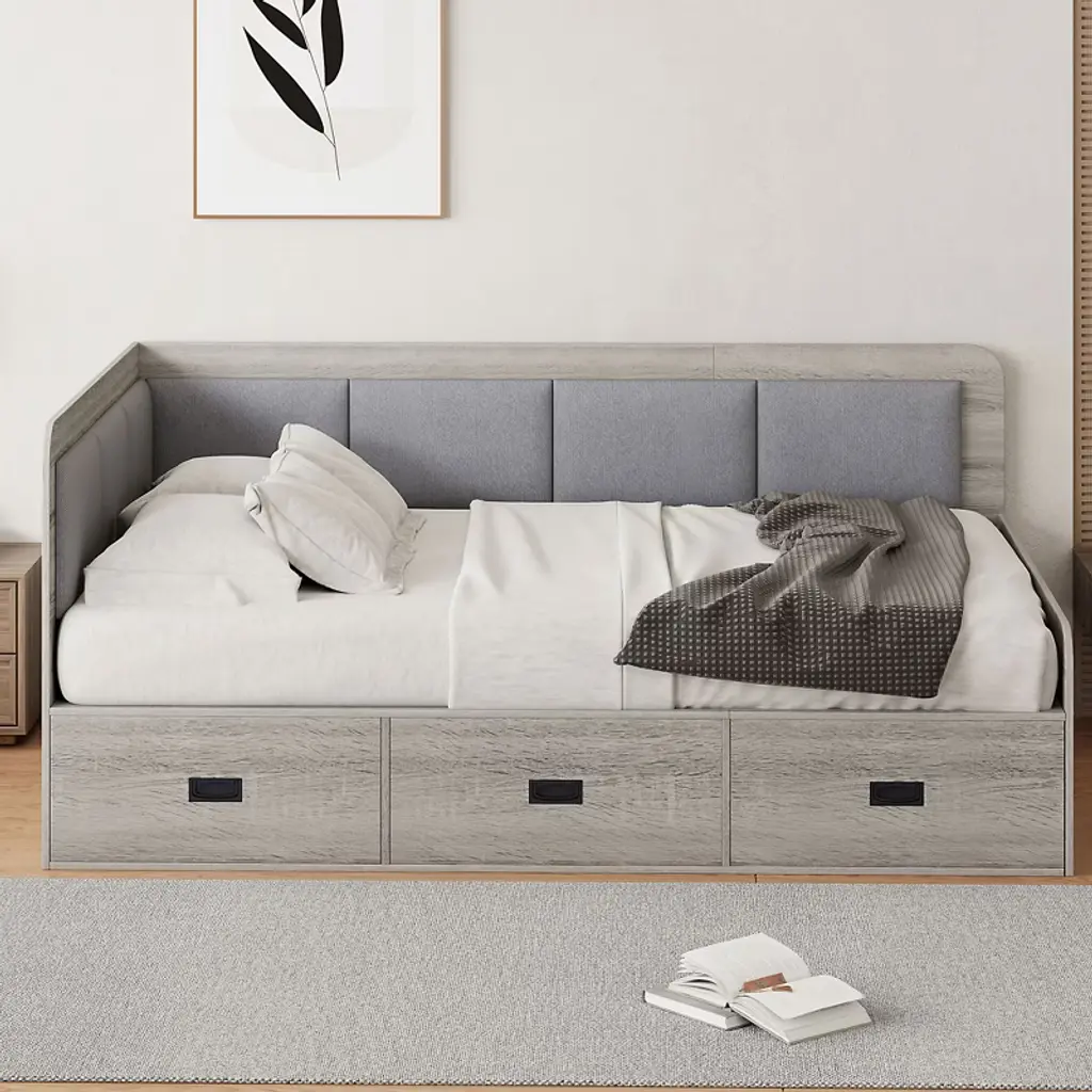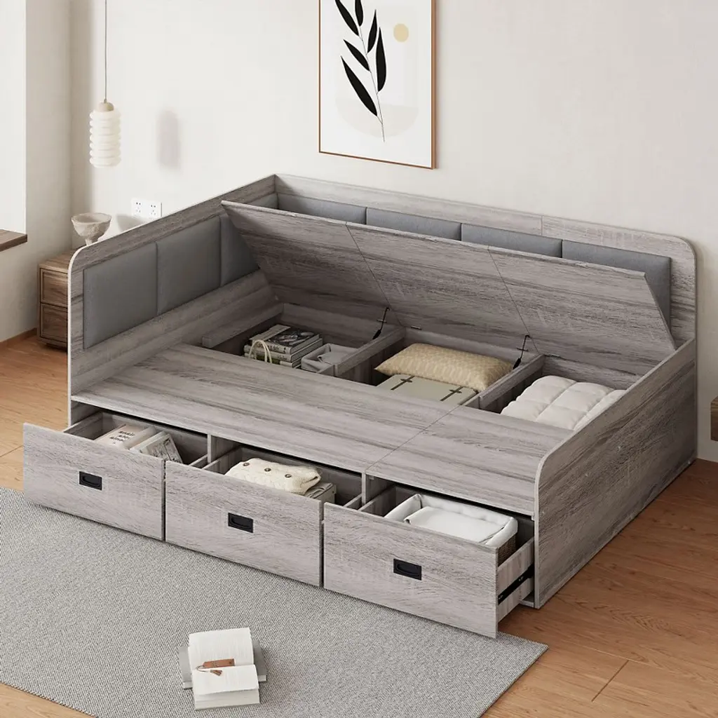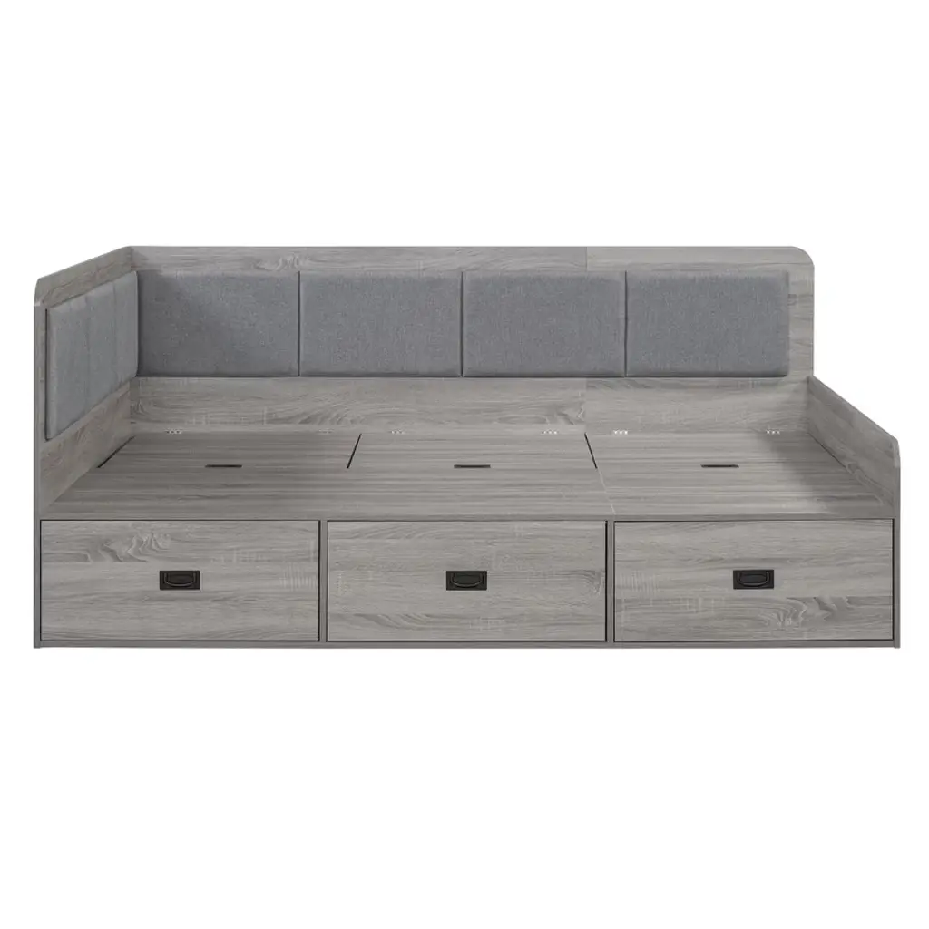 Introducing our versatile “L” shaped daybed: stylish and practical with ample storage, including three drawers and three open compartments. It easily converts between a sofa and a bed, fitting any décor with its classic design. The plush upholstered backrest adds extra comfort for lounging or sleeping.
