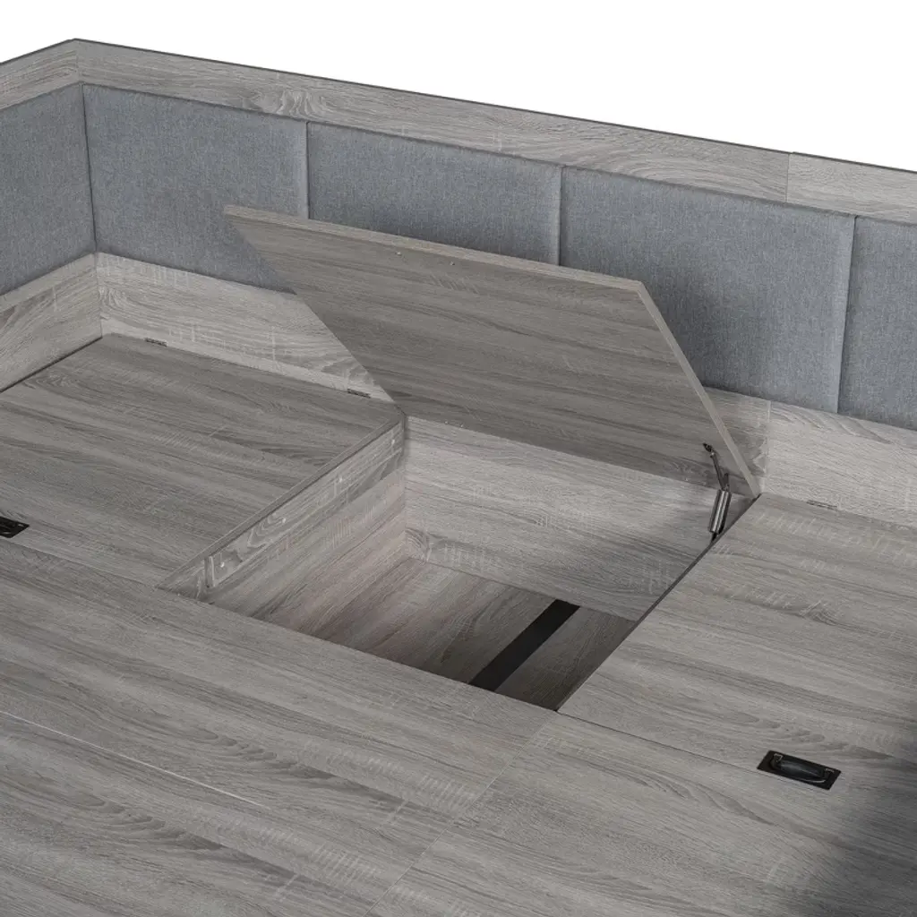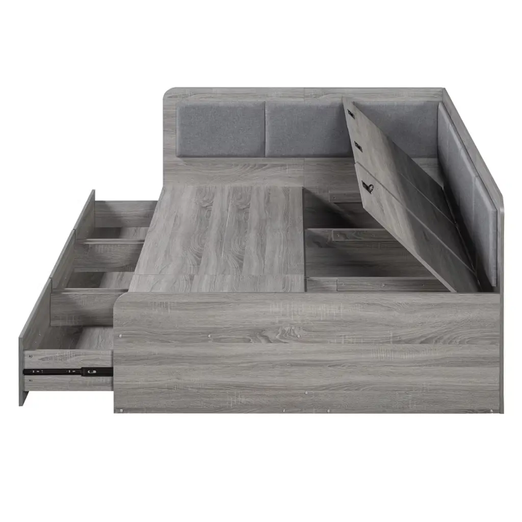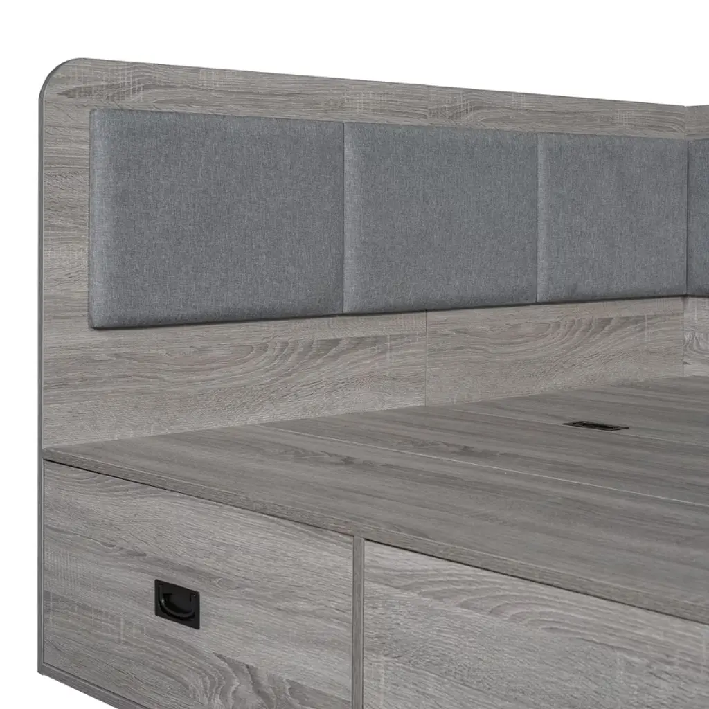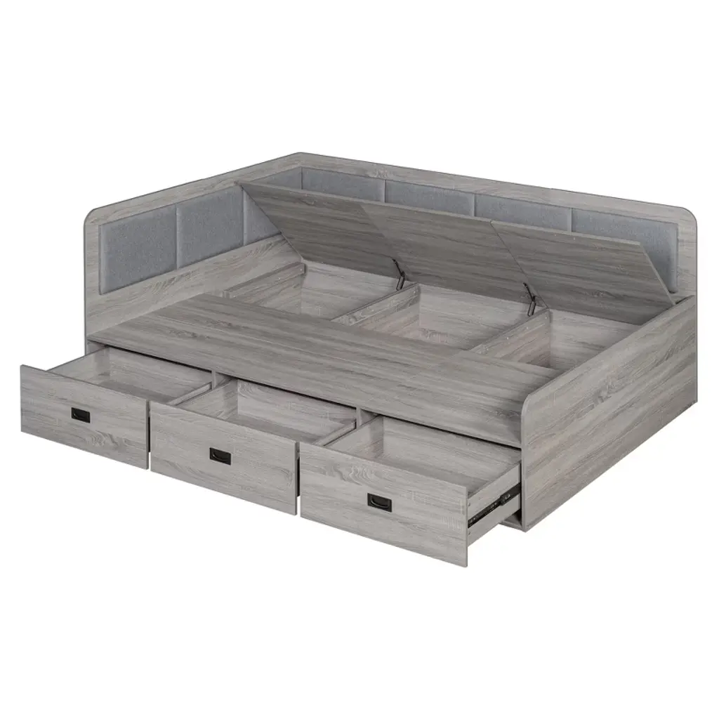 Introducing our versatile “L” shaped daybed: stylish and practical with ample storage, including three drawers and three open compartments. It easily converts between a sofa and a bed, fitting any décor with its classic design. The plush upholstered backrest adds extra comfort for lounging or sleeping.
