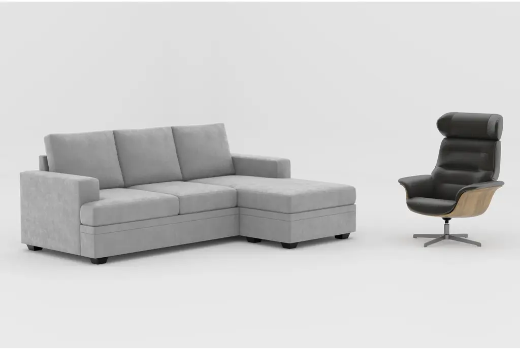 Experience ultimate comfort and style with the Bonaterra Dove Grey Fabric 97" Queen Memory Foam Sleeper Sofa Bed with Reversible Chaise and the Amala Dark Grey Leather Reclining Swivel Arm Chair with Adjustable Headrest. The sofa bed features a reversible chaise, track arms, and tapered legs, making it perfect for any living room setting. The recliner is designed for relaxation with its swivel base and adjustable headrest.