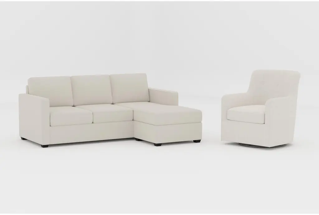 Transform your living room with the Bonaterra Sand Beige Fabric 97" Queen Memory Foam Sleeper Sofa Bed with Reversible Chaise & Bonaterra Sand Beige Natural Fabric Swivel Glider Arm Chair. Designed in a casual style, this versatile set offers both comfort and functionality. The queen-sized memory foam sleeper provides a cozy bed for guests, while the reversible chaise allows for flexible seating arrangements.