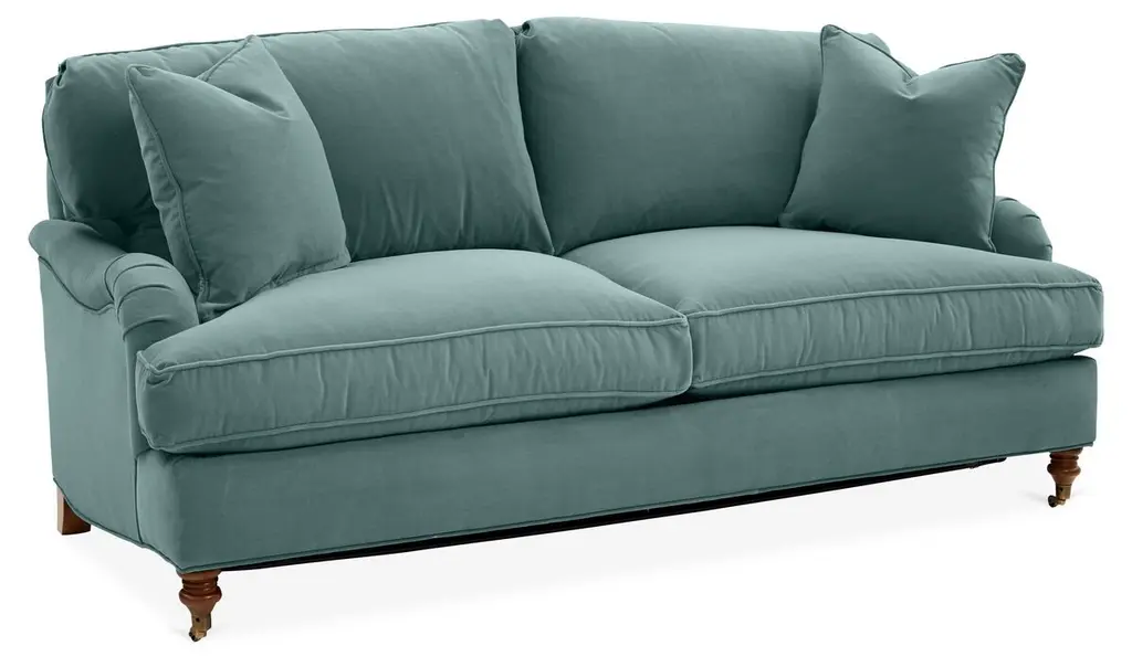Available only at One Kings Lane: This queen-size sleeper sofa is framed in kiln-dried hardwood with classic English arms and an ample feather-and-down fill. We love the versatility of this sofa's neutral upholstery and herringbone texture, while caster wheels allow for easy mobility and protect floors against scratching and marring. Two matching throw pillows are included. Handcrafted in the USA.