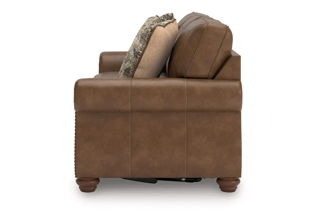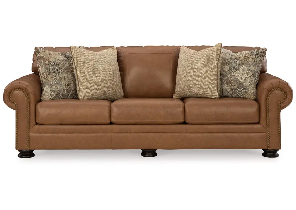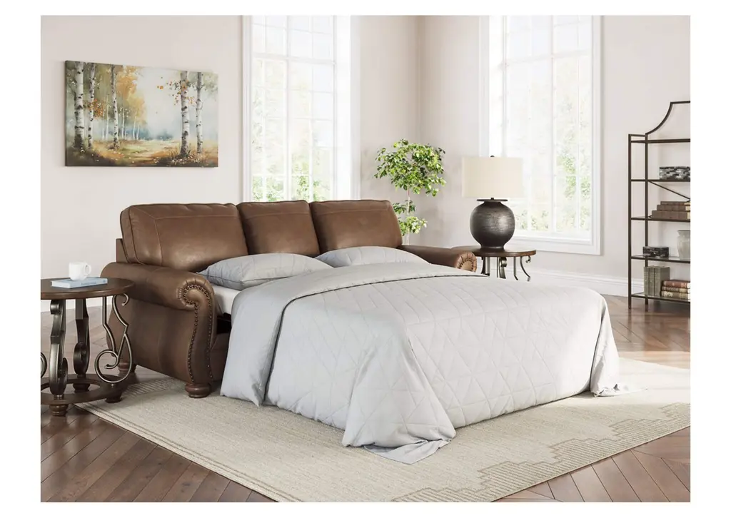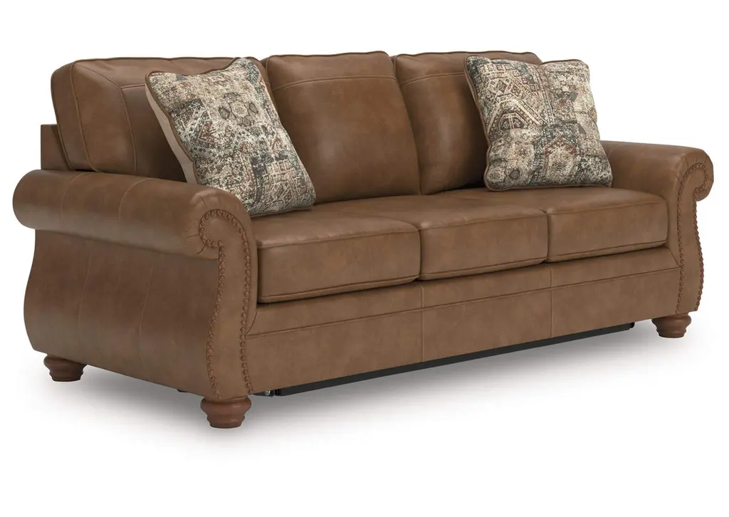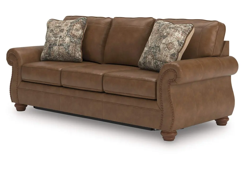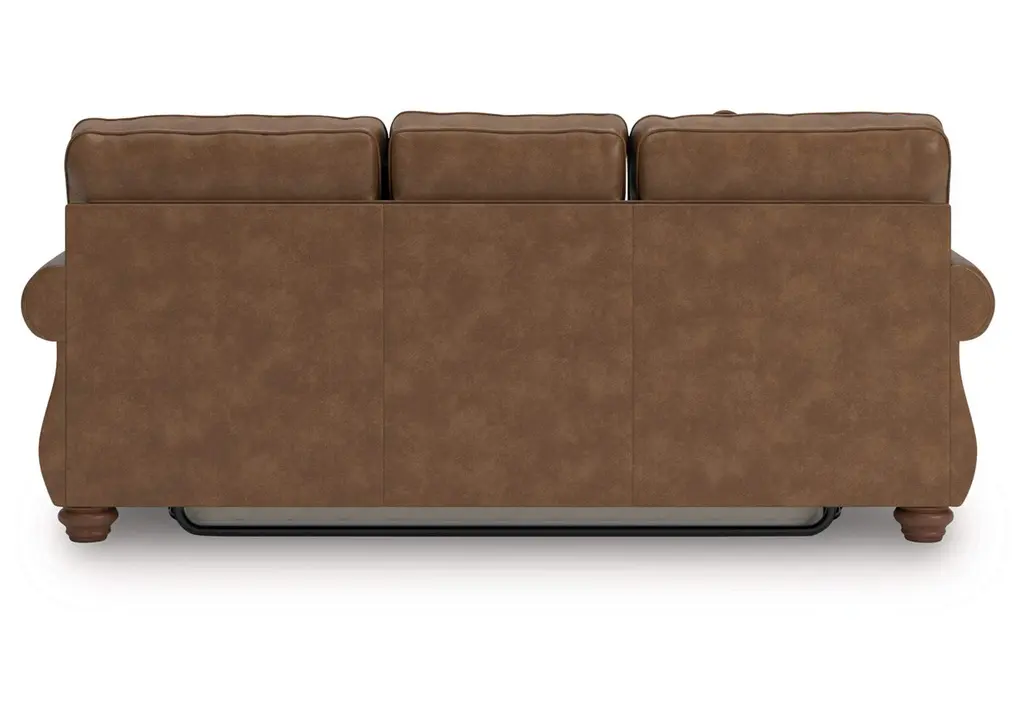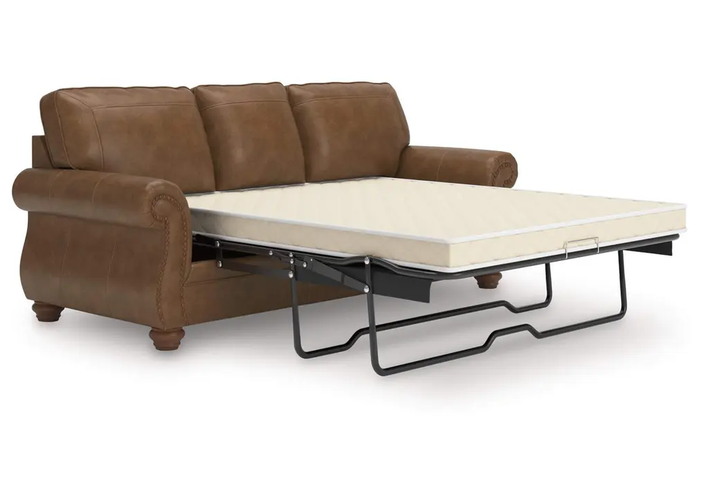 Everyone can have the best rest in the house with this queen sofa sleeper. Its nailhead trim puts the finishing touches on the traditional roll arms you love. The sofa's comfy, durable cushions—wrapped in a rustic yet sophisticated faux leather—keep you feeling relaxed, while its turned legs show that style and quality flow from top to bottom. A pull-out queen mattress made with quality memory foam comfortably accommodates overnight guests. Weight 212.000 lbs. (95.4kgs.)
