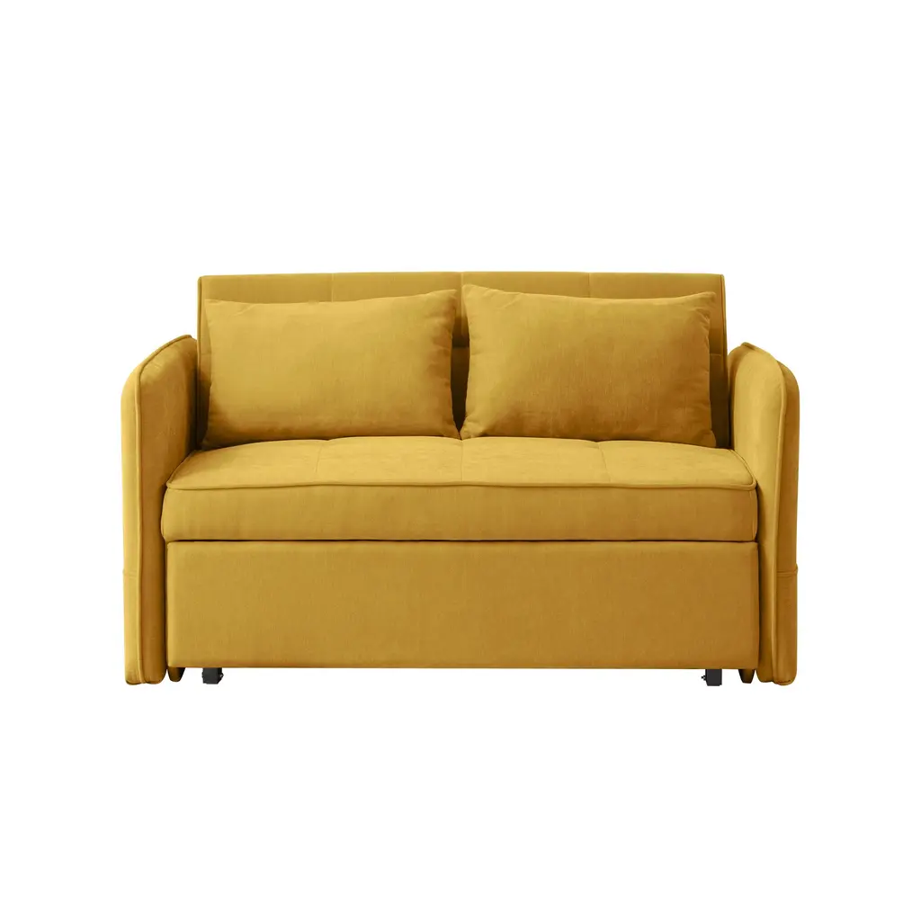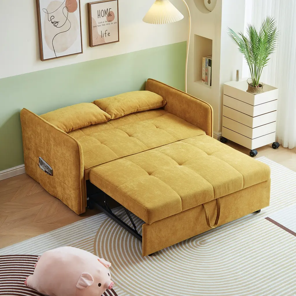 Chenille Fabric Loveseat With Pull-Out Sofa Bed, Sleeper Loveseat, Chaise Longue Sofa With Adjustable Armrests And Side Pockets - Yellow