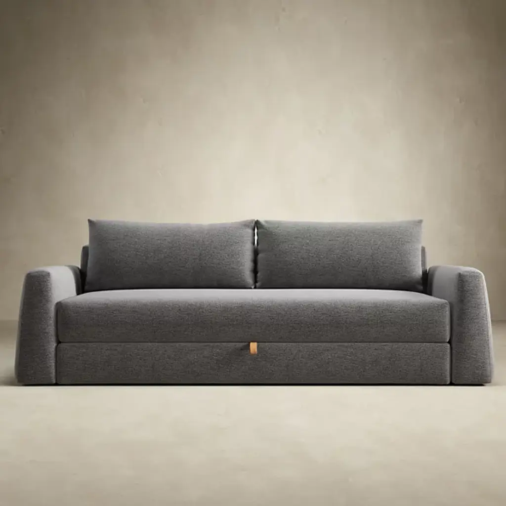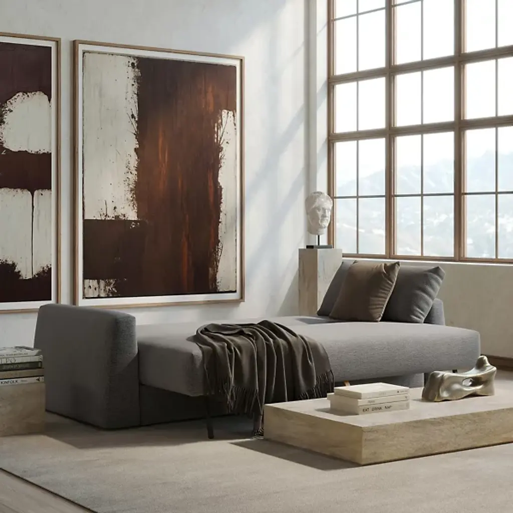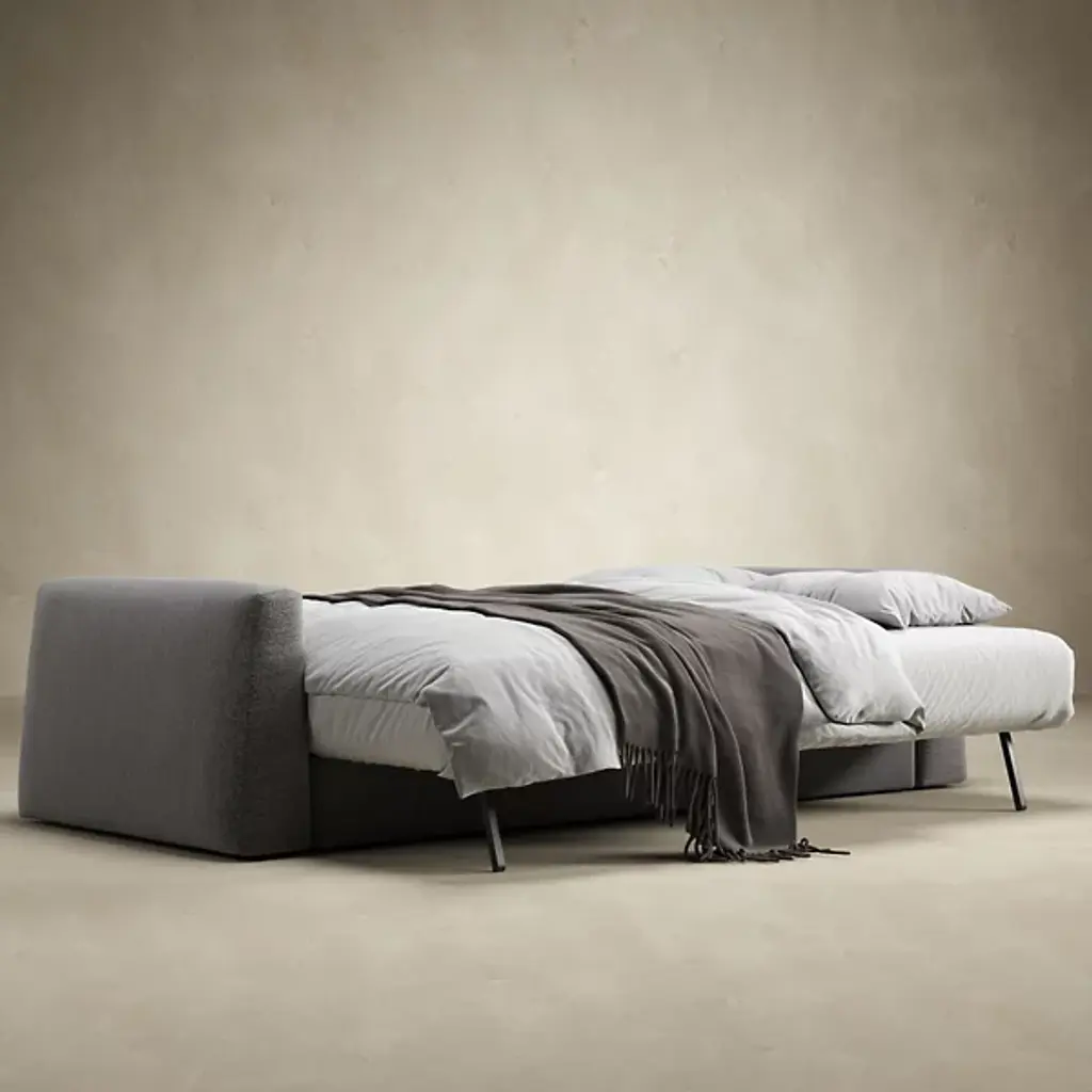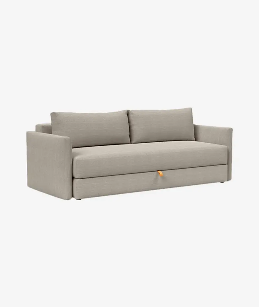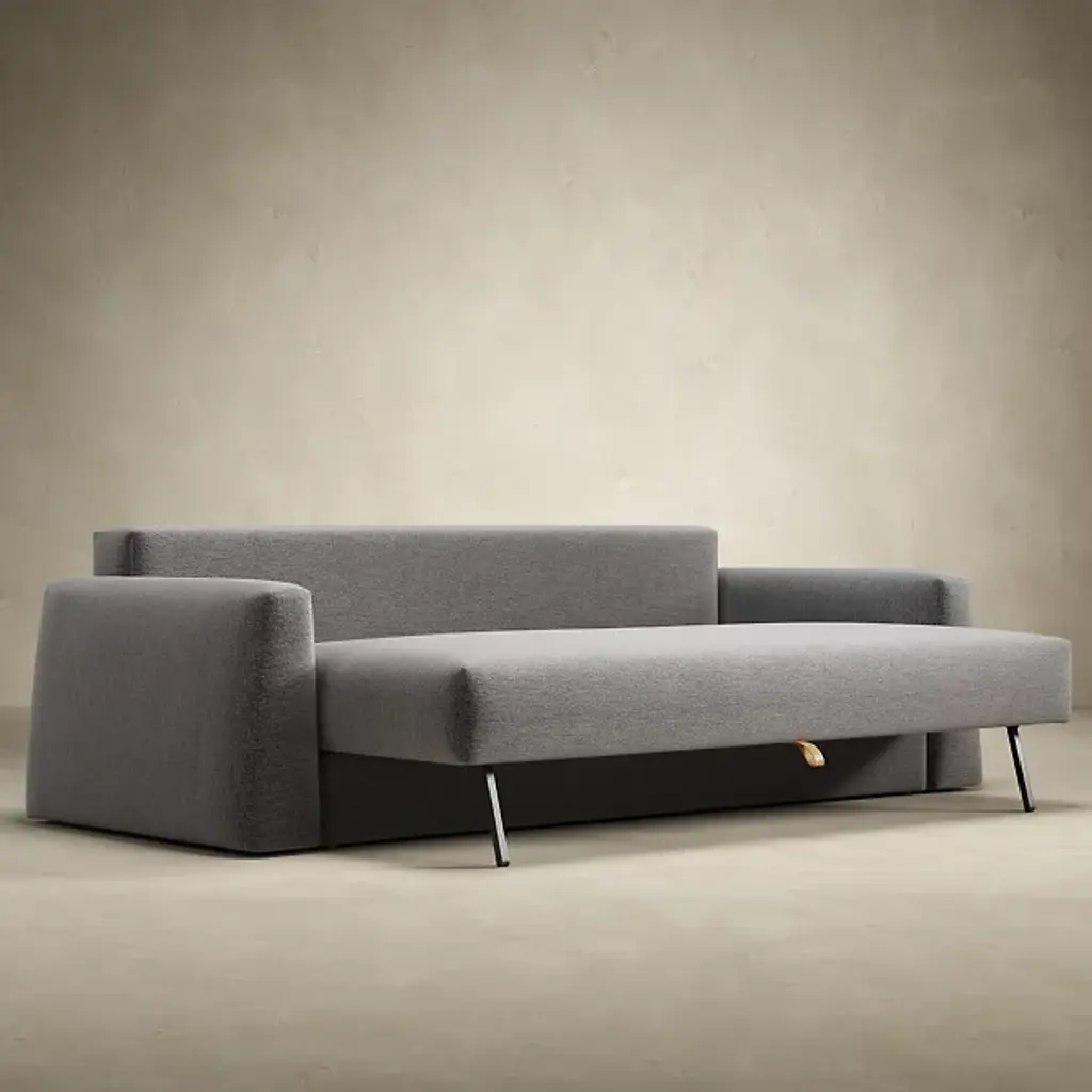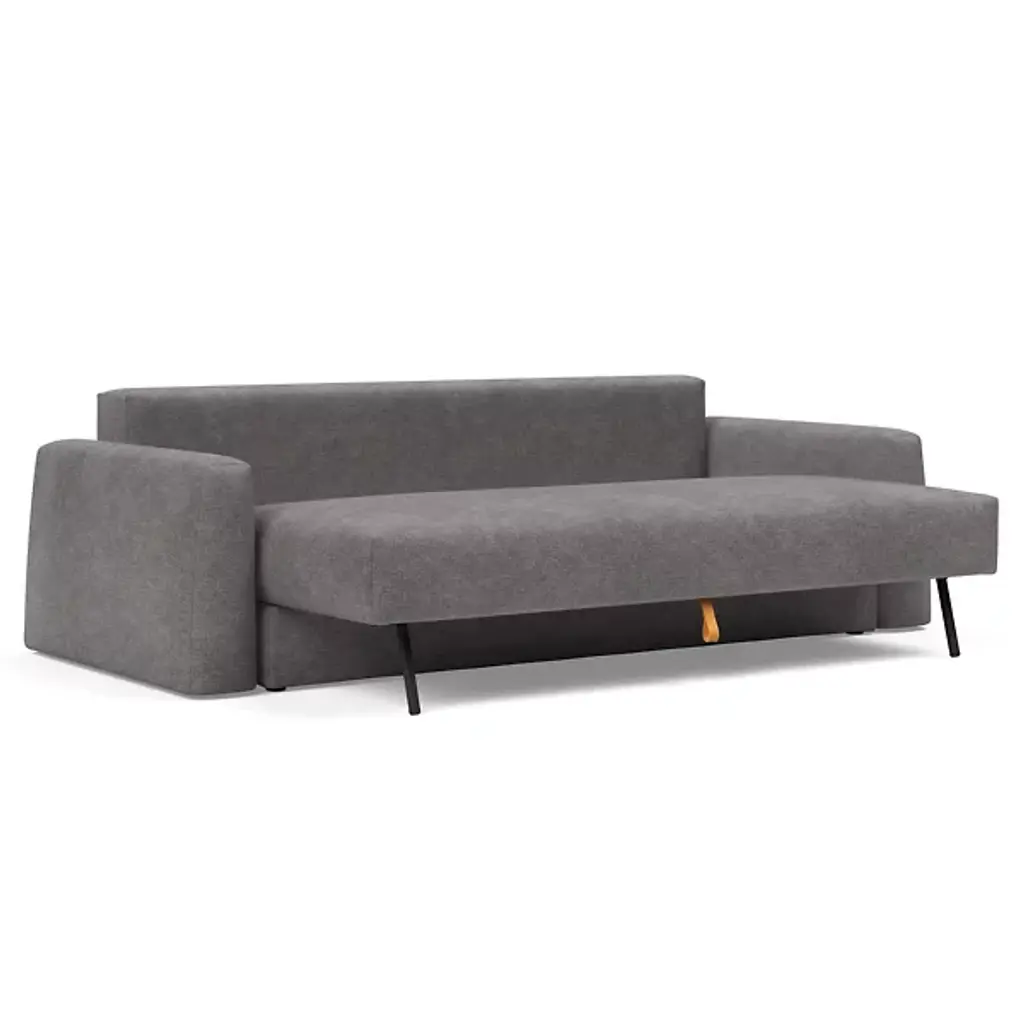 The Cone Sofa Bed from Innovation Living combines comfort and space-saving storage in a single clever design. Designed by Per Weiss and made in Denmark, this soft, broad sleeper sofa conceals a roomy storage compartment beneath the seat and reveals it as it folds out. It easily shifts from a three-seat sofa to a full-size bed, showing off a slim, strong matte steel frame. A cushioned seat and back incorporate pocket springs wrapped in plush foam, adding comfort sheathed in a soft polyester blend.