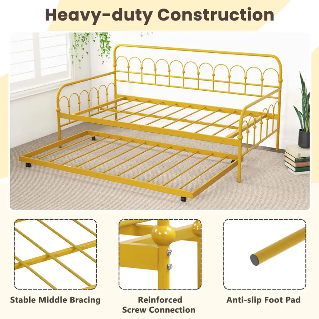 Don’t want the hassle of reorganizing another bed? Introducing the daybed and trundle combo! Crafted with sturdy metal tube, this sofa bed is highly stable with 330 lbs of weight. In addition, the stable middle bracing and reinforced screw connection ensure a sturdy and secure support system. Moreover, the 2-in-1 design offers extra sleeping space with its convenient pull-out trundle bed design. Apart from that, equipped with 2 lockable universal wheels, it is easy to move and position, the anti-slip foot pads provide added safety and stability. Suitable for various scenarios, this sofa bed is perfect for your living room, bedroom, or guest room. Upgrade your space with this versatile and comfortable double-layer sofa pull-out bed.FeaturesNo box spring needed Features anti-slip foot pad for added stability Effortlessly move the bed around and lock it in place with two lockable universal wheels Easily expand the trundle bed for quick and effortless accommodation of guests Benefit from a strong and reliable bed frame with reinforced screw connections Suitable for various scenarios such as living rooms, bedrooms, and guest room Perfect for accommodating overnight guests and maximizing space utilization. Color: Golden Material: Metal Item weight: 57 lbs Overall Dimension of Frame: 78.5'' x 39'' x 38'' (L x W x H) Overall Dimension of Trundle: 71'' x 39'' x 4.5'' (L x W x H) Load Capacity of Frame: 330 lbs Load Capacity of Trundle: 220 lbs Recommended Mattress Thickness: 3''- 5'' Package includes: 1 X Bed Frame 1 X Trundle 1 X Guide Book