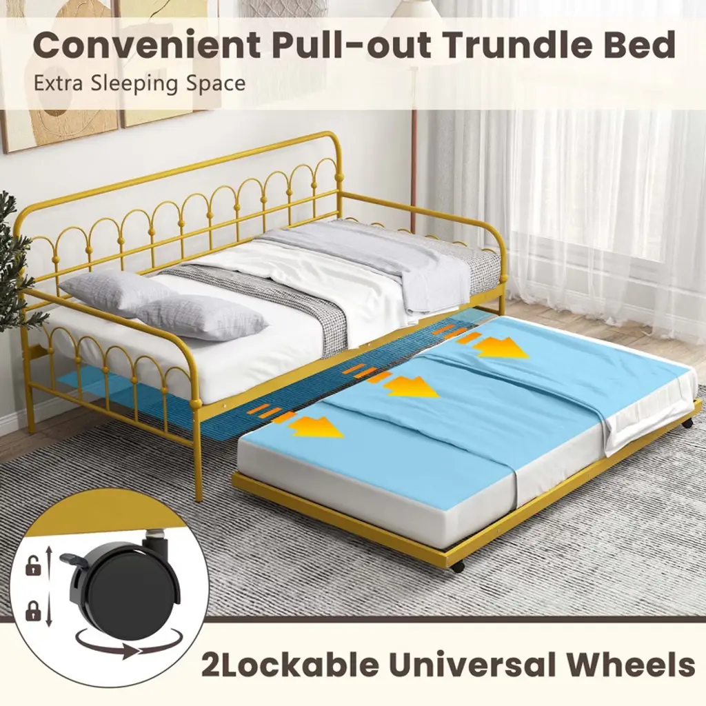 Costway Twin Size Metal Daybed With Trundle Space-saving Sofa Bed Lockable Wheels Gold