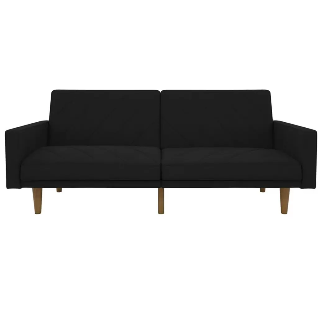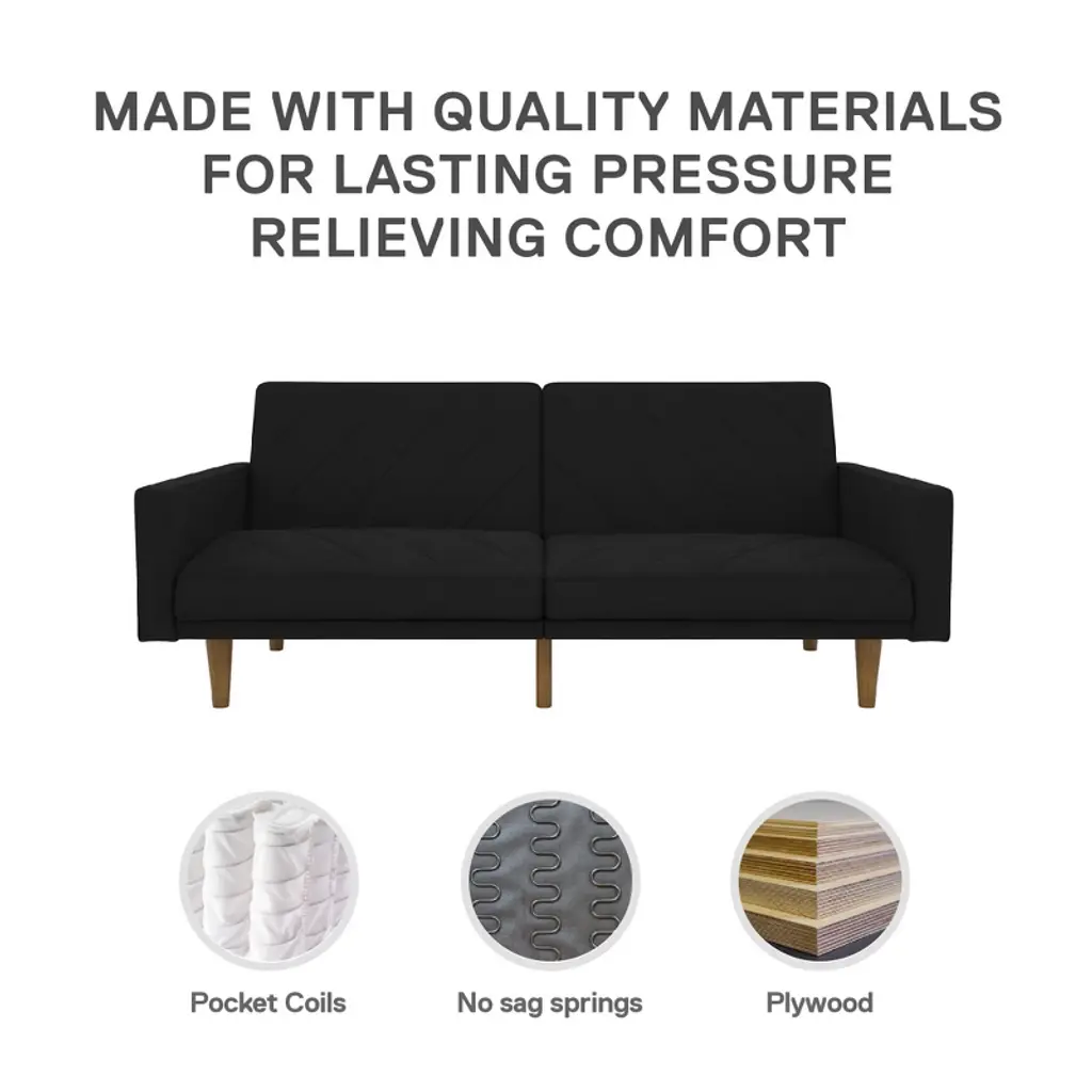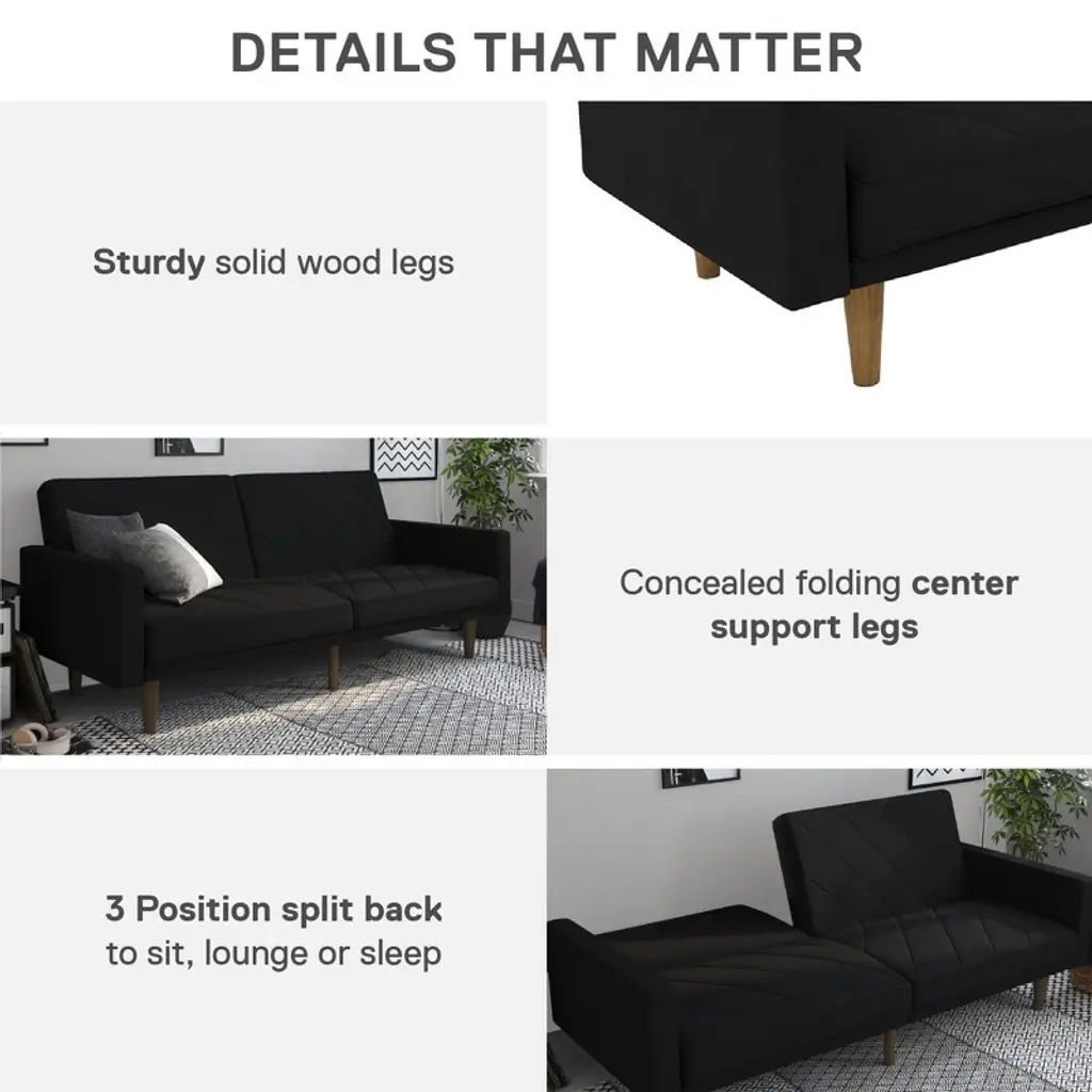New trends in furniture design are bringing back the days of bold lines, low-profile shapes and wood accents. The Paxson Futon combines all three for a look that will add a little modern retro to your home! Choose from a variety of finishes with intricate diagonal stitching--a real mid-century must-have. The rounded solid wood legs add a touch of warmth and offer plenty of extra support. Plus the split back design of this sleeper sofa is made to offer each guest their own level of comfort, from sitting up to lounging back. Or lay flat both seat back cushions to create a comfortable place for overnight guests to sleep. The Paxson is ideal for small spaces while always making a big, bold statement. We've also included padding under the feet so your floors will always look great!