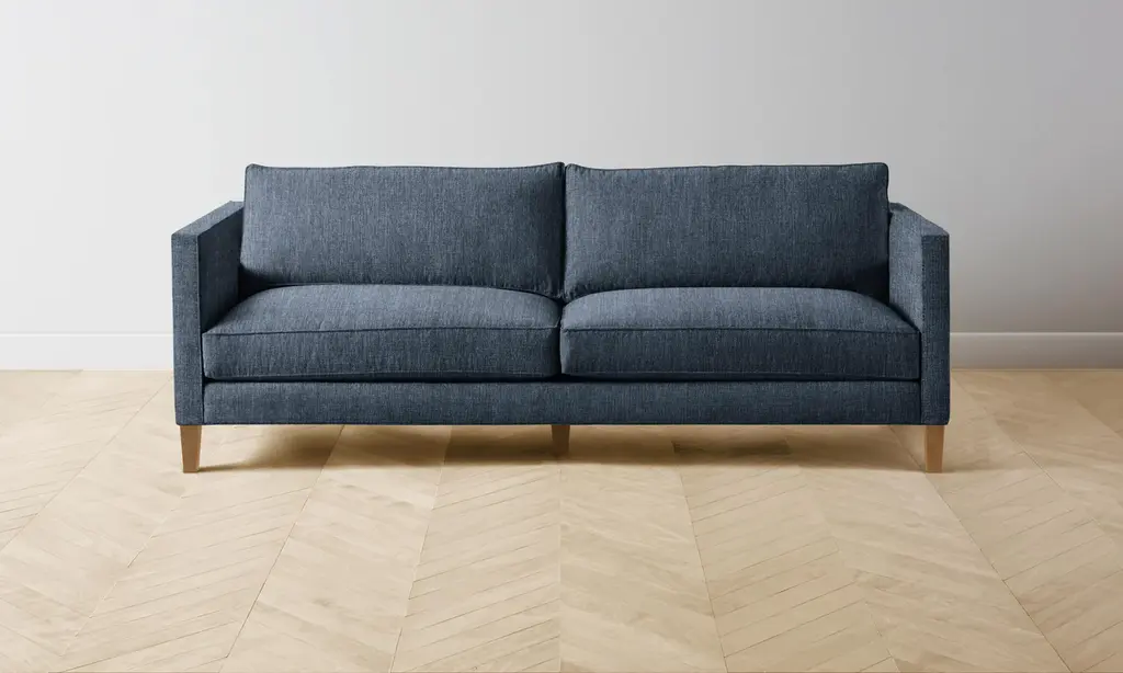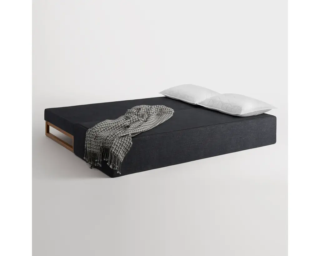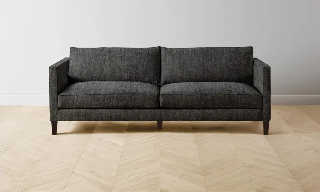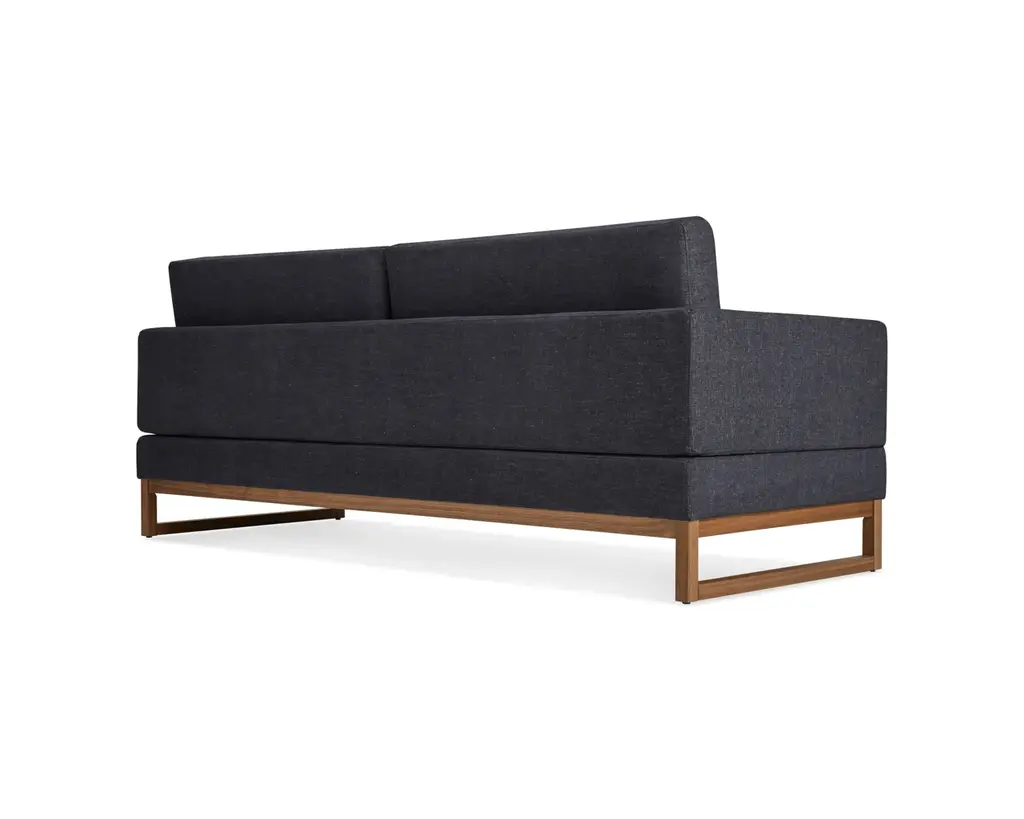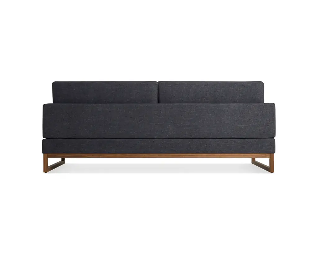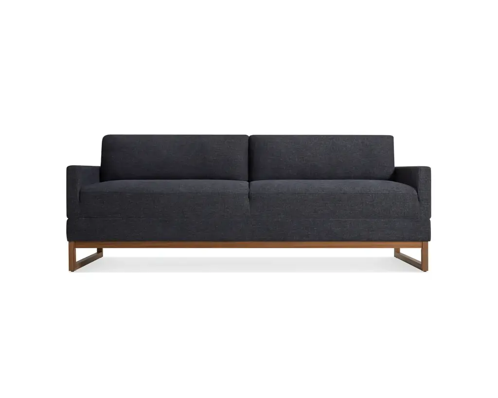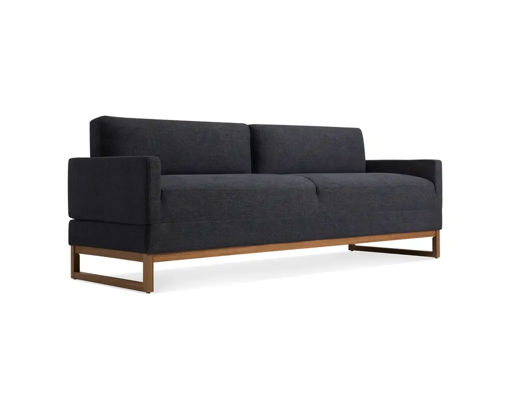 Sofa by day, peacekeeper by night. This warm and inviting sofa flips forward to become a queen-sized sleeper at a moment's notice. Walnut legs coordinate thoughtfully with your choice of siz fabrics: coal, cocoa, olive, Packwood Charcoal, Packwood Grey, or pebble.