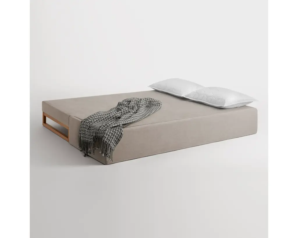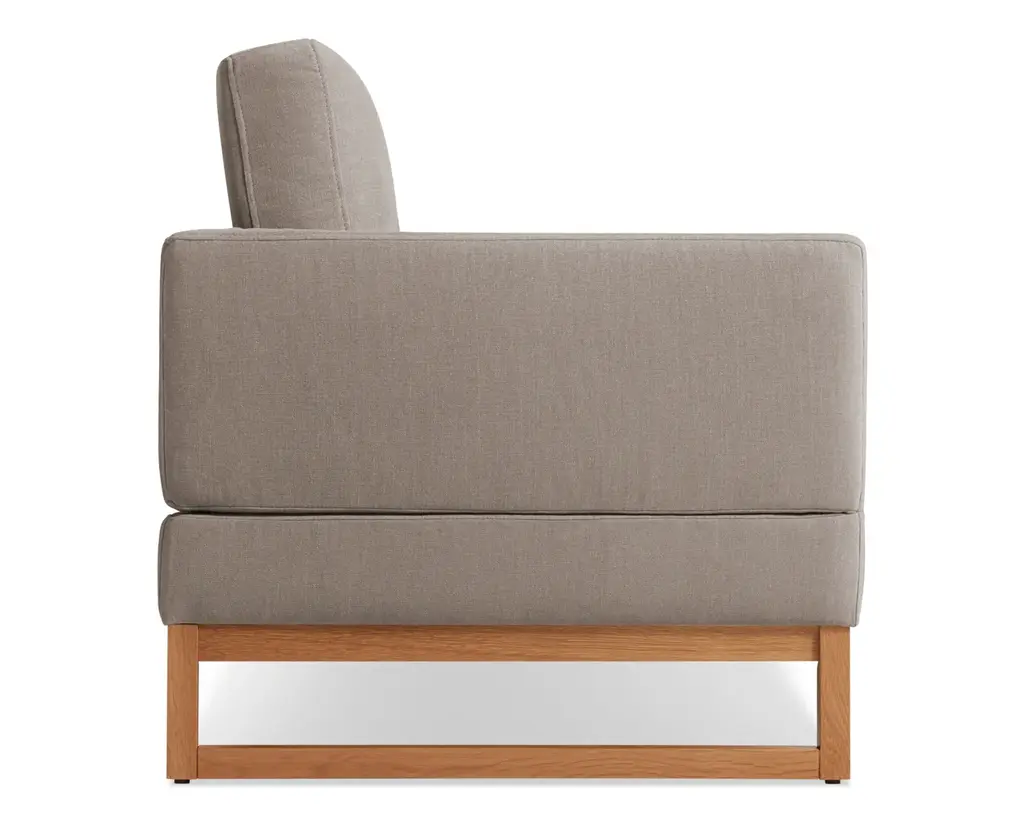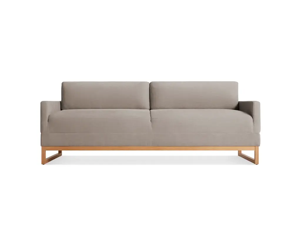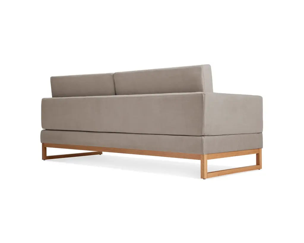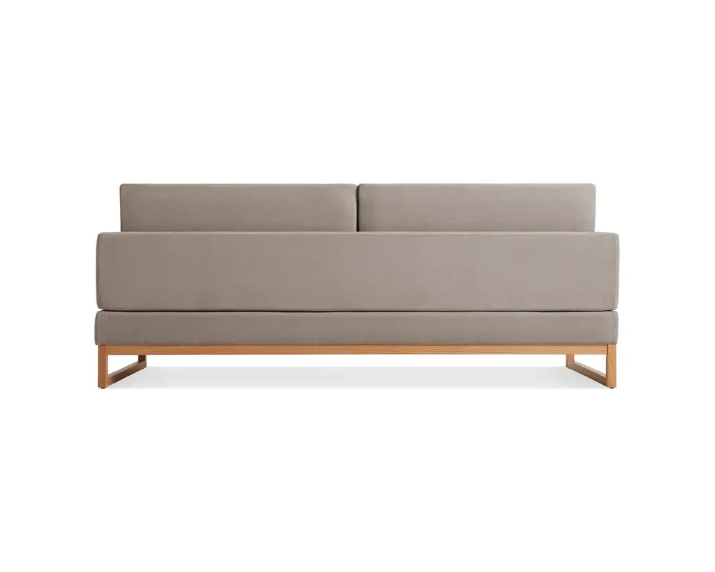 Sofa by day, peacekeeper by night. This warm and inviting sofa flips forward to become a queen-sized sleeper at a moment's notice. Walnut legs coordinate thoughtfully with your choice of siz fabrics: coal, cocoa, olive, Packwood Charcoal, Packwood Grey, or pebble.